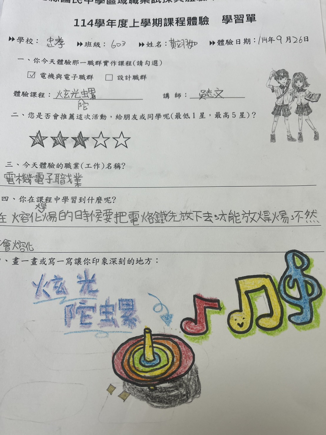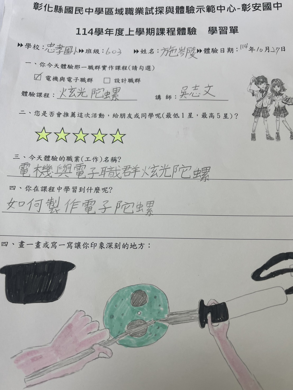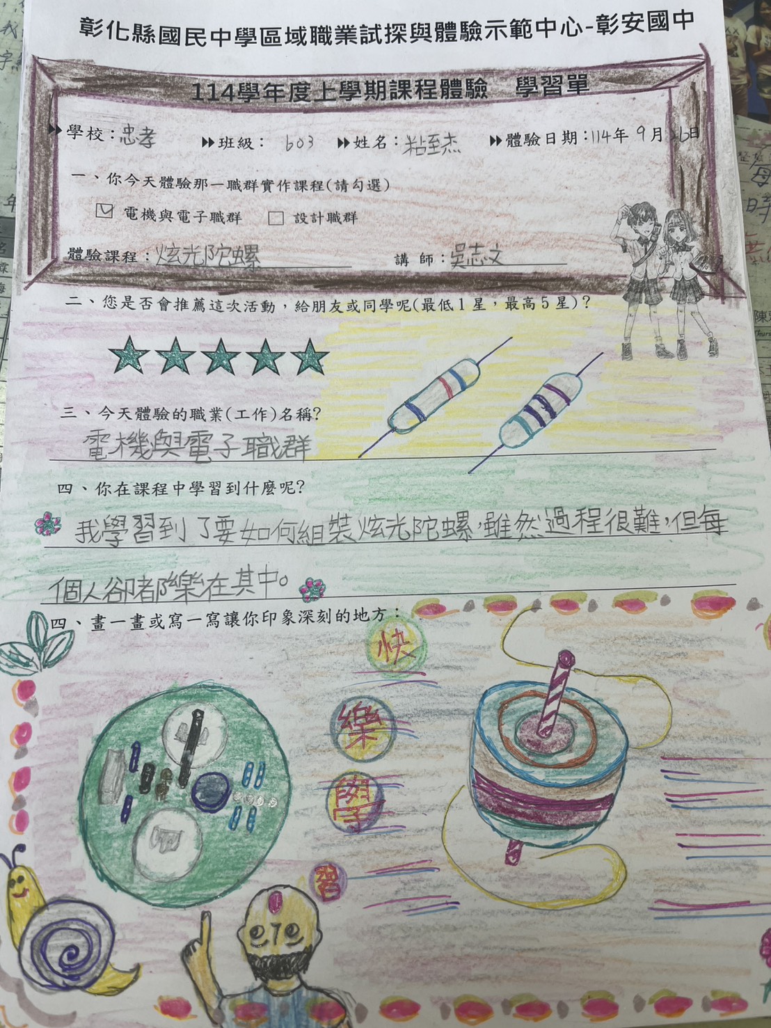 謝謝老師教導我們製作炫光陀螺,一開始操作烙鐵時有點緊張,但在老師的細心指導下,安全的完成組裝,看著成品,與同學來一場PK賽,很有成就感,這是一次難忘且學習滿滿的課程。