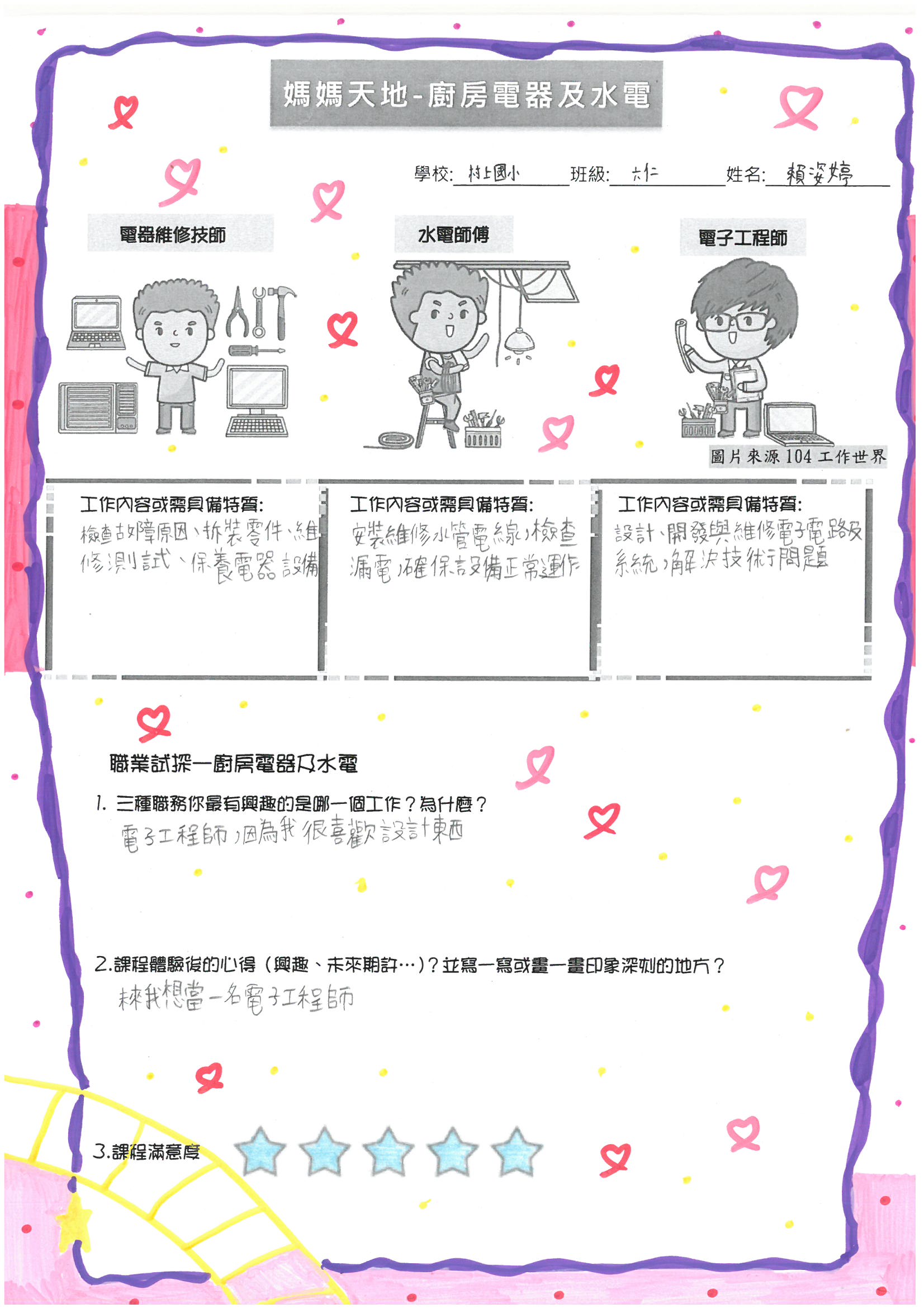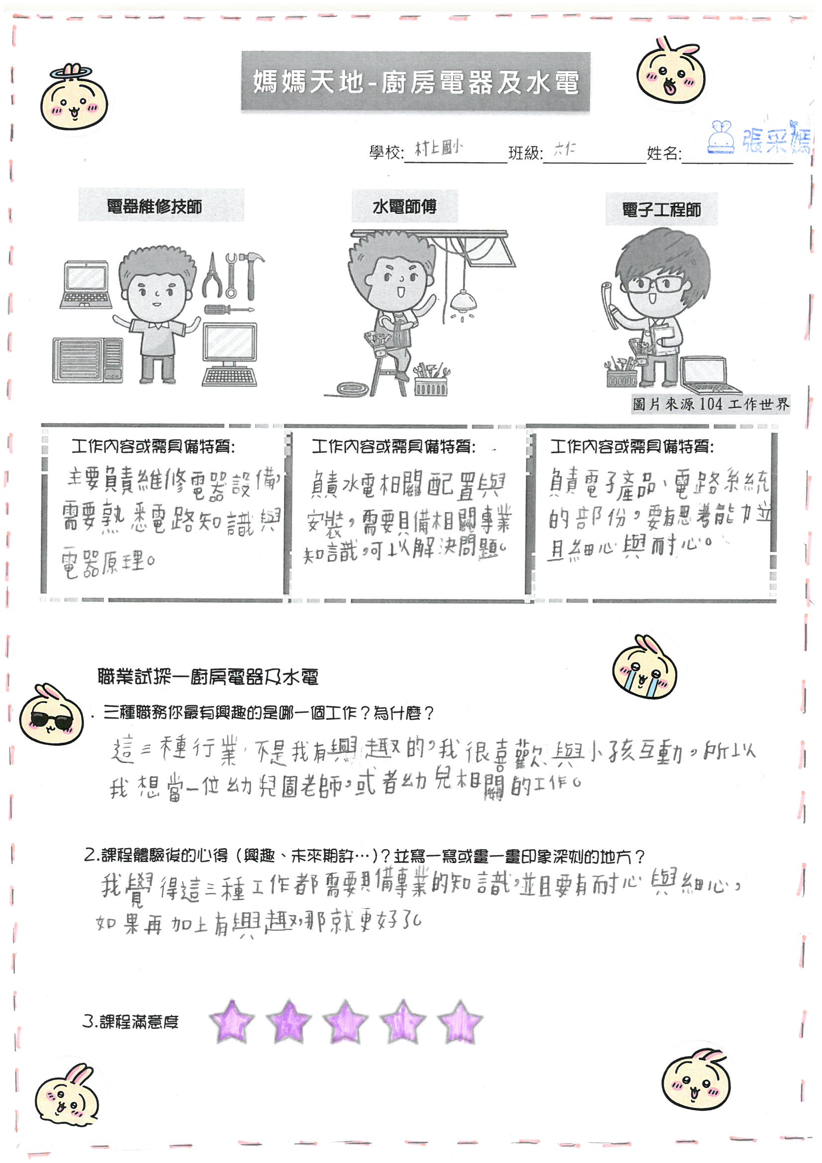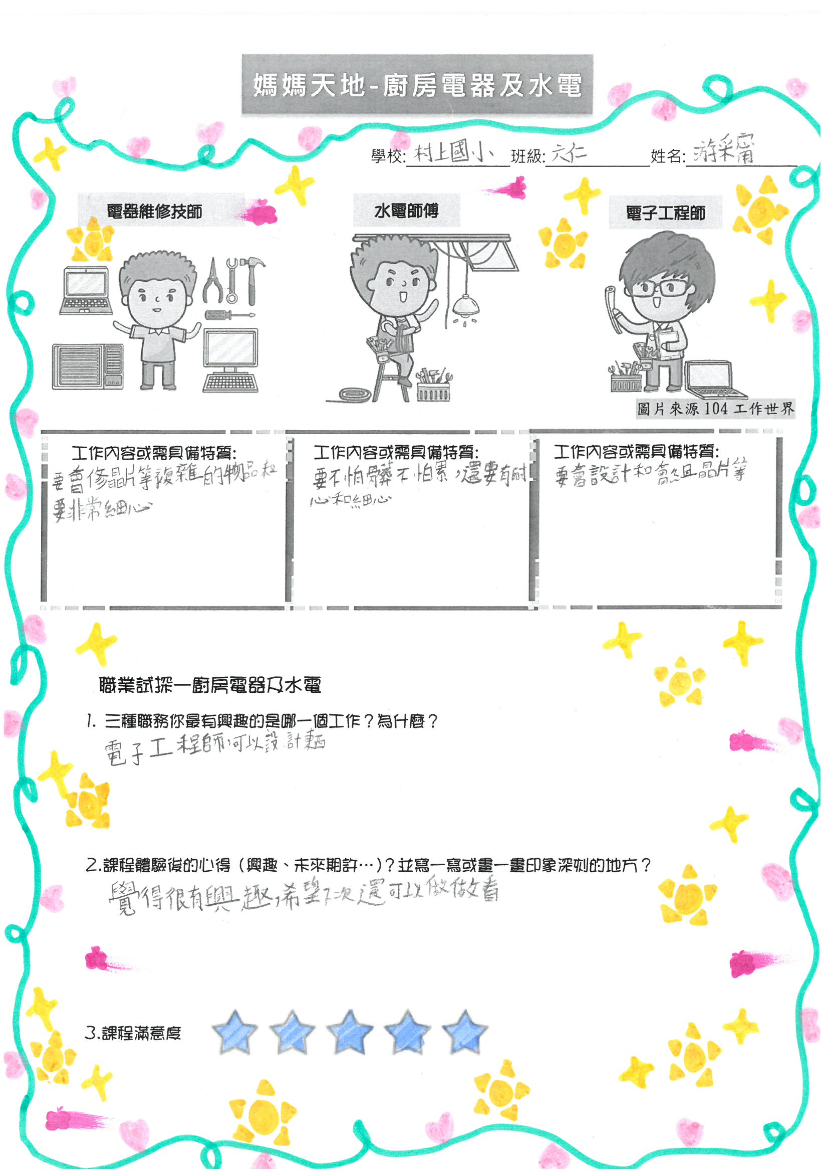 認識廚房電器及水電,藉由燈泡、燈管更換、濾水器濾心更換等,體驗水電師傅的工作內容。小夜燈DIY,動手實作,認識電池、電烙鐵,組裝後燈泡亮起來,獲得學習的成就感與樂趣!!