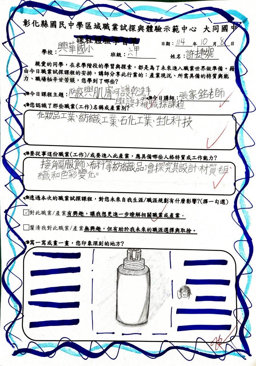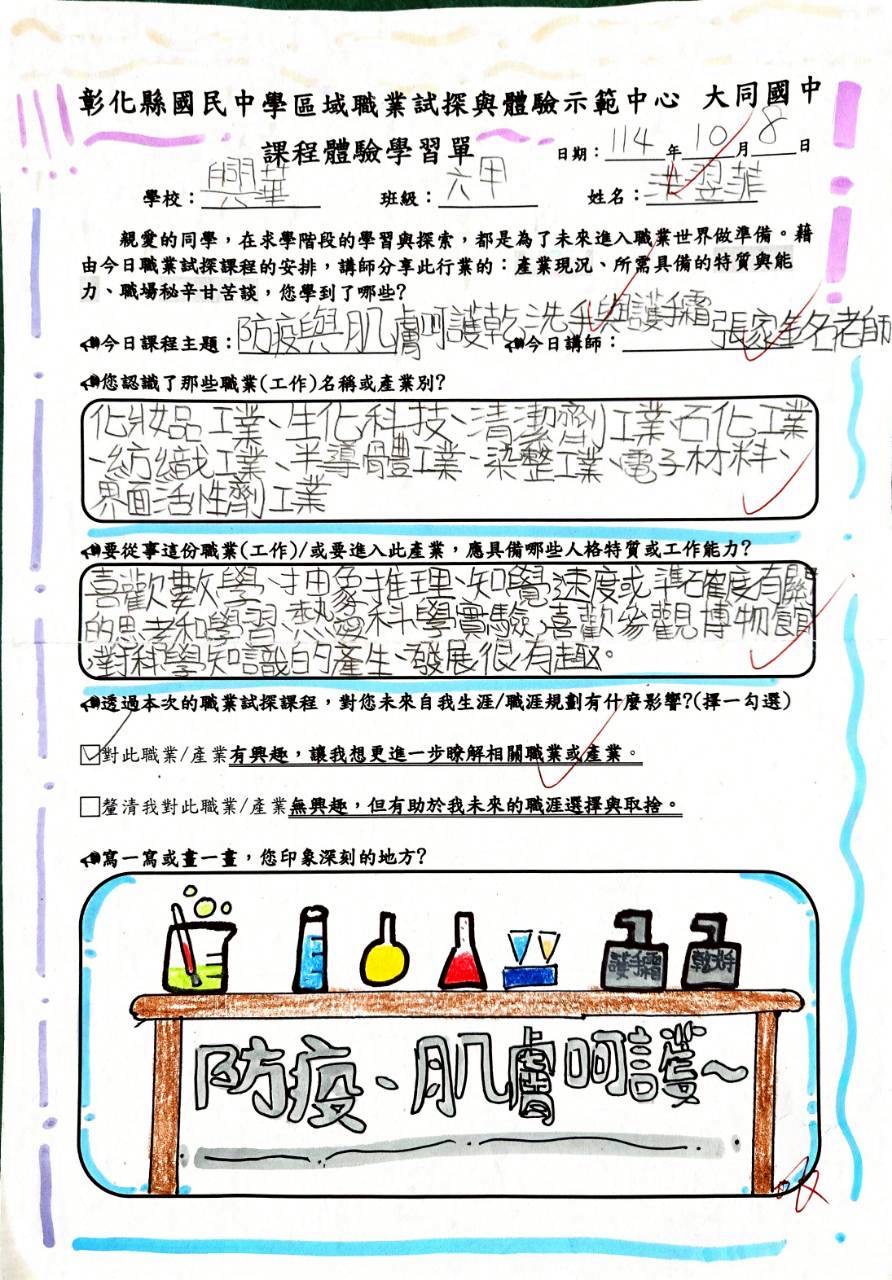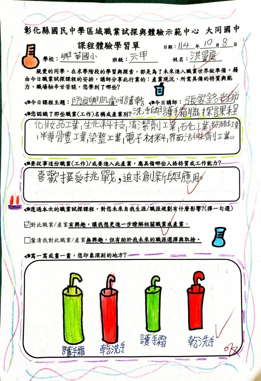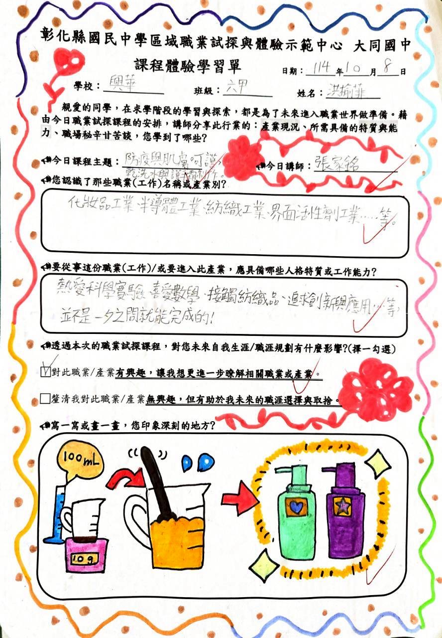 今天,本校六甲同學前往彰化縣立大同國中職業探索與體驗示範中心,參加「防疫與肌膚呵護——乾洗手與護手霜製作」課程。