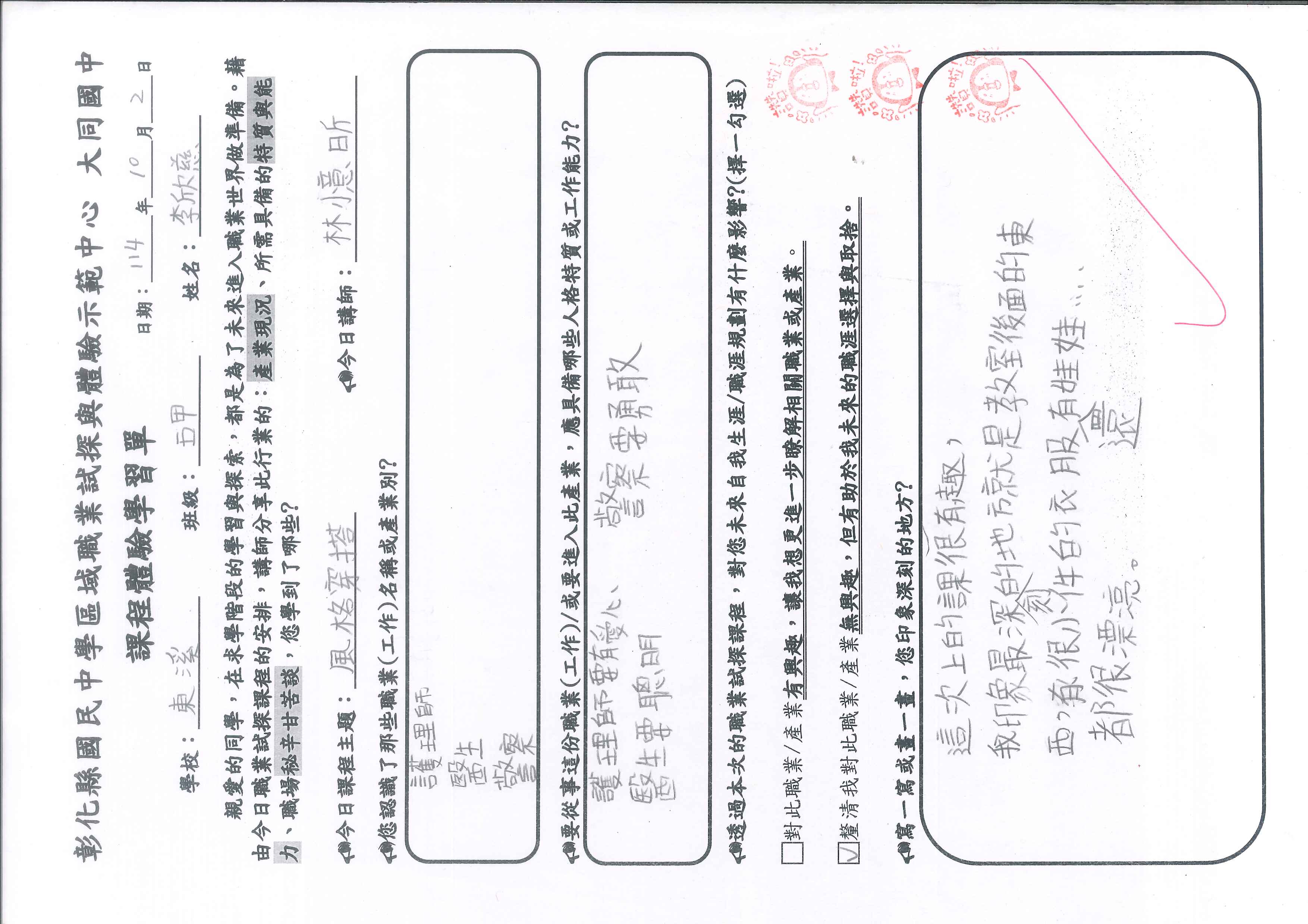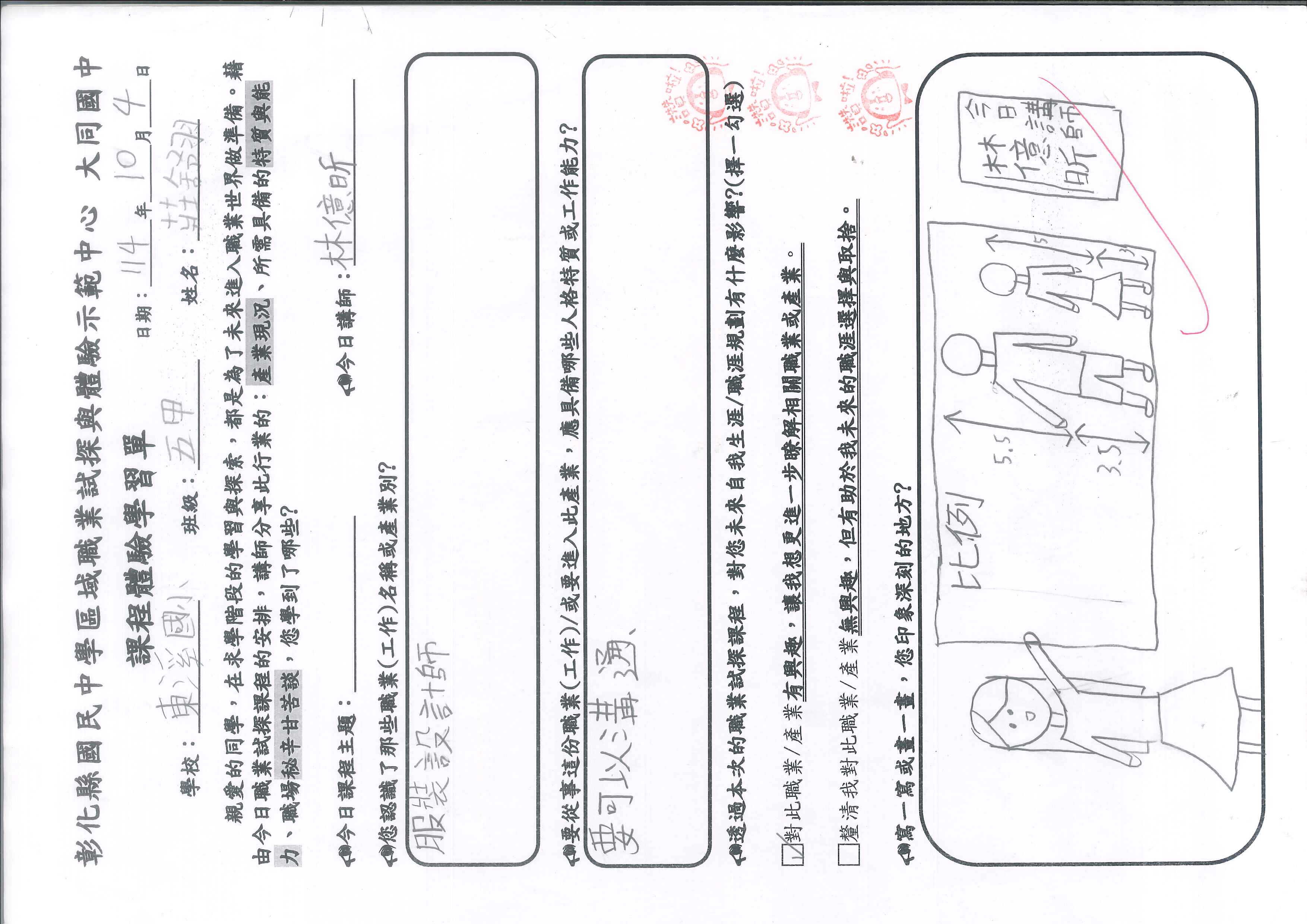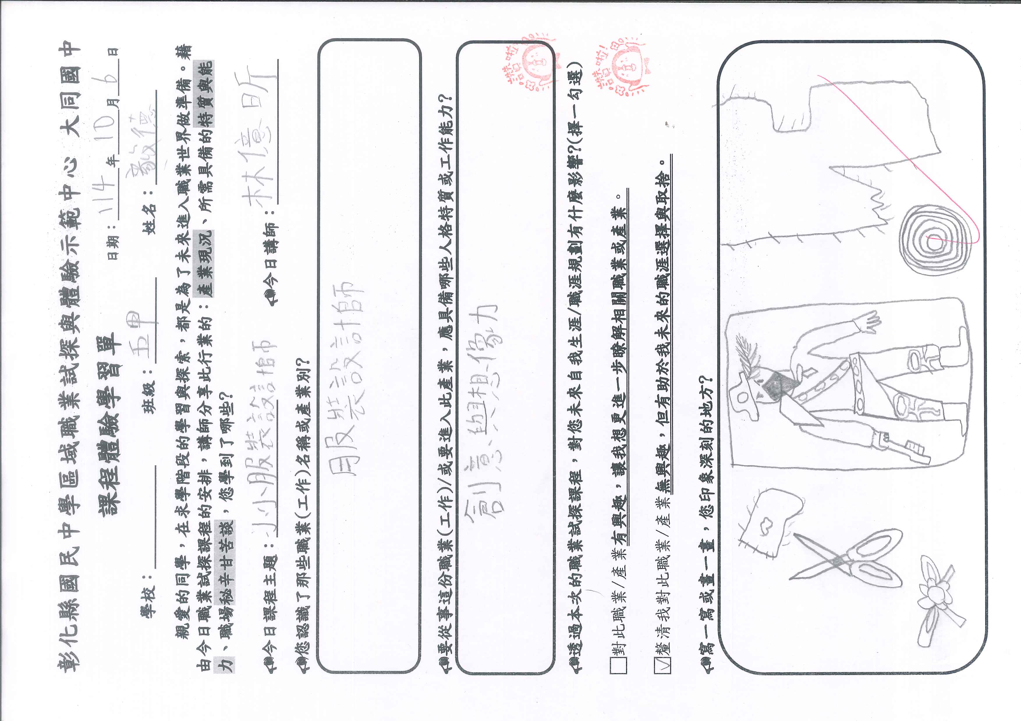 今天的職探課好好玩!我們要幫紙模設計服裝,老師給我們紙模、碎布,讓我們自己動手做。在剪、貼、畫的過程中,發現原來做服裝設計要很有耐心,也要會搭配顏色。作品的時候,大家都覺得超有成就感,這堂課不只好玩,還讓我更了解服裝設計師的工作,下次我想試試看做更特別的造型!
