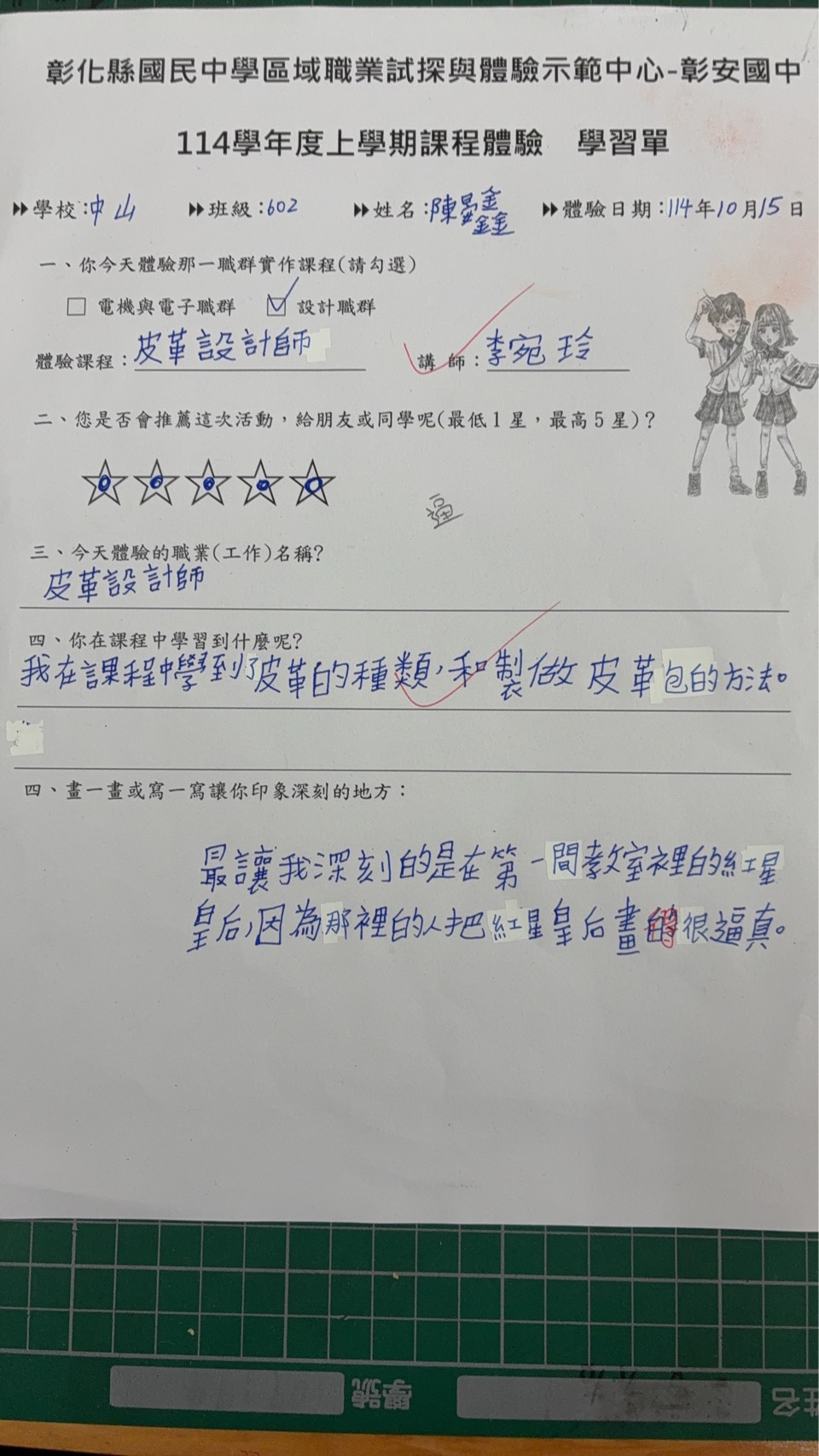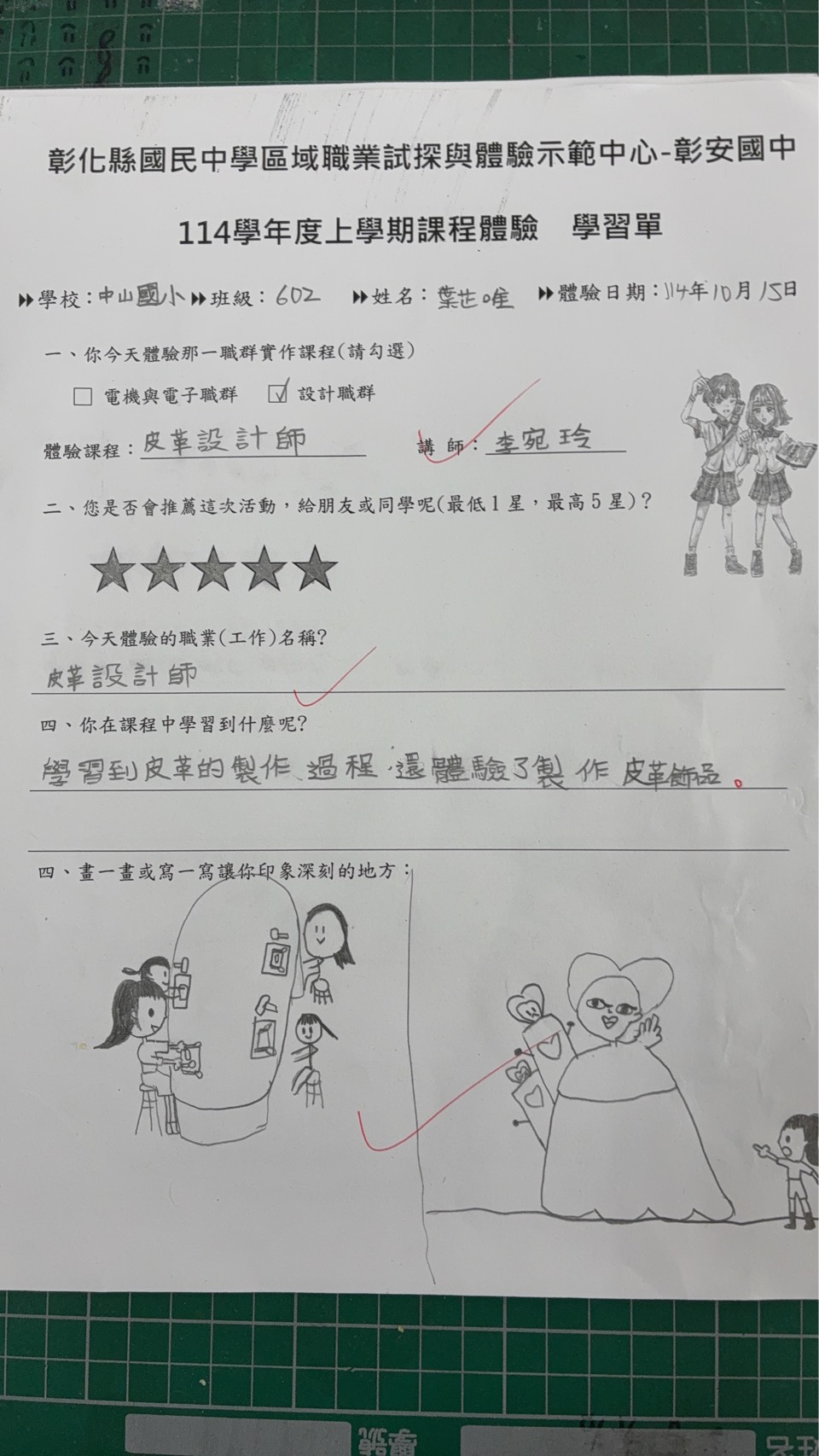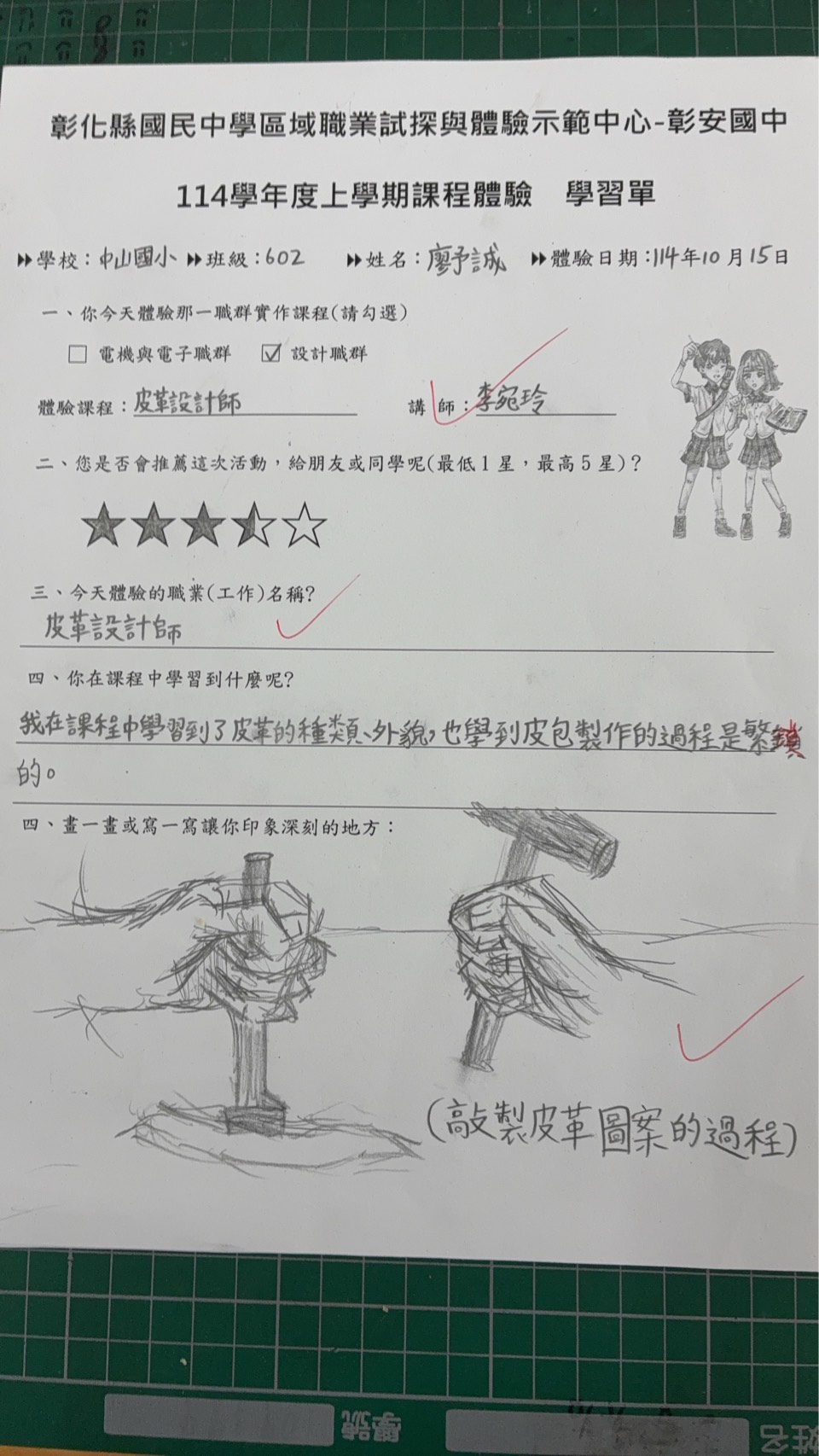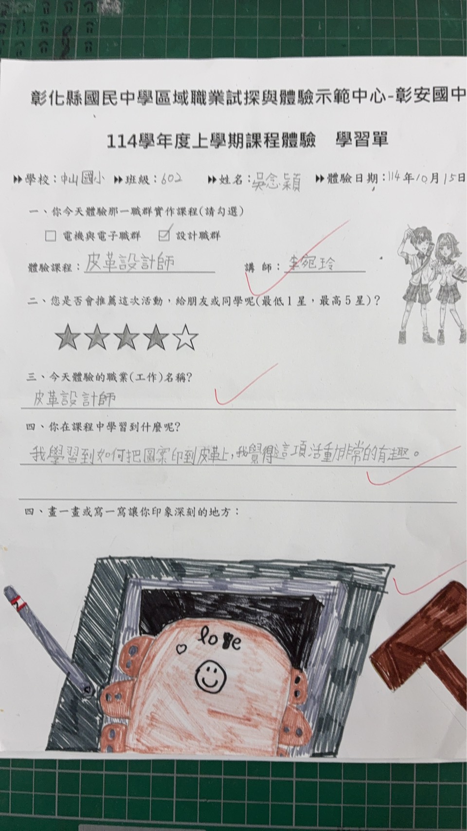 非常感謝彰安國中職探中心安排這場體驗活動,讓孩子們有機會親手製作皮革錢包、體驗創作的樂趣。活動過程中,講師細心指導、環節安排流暢。許多平時容易分心的孩子,也在設計與組裝的過程中展現了難得的專注力。看著他們完成作品時滿臉的喜悅與成就感,真的十分感動。這次活動不僅豐富了孩子們的學習經驗,也培養了他們動手實作與珍惜手作成果的精神。