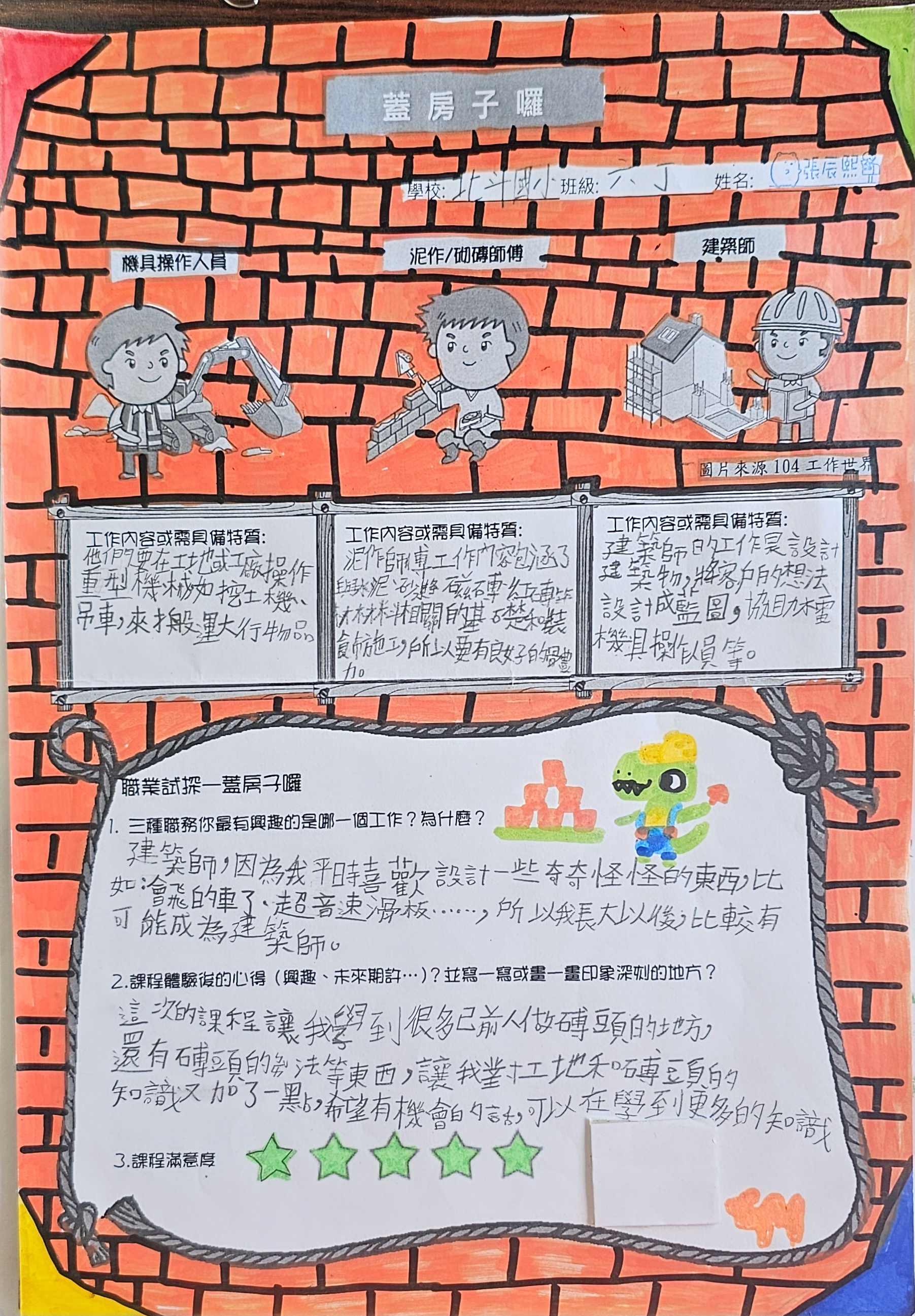 現在我才知道磚塊得來不易,我未來期許可以當上介紹磚塊的講師,把磚塊的歷史由來和製作方法讓每個孩子都知道,並能再分享出去。