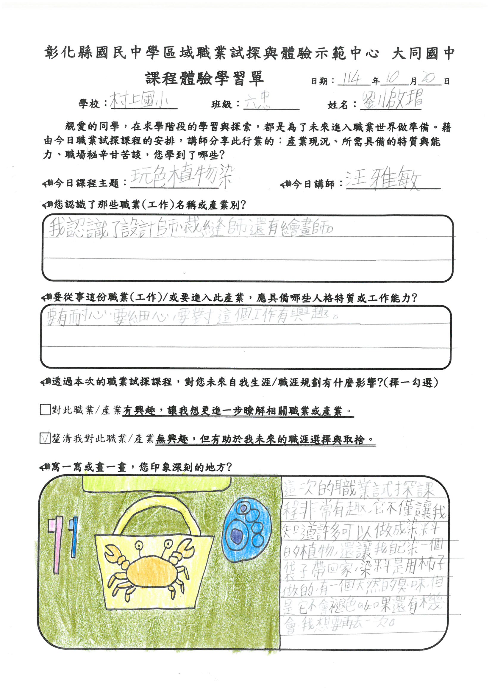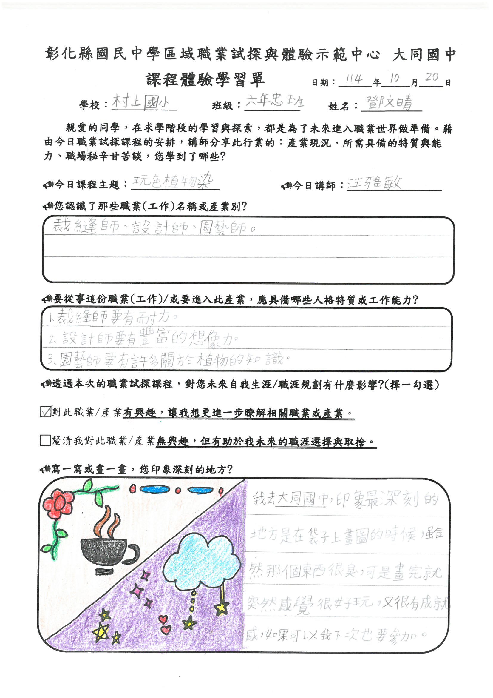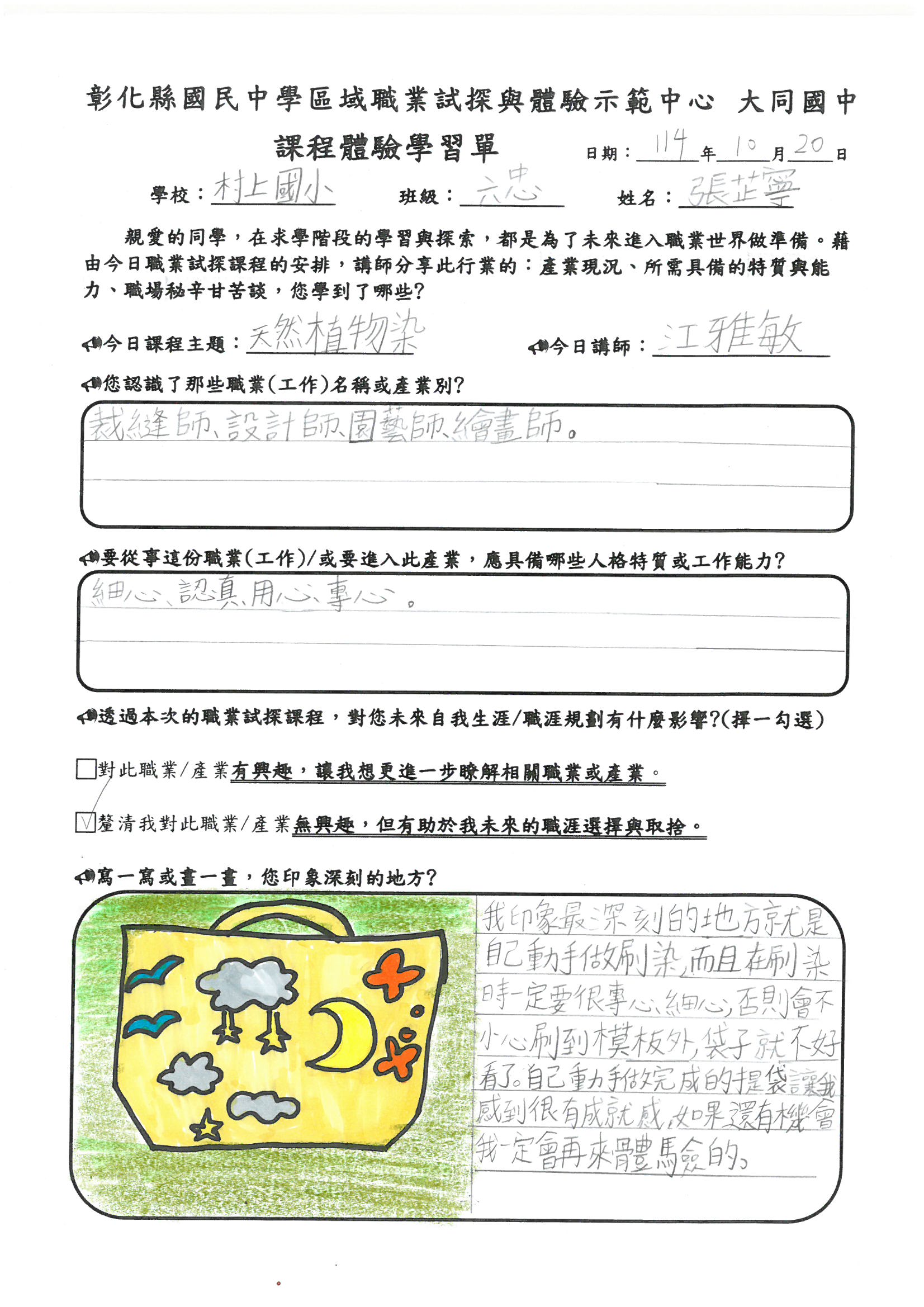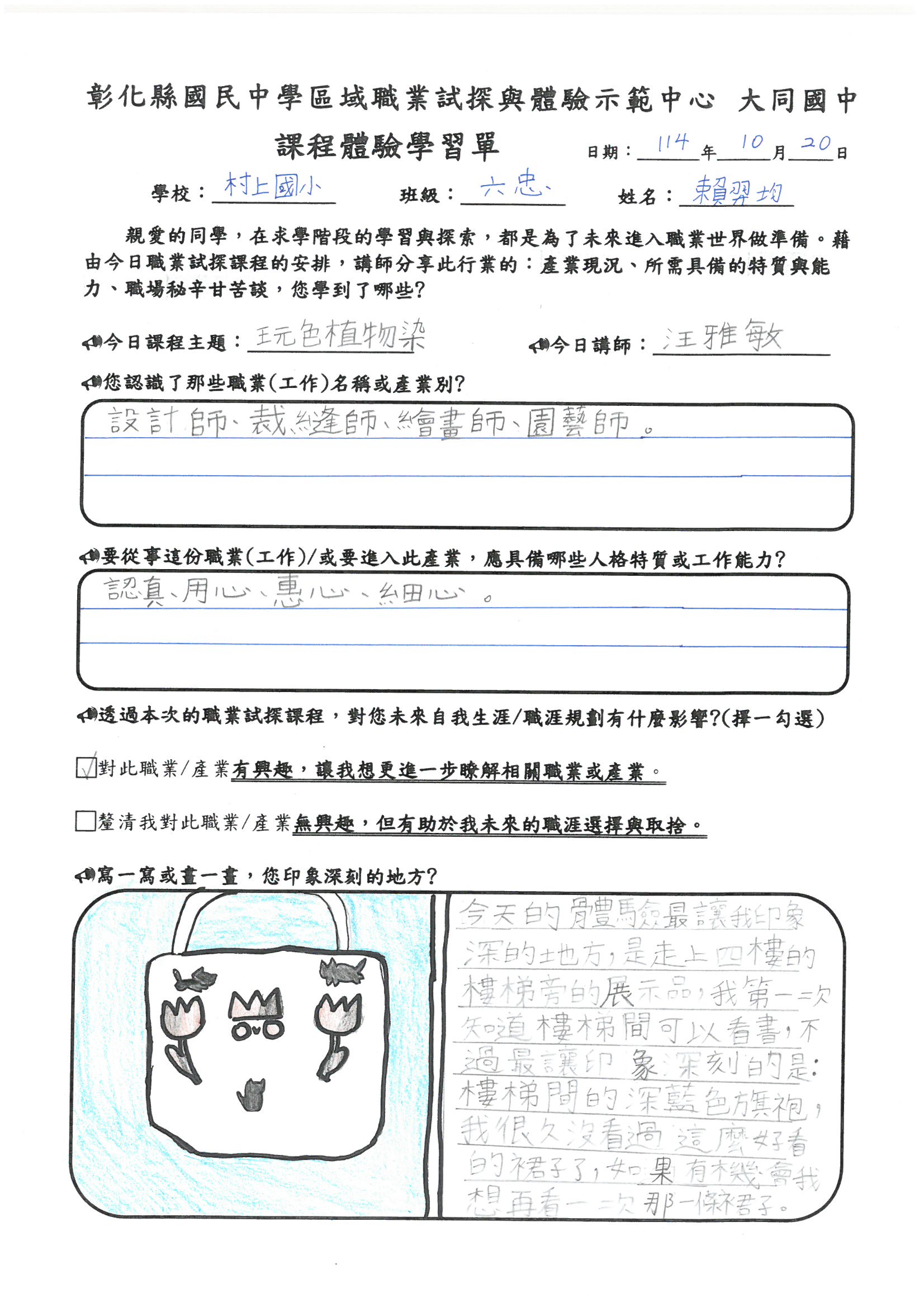 今天參訪大同職探中心,介紹農業群工作內容包括園藝、畜牧、獸醫、造園景觀設計等,體驗課程--玩色植物染,認識植物染料,動手刷做手提袋圖案染色,體驗天然染織工藝的樂趣。
