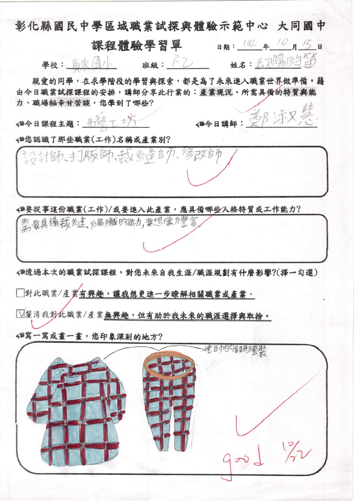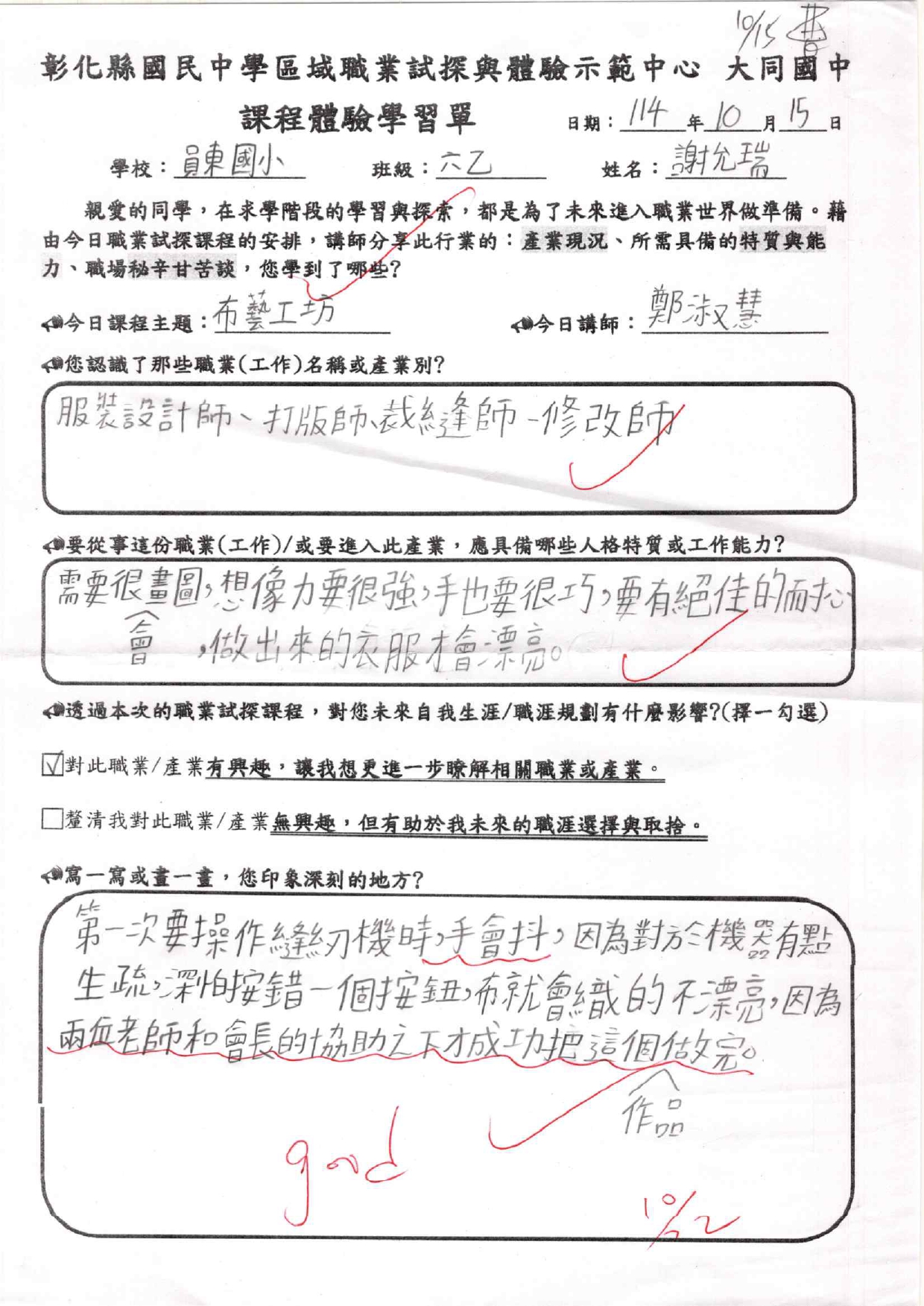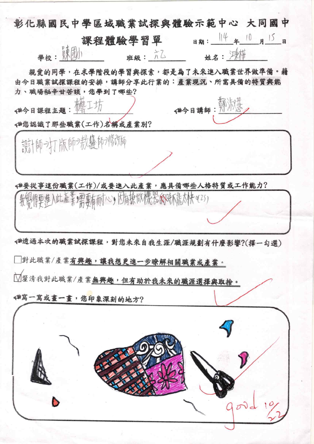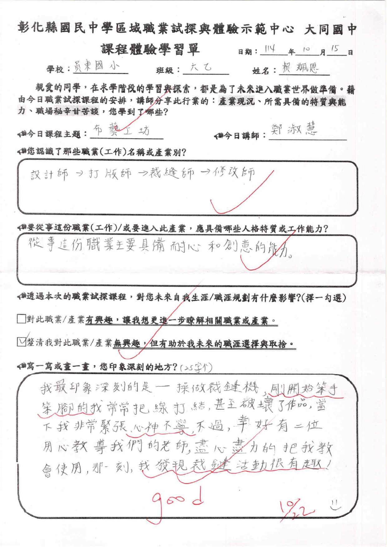 這次職探活動讓我印象最深刻的是-操作裁縫機,一剛開始我笨手笨腳的,常常讓線打結,甚至破壞了作品。當下,我非常緊張且心神不寧。不過,幸好有用心指導我們的兩位老師,在他們的協助下,我完成作品了,也發現裁縫真的很有趣!