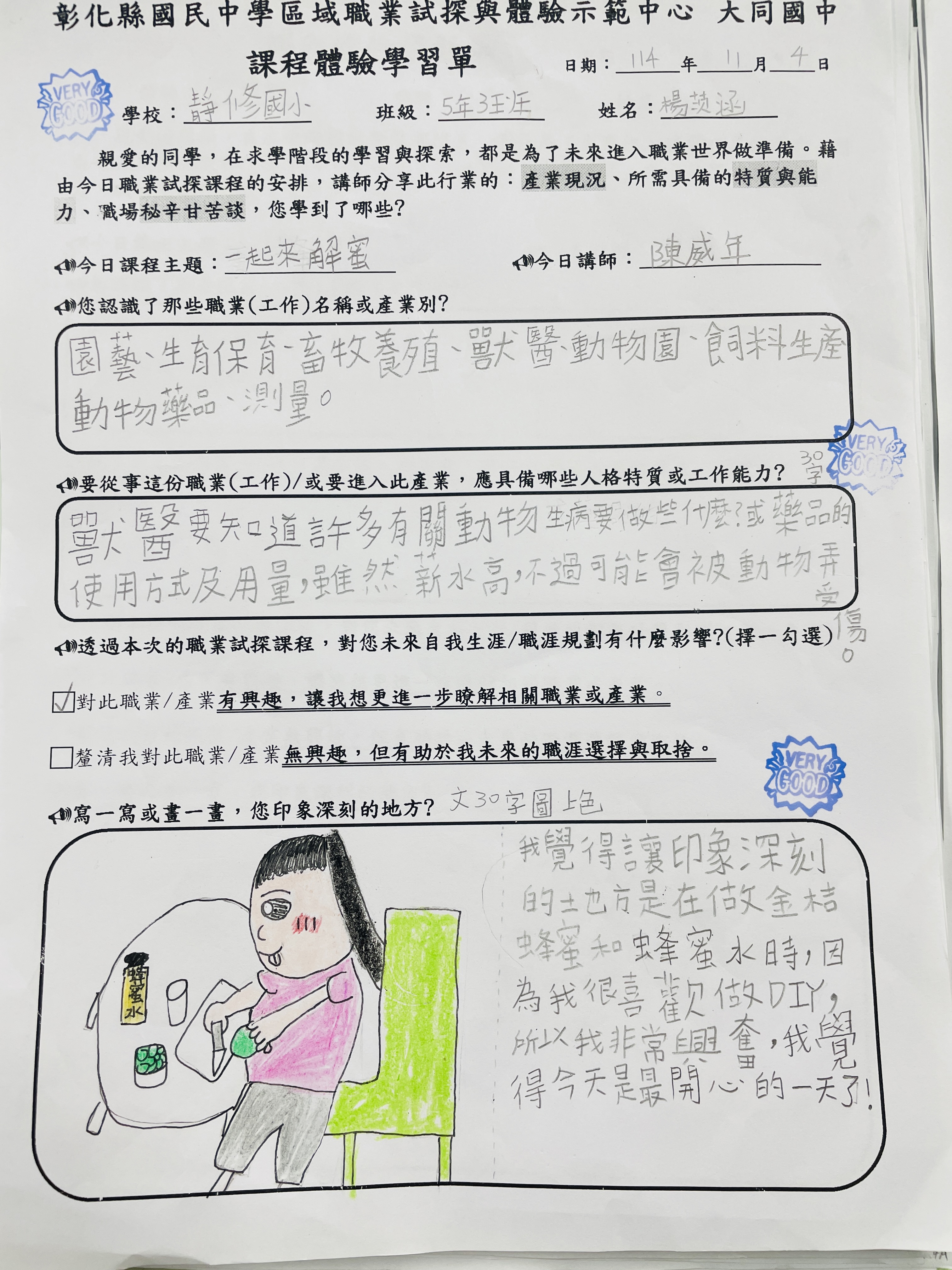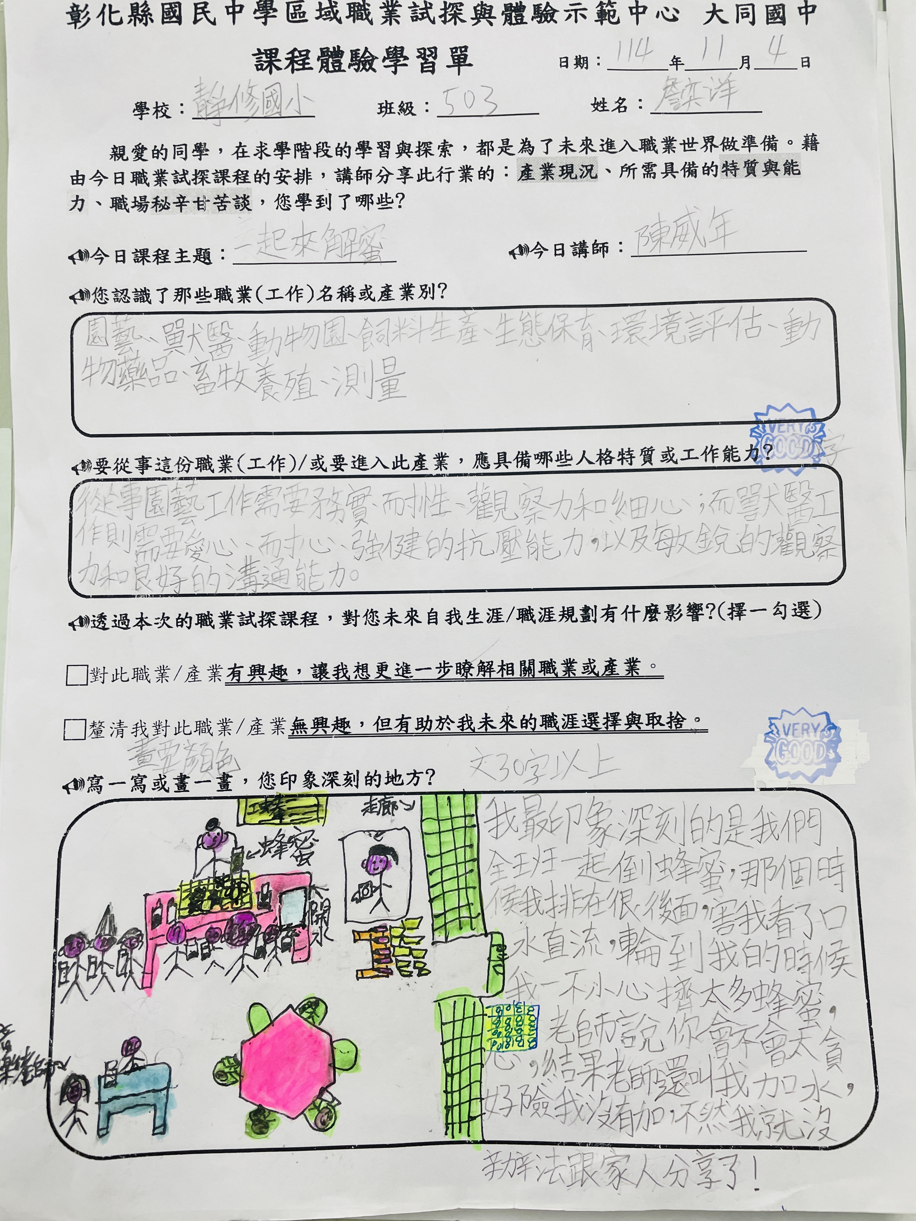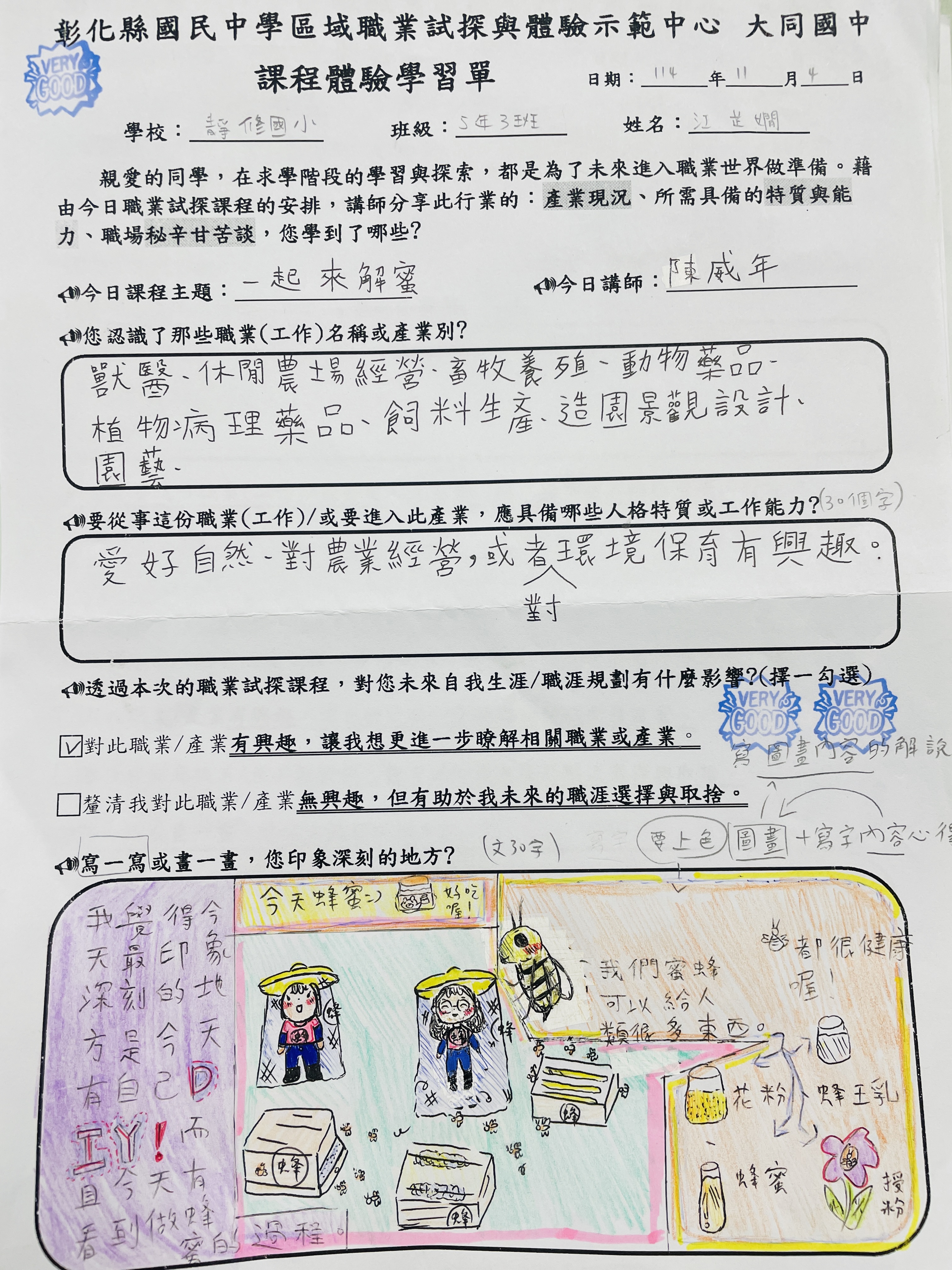 △奕洋:我印象深刻的是全班一起排隊到蜂蜜時,我排在最後面,害我口水直流。輪到我時,我一不小心擠太多蜂蜜,被老師說太貪心,老師勸我加水做成蜂蜜水,好險我沒有加,不然我就沒辦法與家人分享香甜可口的蜂蜜。