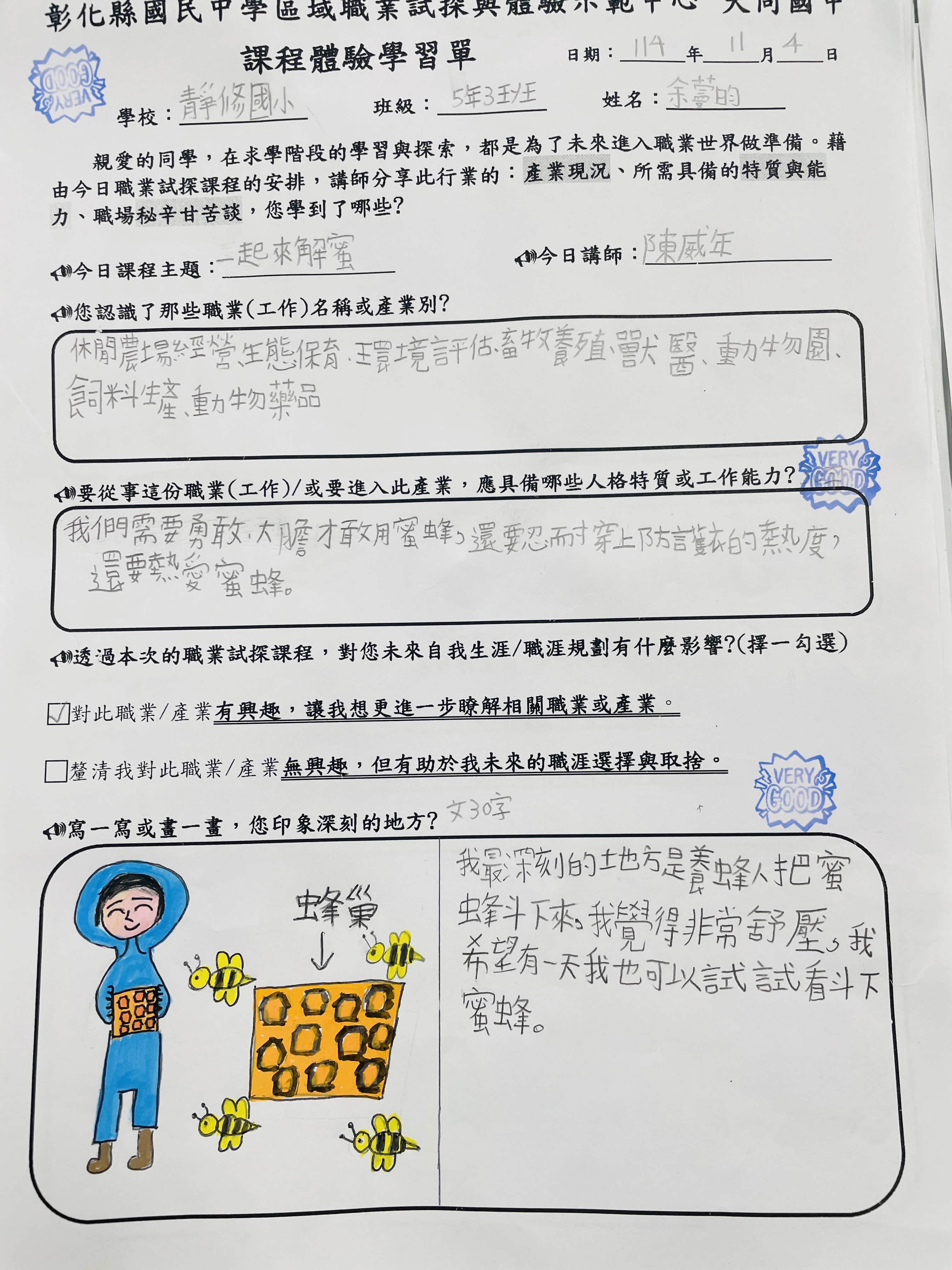 △宥勛:在這個課程中,我知道女王蜂、雄蜂、工蜂這麼多分工的蜜蜂。冬天時,食物不夠工蜂會趕走雄蜂。