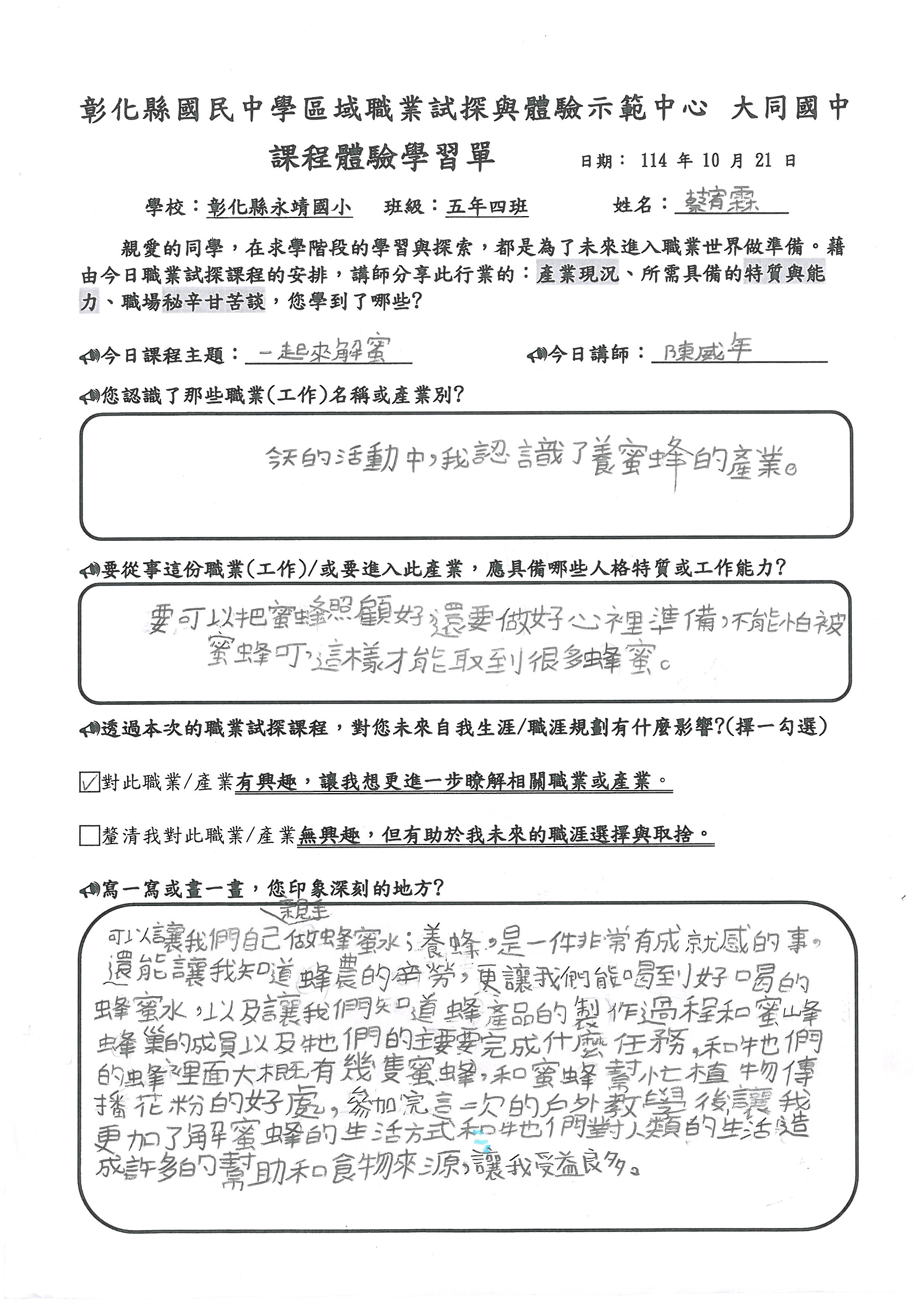 2.了解到養蜂人的工作內容,及關於蜜蜂的知識。