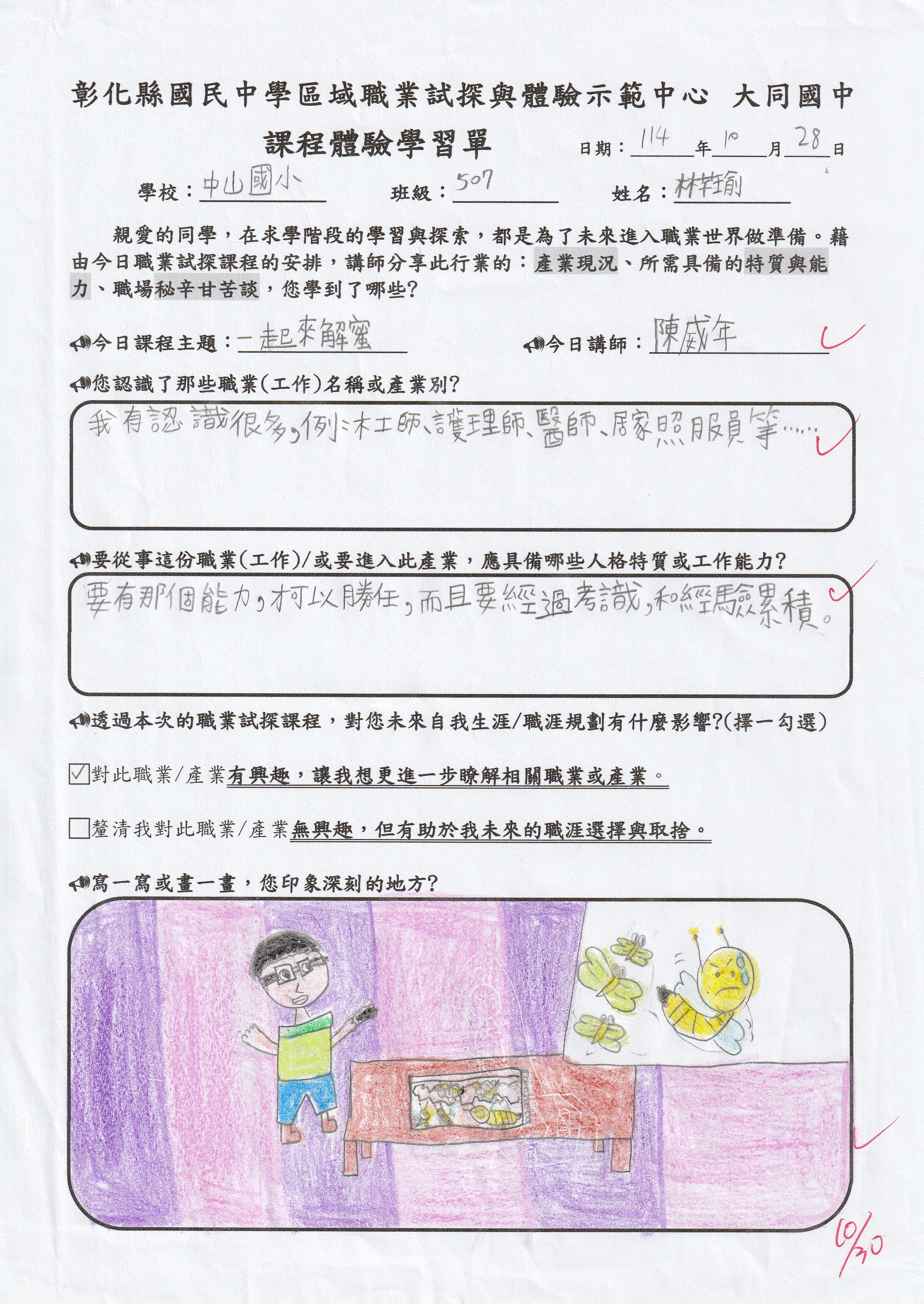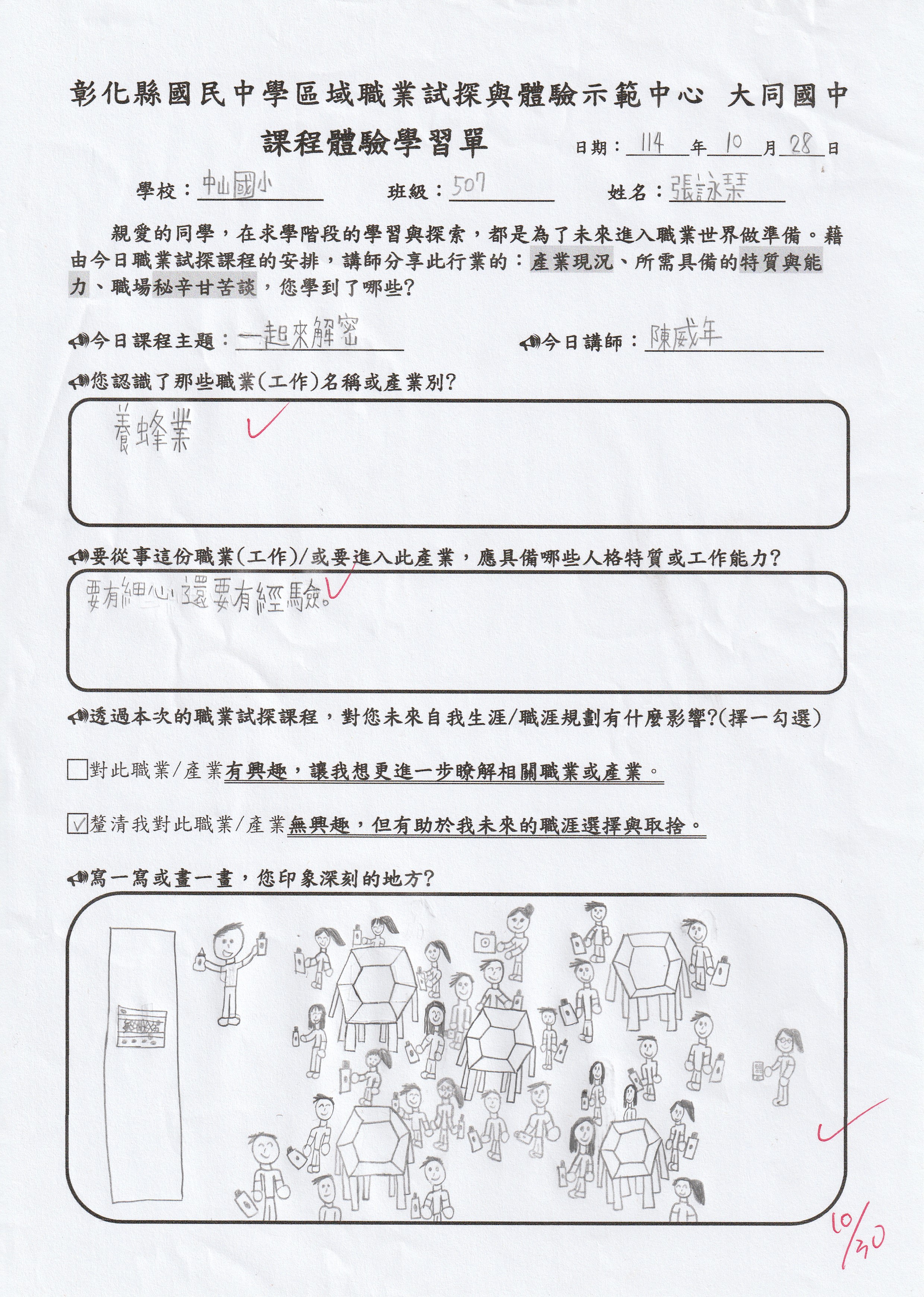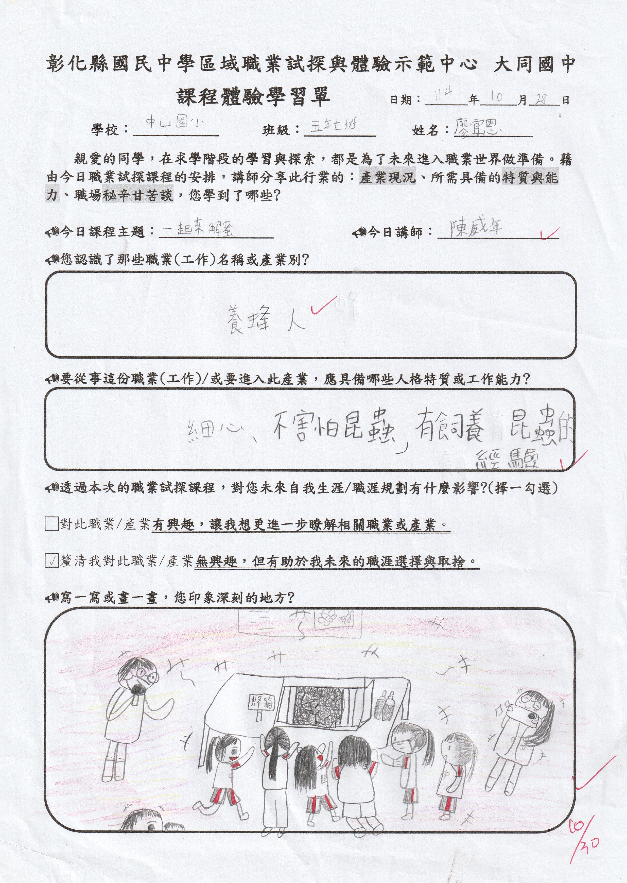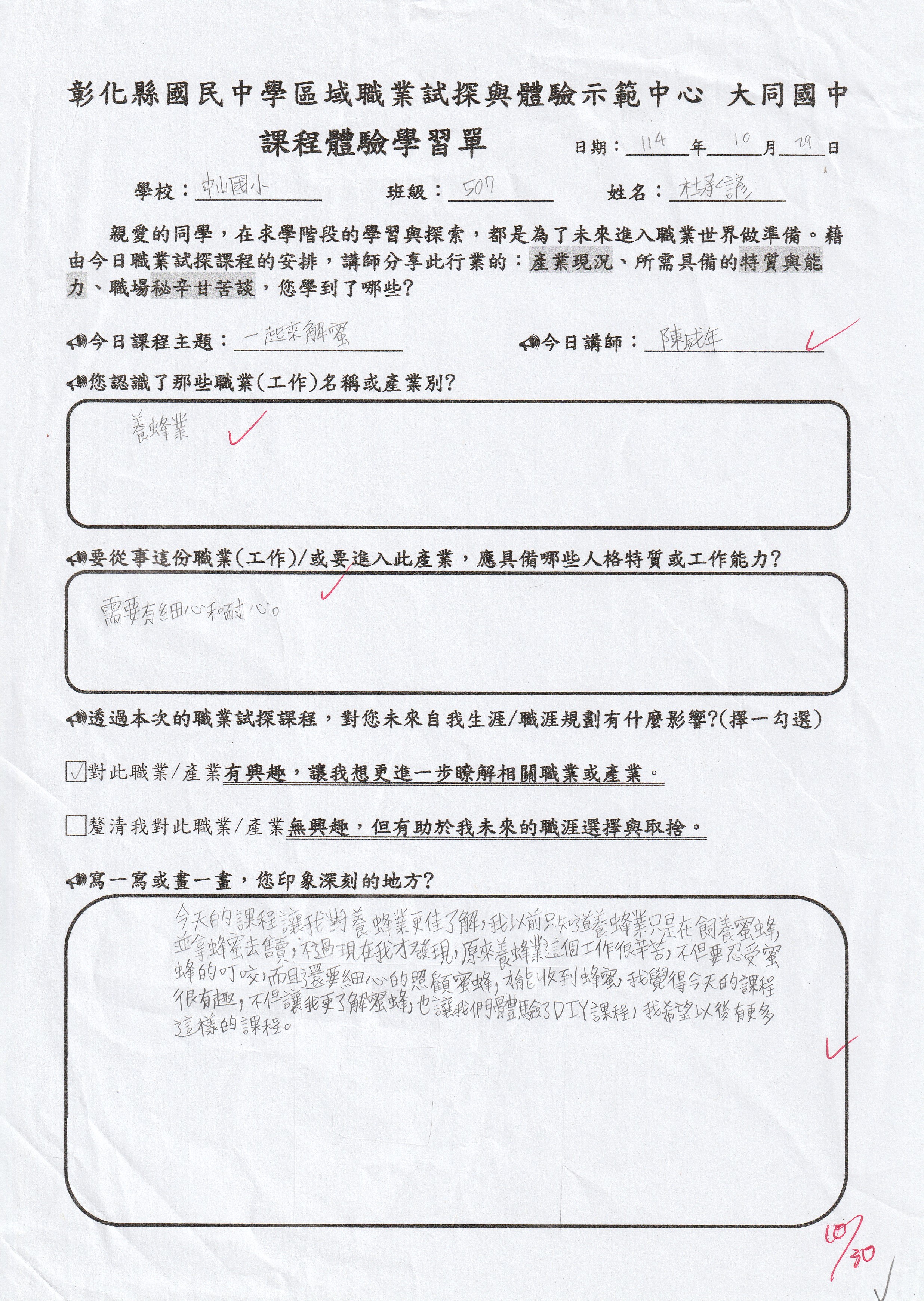 今天的課程讓我對養蜂業更加了解,我以前只知道養蜂業只是在飼養蜜蜂並拿蜂蜜去販售,不過現在我才發現,原來養蜂這個工作很辛苦,不但要忍受蜜蜂的叮咬,而且還要細心的照顧蜜蜂,才能收到蜂蜜,我覺得今天的課程很有趣,讓我更加了解蜜蜂,也讓我們體驗DIY課程,希望以後有更多認識各行各業的課程。