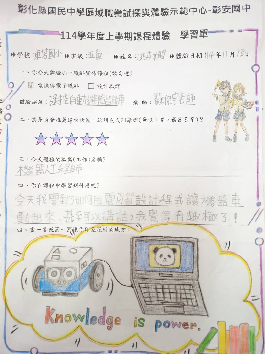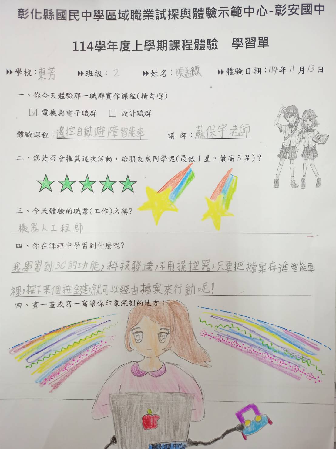 謝謝蘇保宇老師的耐心指導,也感謝彰安國中職探中心提供這麼有趣又實用的課程。這次課程不僅增加了我對電機與電子職群領域的興趣,也讓我更有信心挑戰未來更多與科技相關的學習。