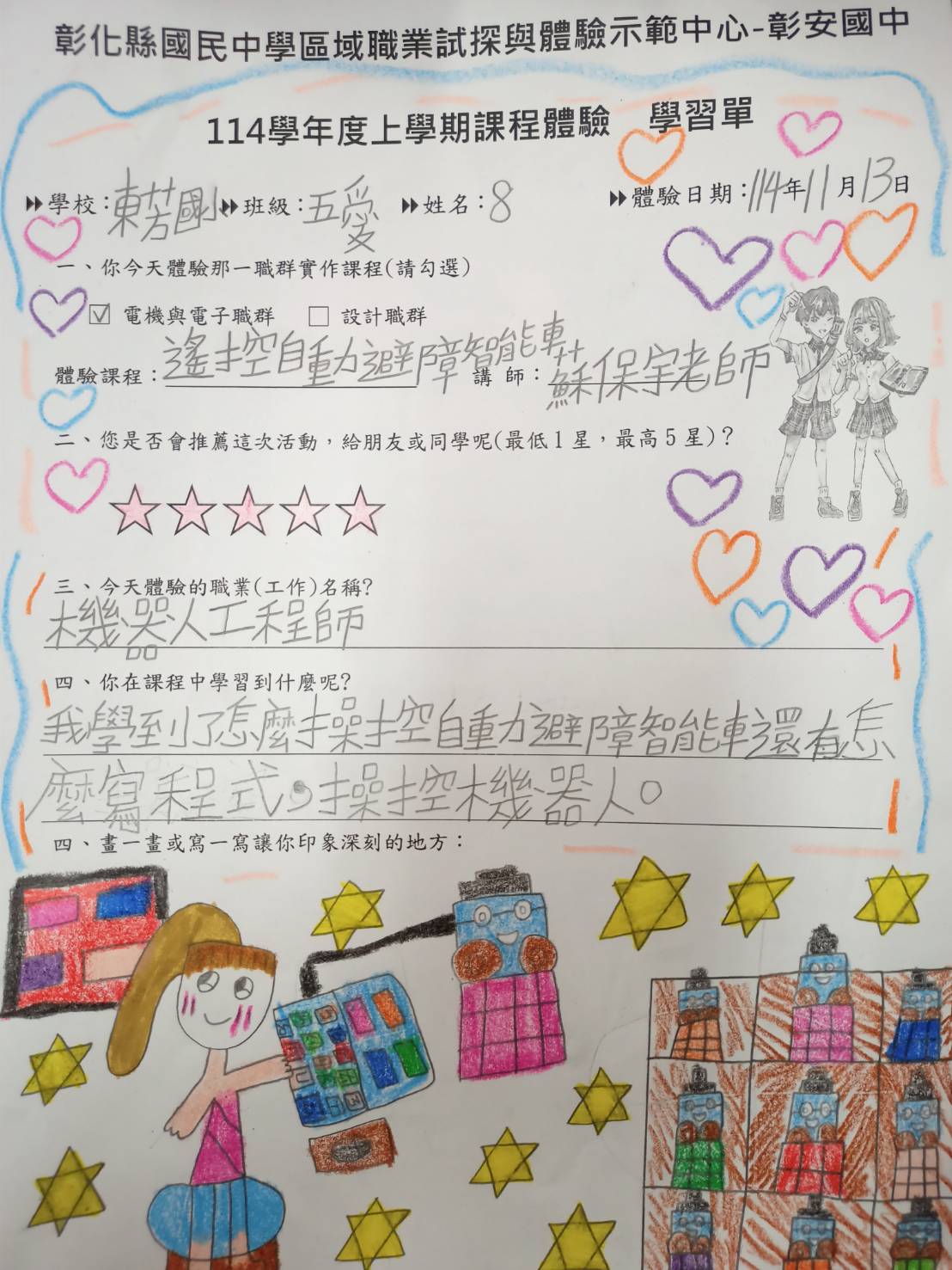 這次參加由彰安國中職探中心舉辦的「遙控自動避障智能車」課程,讓我收穫非常豐富。課程一開始,蘇保宇老師先介紹智能車的基本構造與感測器原理,透過清楚的說明,我逐漸了解超音波感測器、電機驅動以及控制板之間是如何協同運作。原本覺得遙控車只是簡單的玩具,但在課堂中才真正認識到其中的智慧與技術。