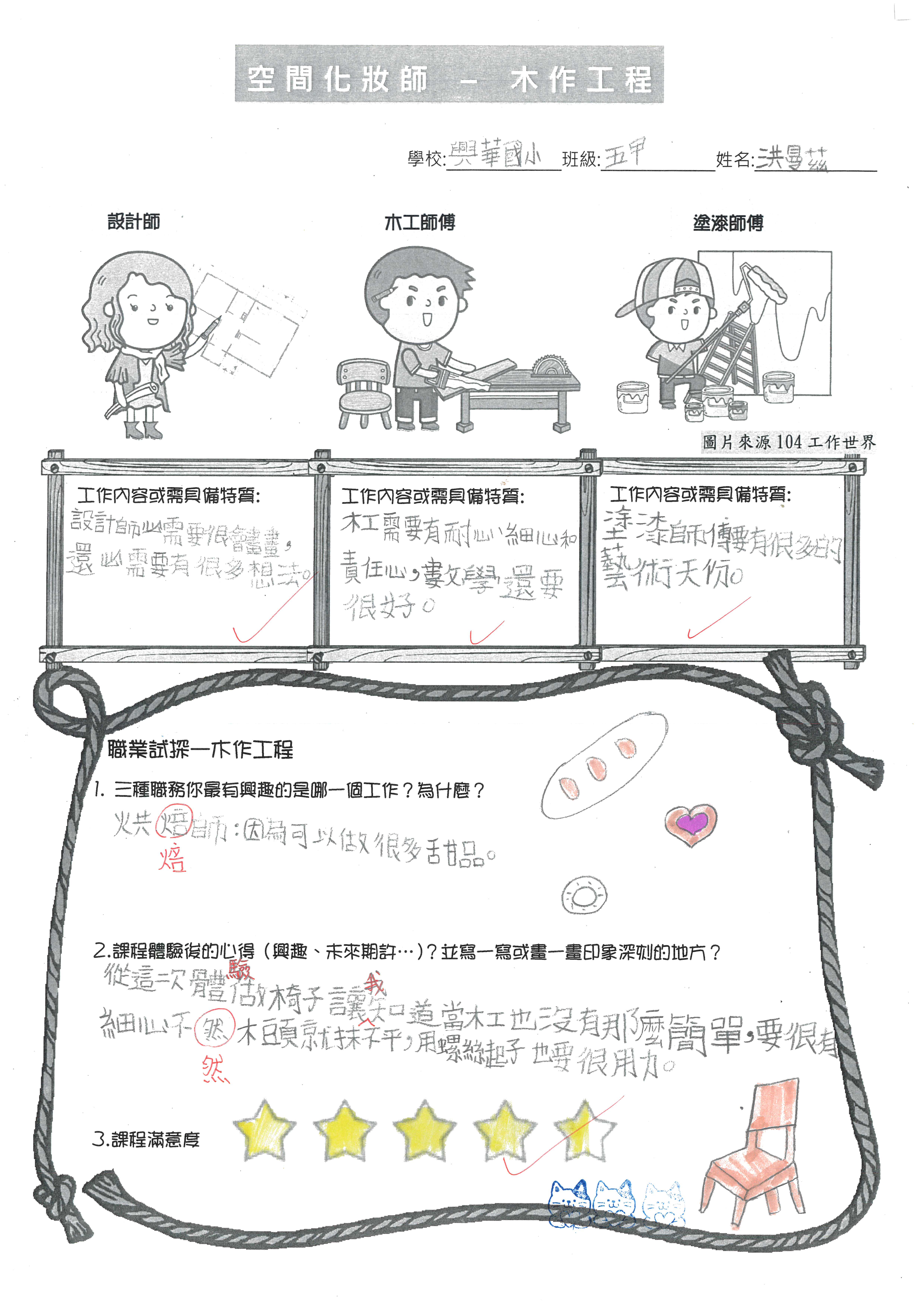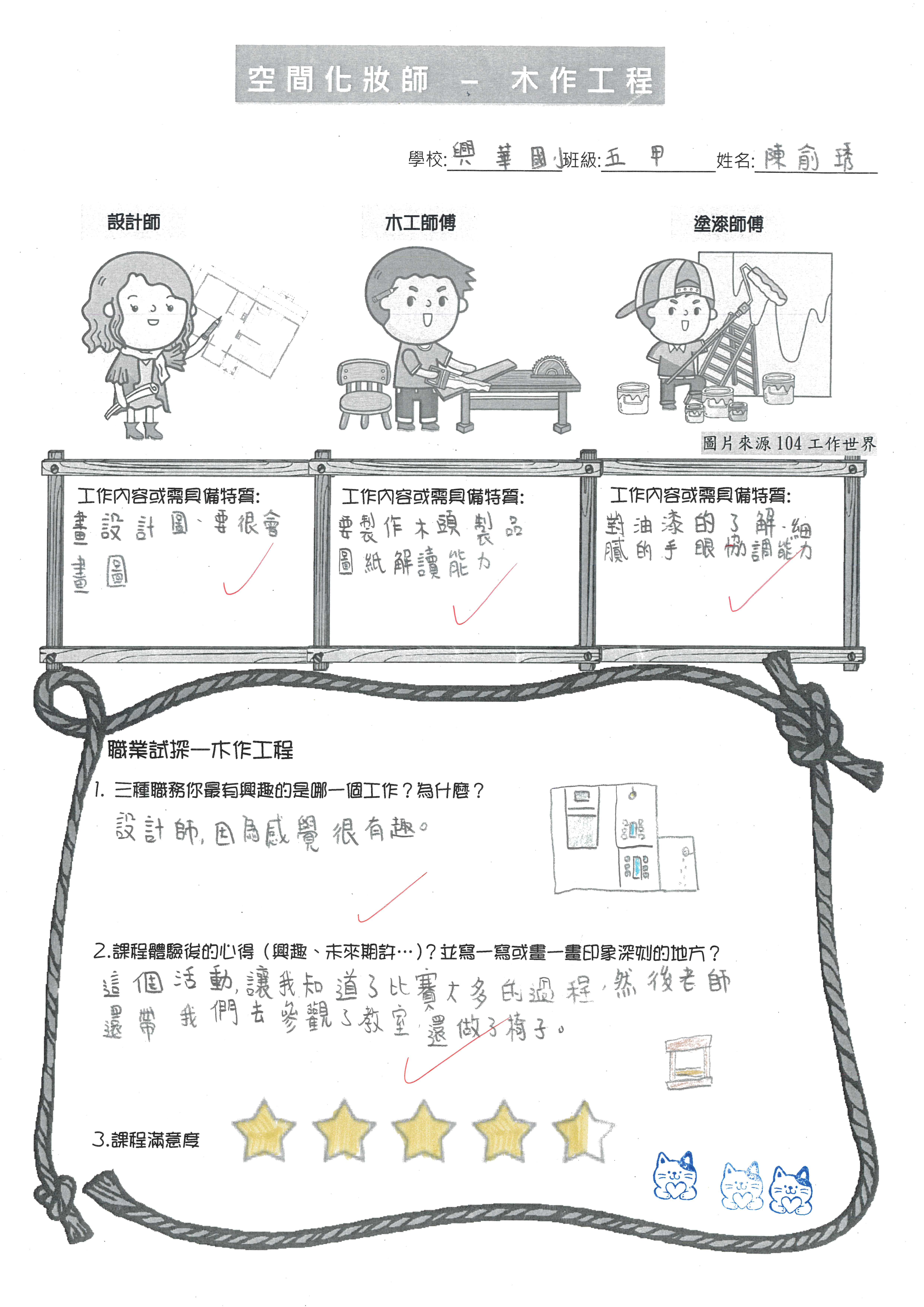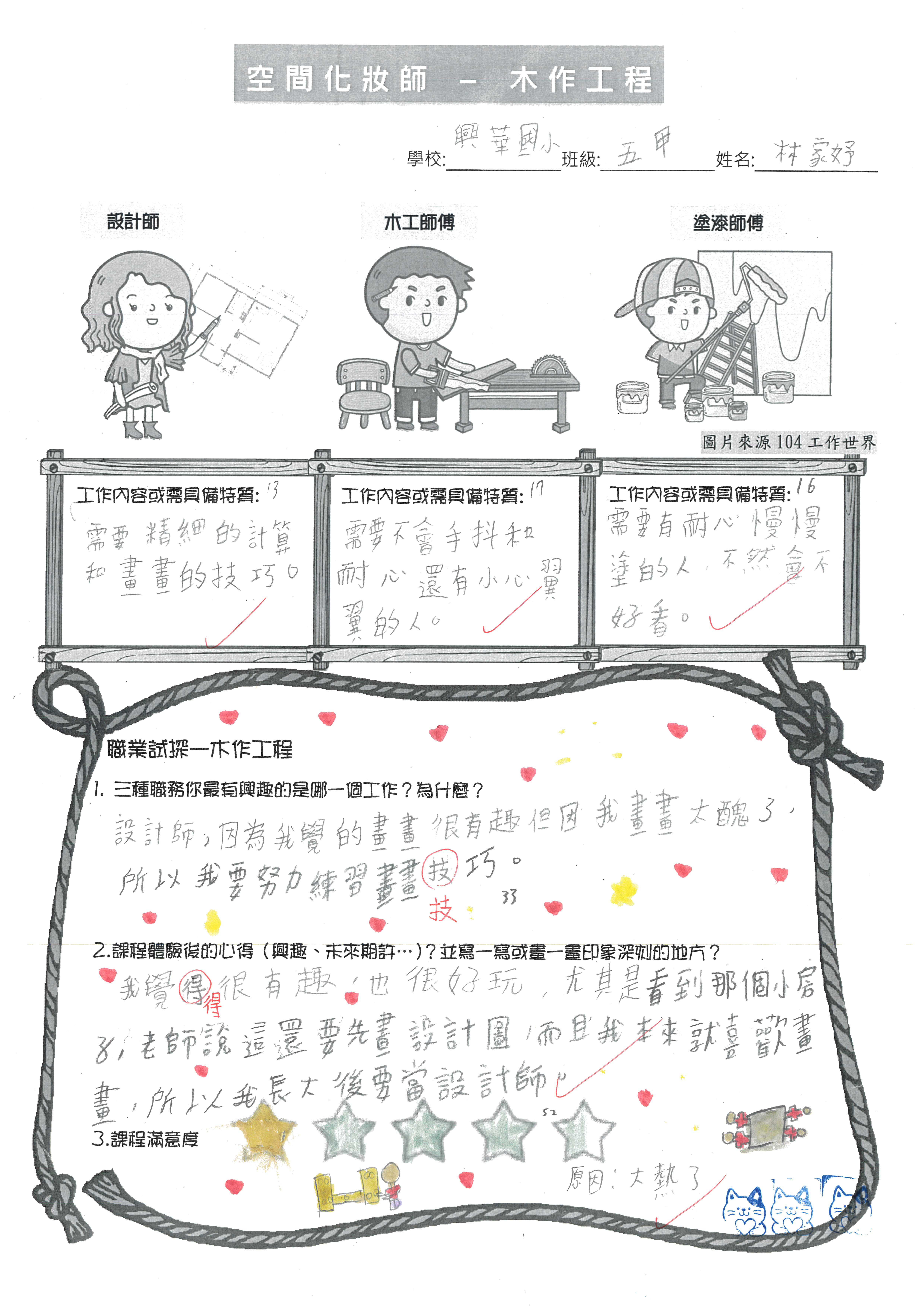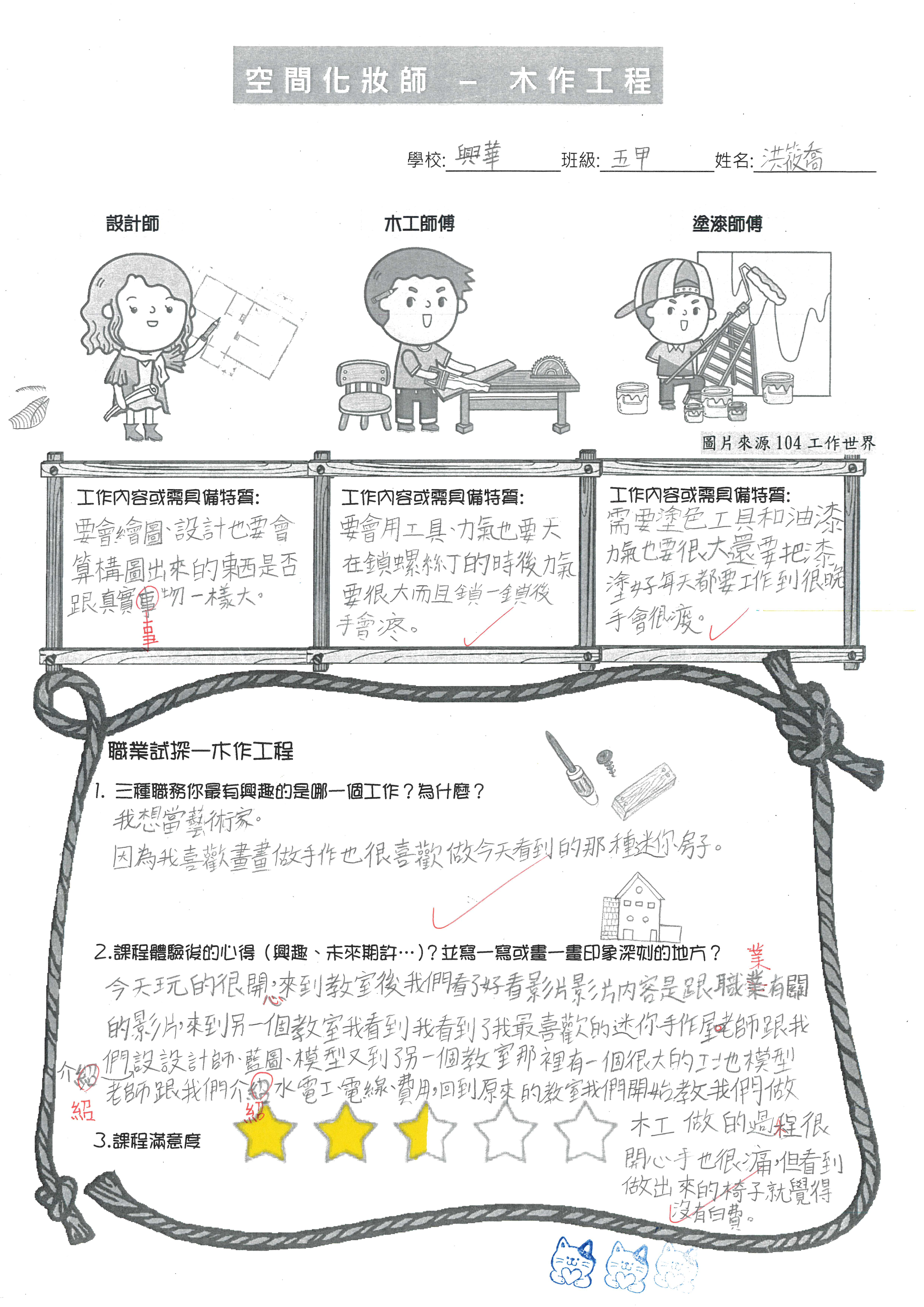 今天五甲的同學們前往原斗職探中心,展開一場充滿創意與實作精神的《木作課程—空間化妝師》體驗!在專業講師的帶領下,學生們學習量測、打磨木材、鎖螺絲與組裝,親手完成屬於自己的實用木椅。看著木板一步步變成可坐的成品,孩子們的眼睛都亮了,充滿自信與成就感。活動過程中,校長與主任也特地到場關心孩子們的學習情況,給予滿滿支持;而導師更是在旁細心協助與指導,讓每位學生都能安心操作、順利完成作品。透過這堂課,五甲同學不只學到木作技術,也更理解木工師、空間設計與裝潢相關職業的專業與辛勞。謝謝原斗職探中心的精心安排,開啟孩子們多元的職涯視野!