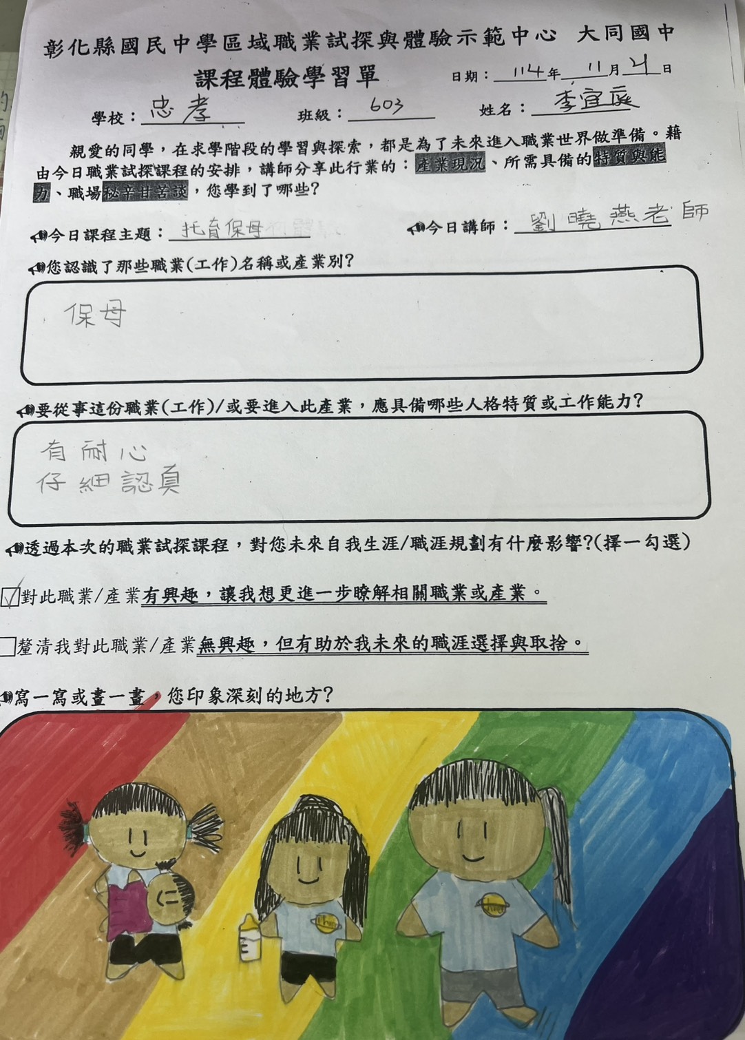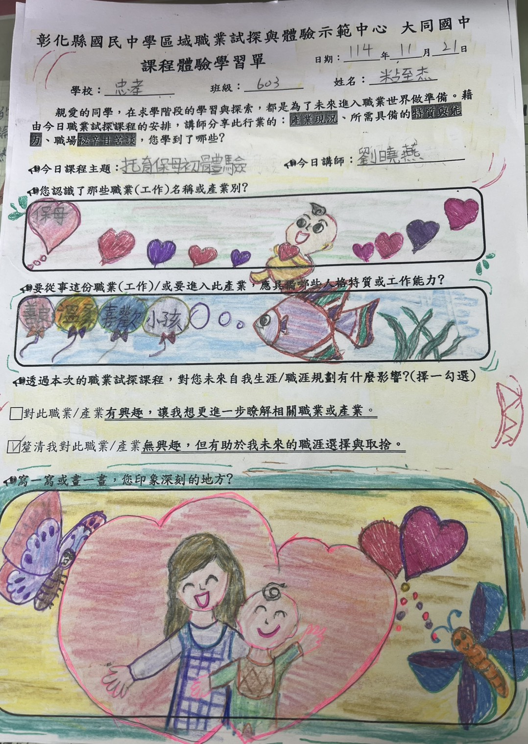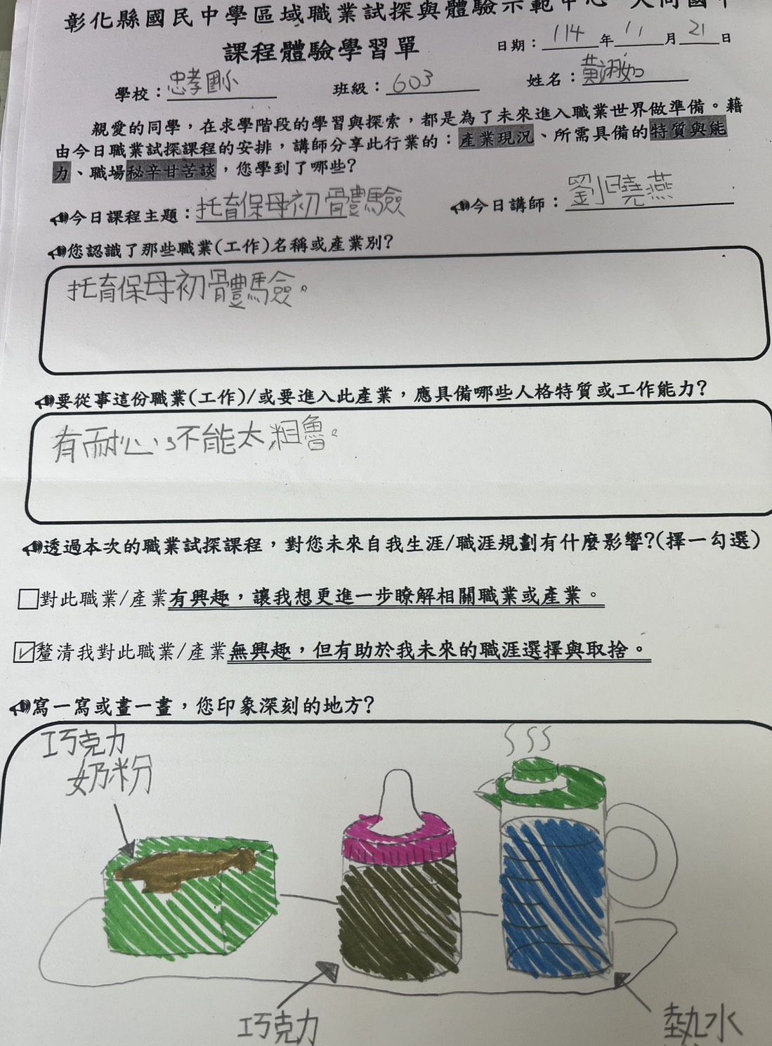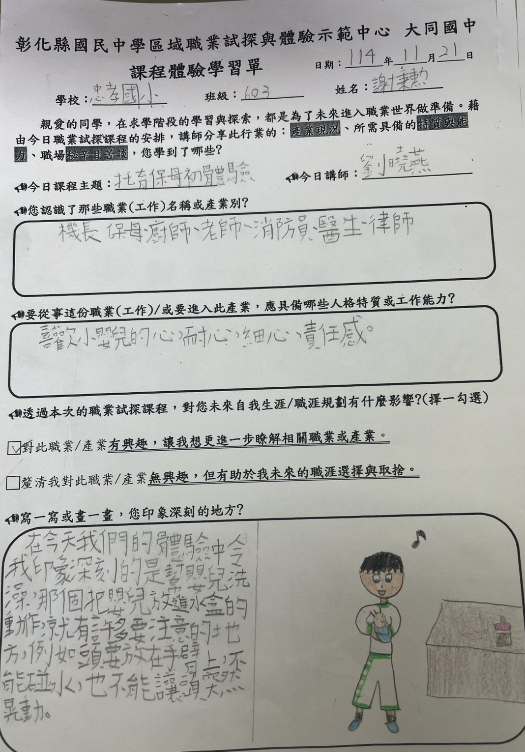 在體驗課程中,學到了如何照顧嬰兒,例如:抱嬰兒、洗澡、換尿布、和泡牛奶,也知道了父母照顧我們,非常辛苦!