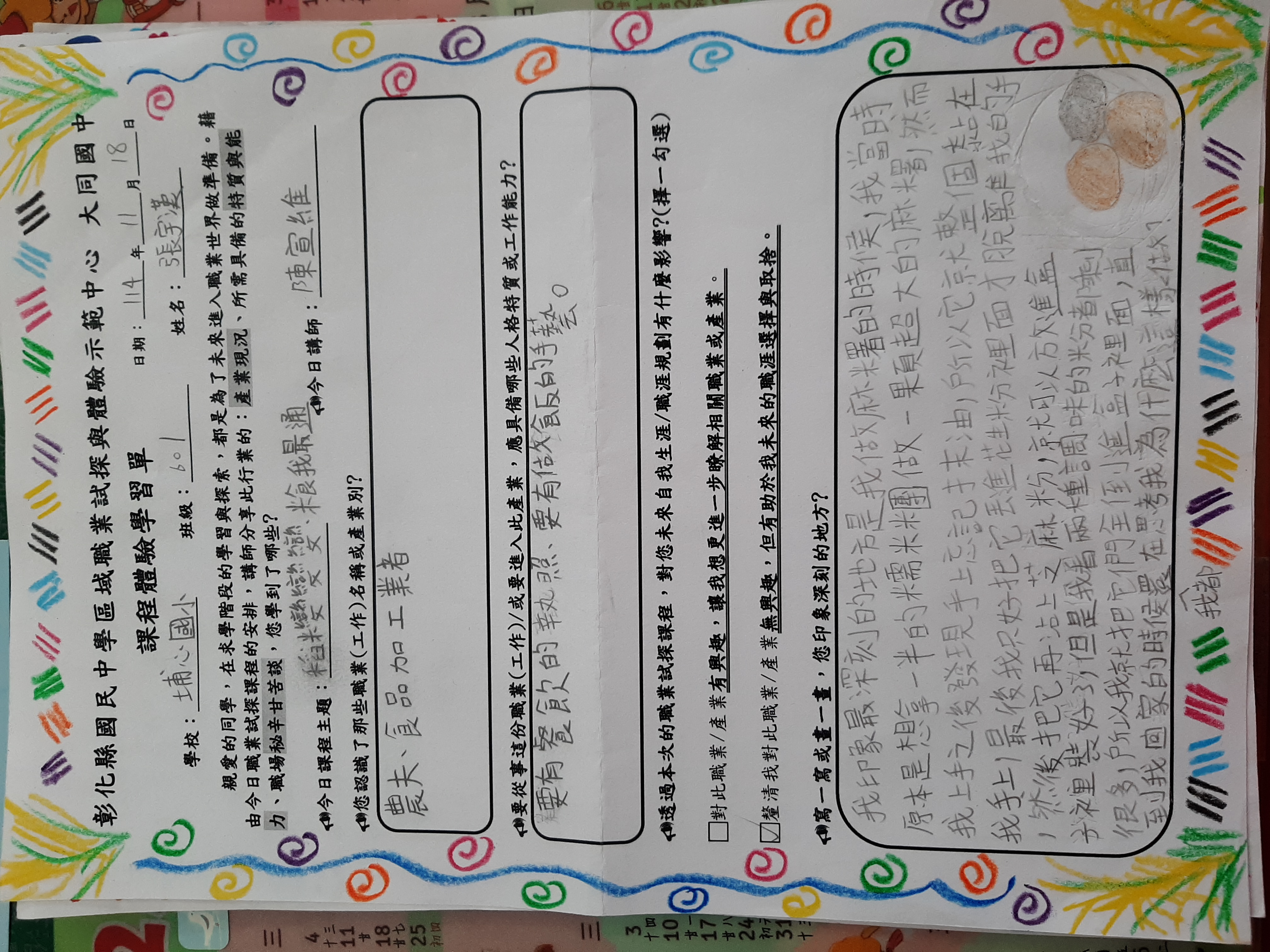 感謝大同國中職探中心安排的“稲米變變變,米食我最通”的課程,講師也很用心,解說很詳盡,學生們也很熱情參與,欲罷不能。希望再有機會參與其他活動課程,認識探索更多不同的職業。謝謝大同國中職探中心!