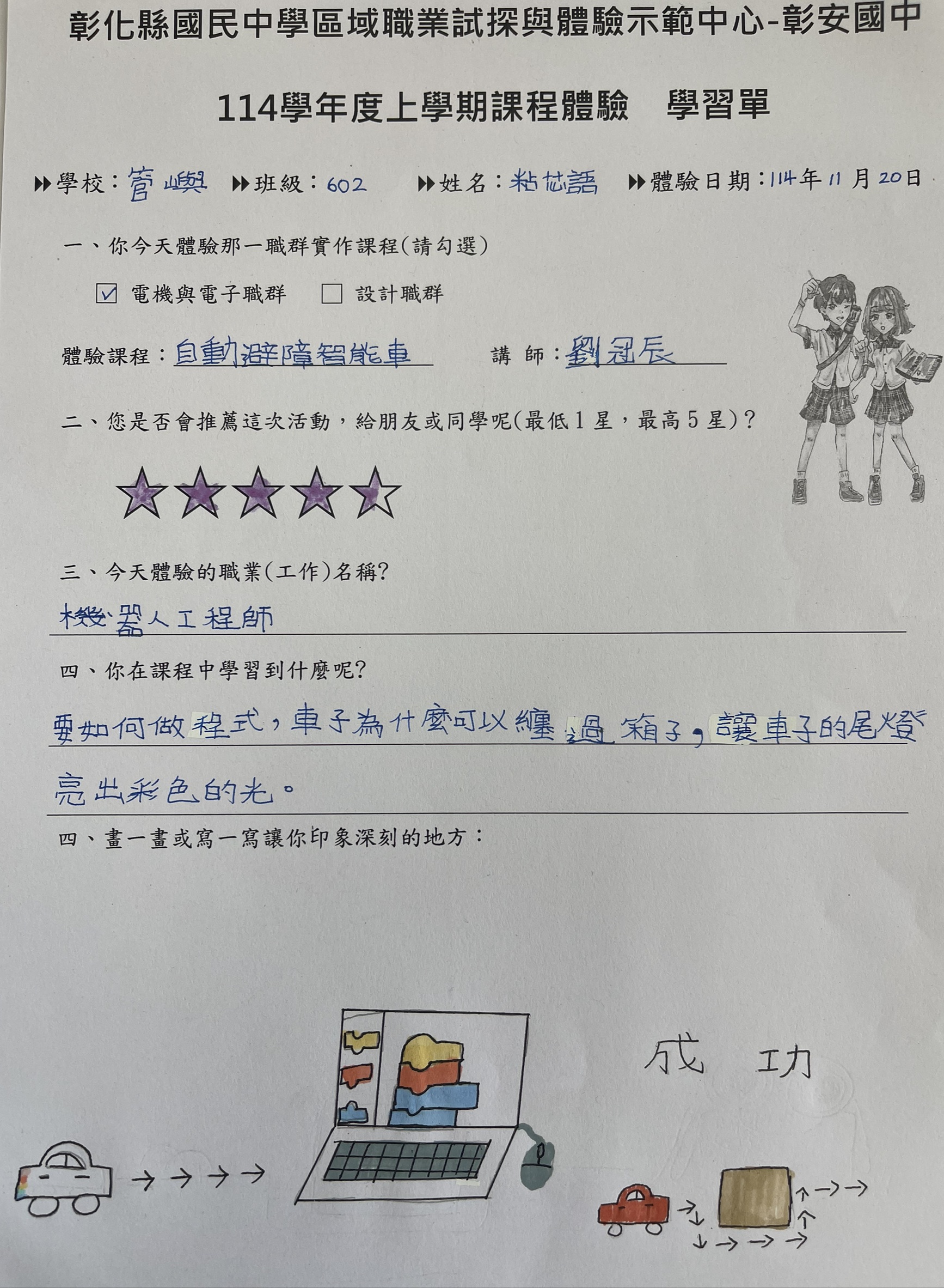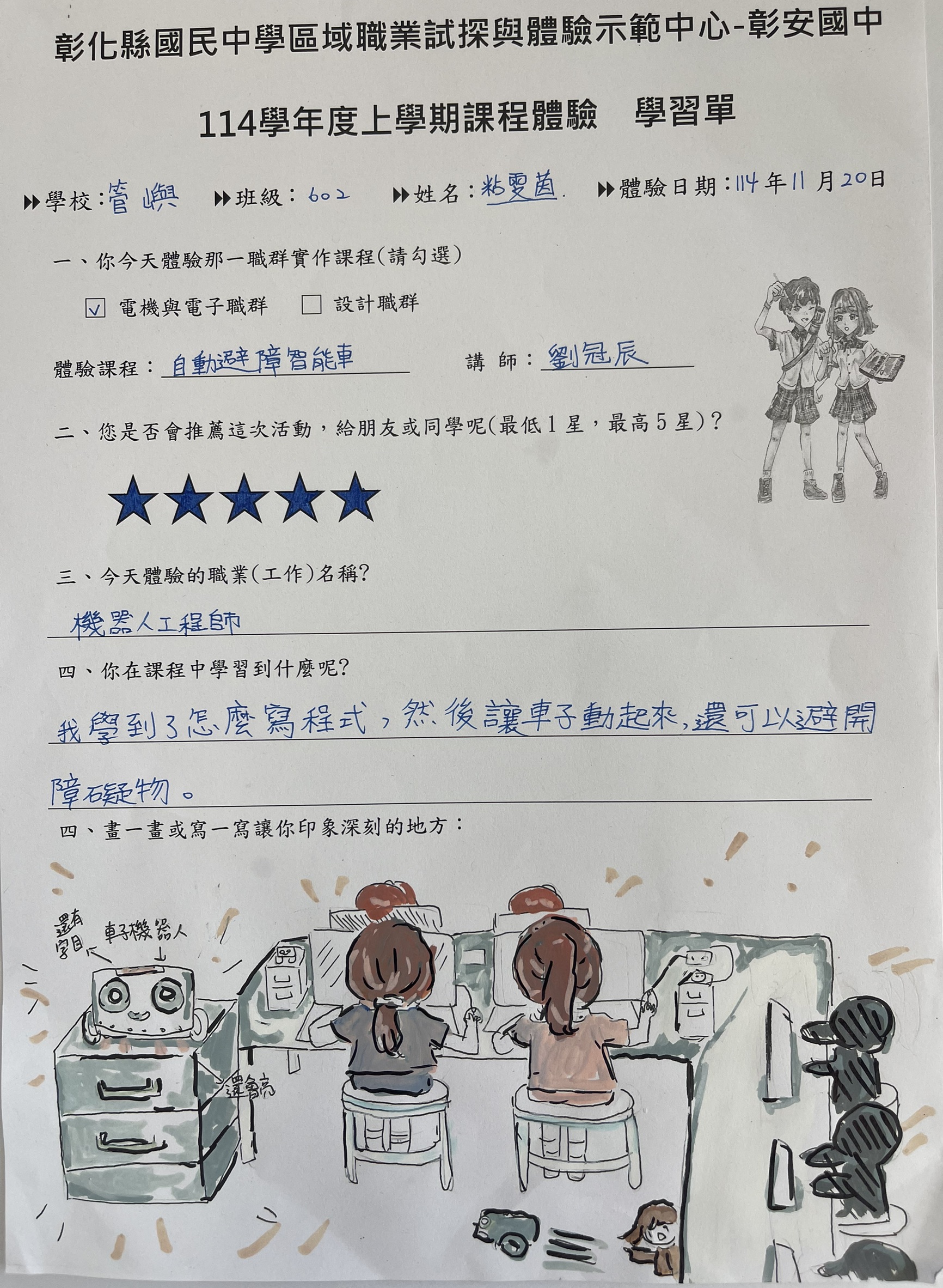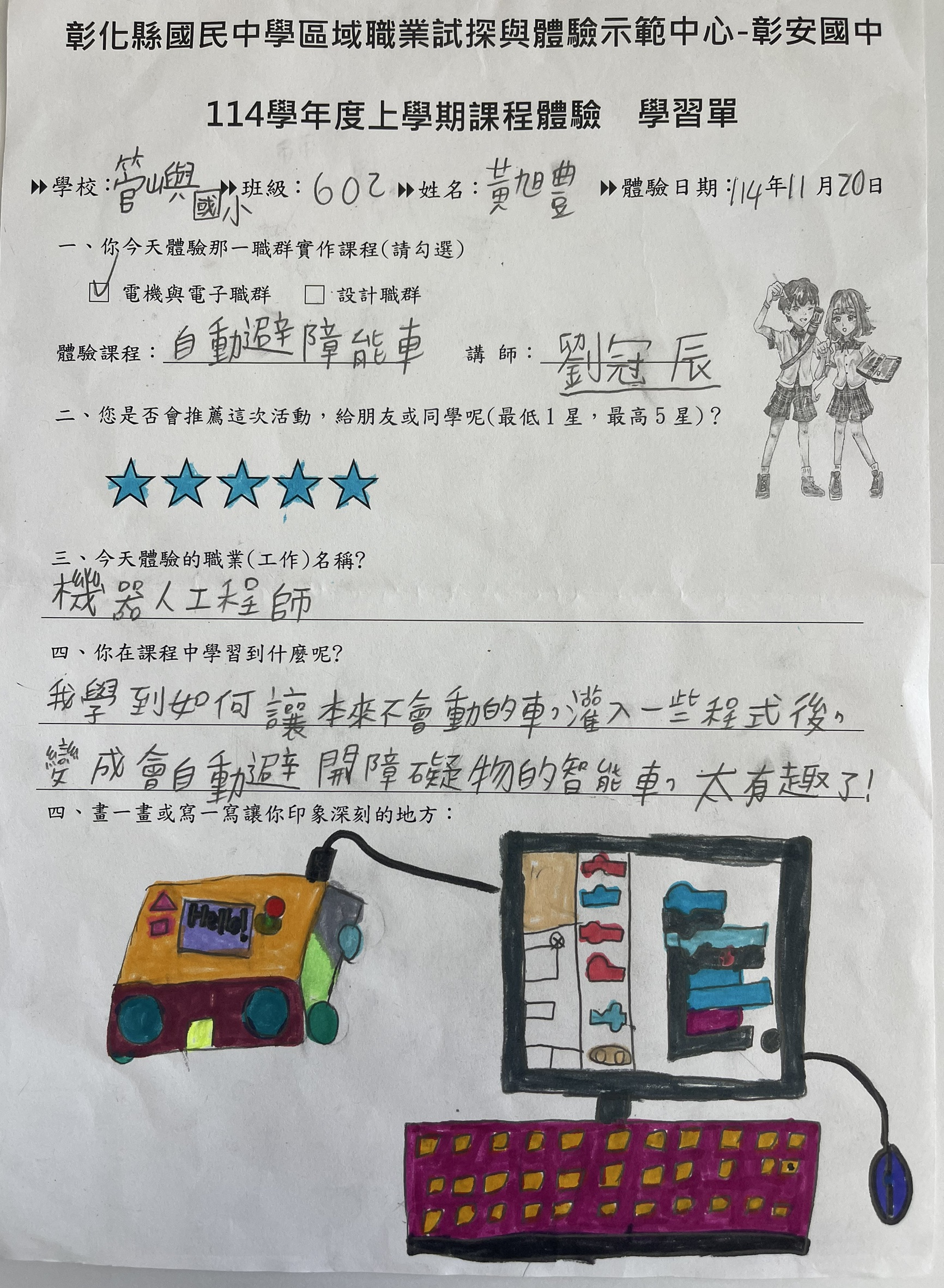 學生在學校有上scratch課程,對於程式設計堆疊方塊的使用方式,有初步的了解。這堂課介紹了機器人可以透過程式的輸入、更動,下指令讓機器人達成我們想要的動作(前進、後退、轉彎、避障、發出聲音、不同顏色的閃光......等),現在電腦的應用廣泛,有孩子的興趣就是跟電腦應用相關的科系,這個職探課程也能讓學生對於機器人工程師有初步的了解,讓學生獲益良多。