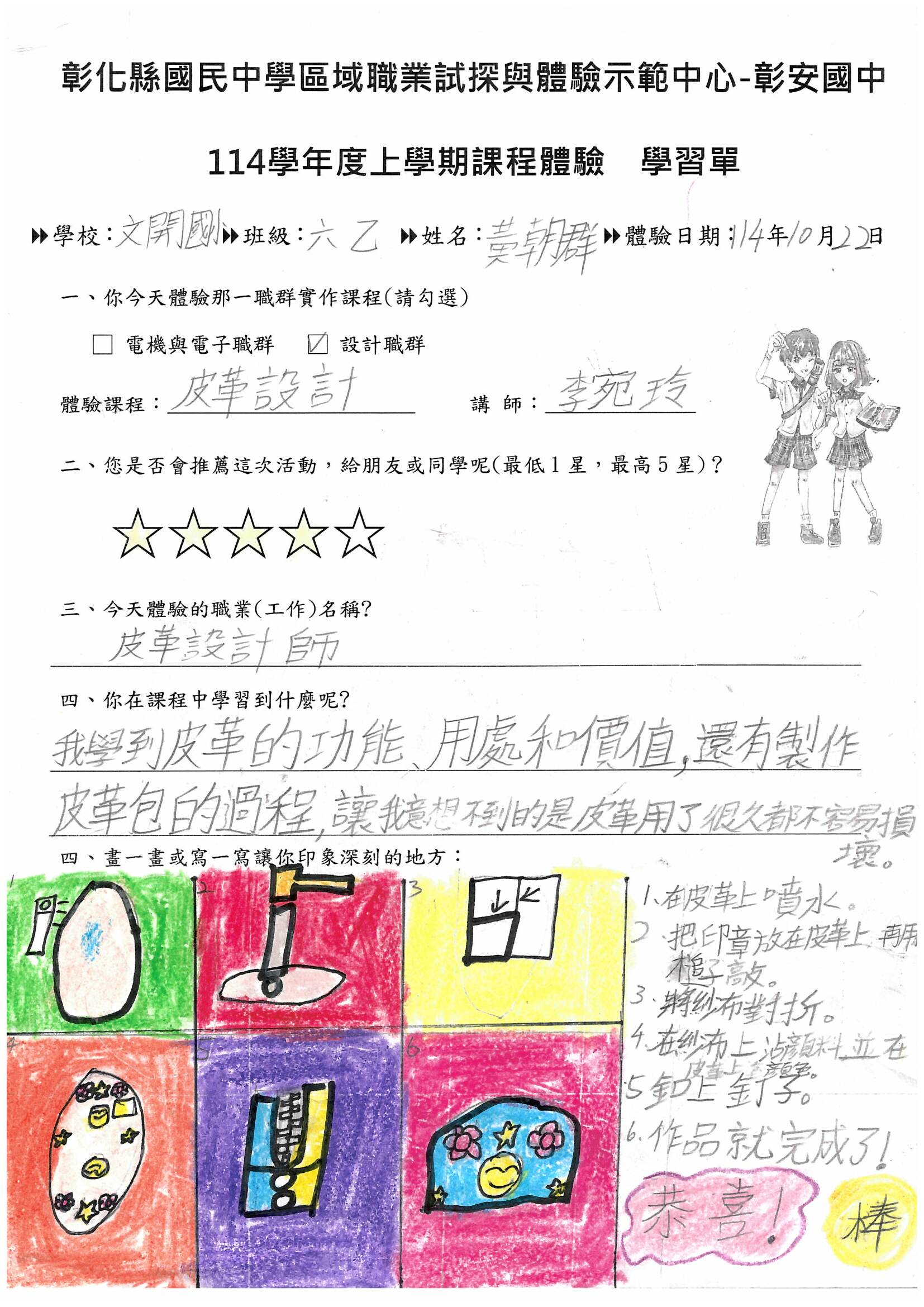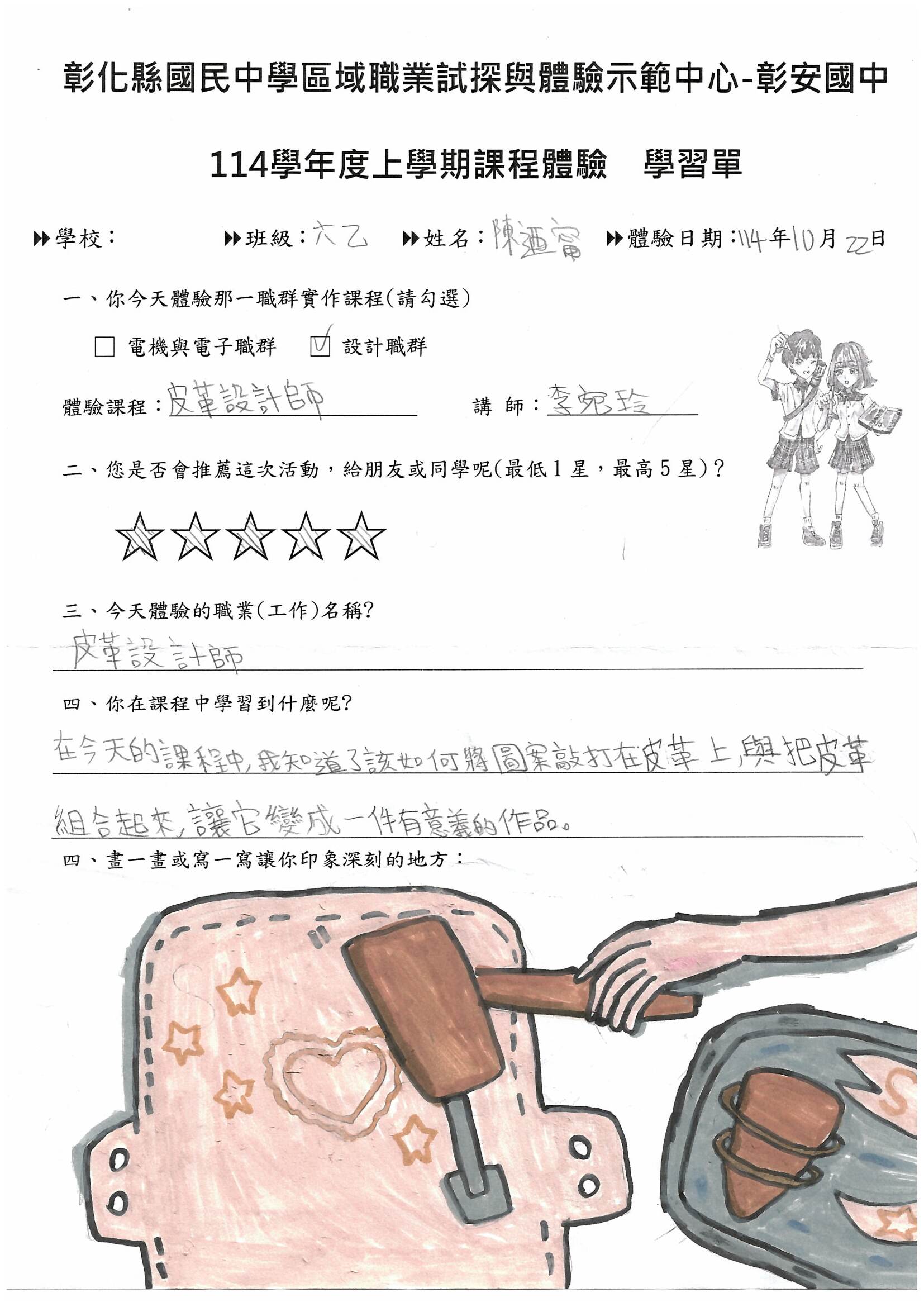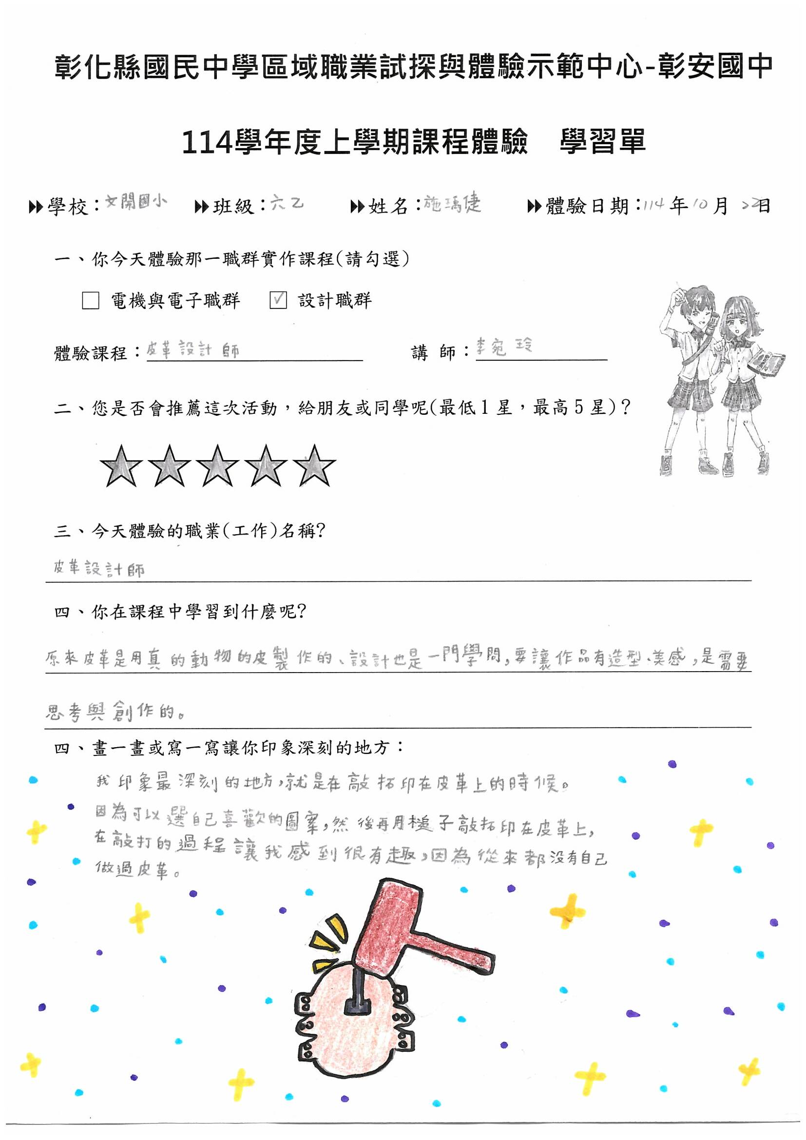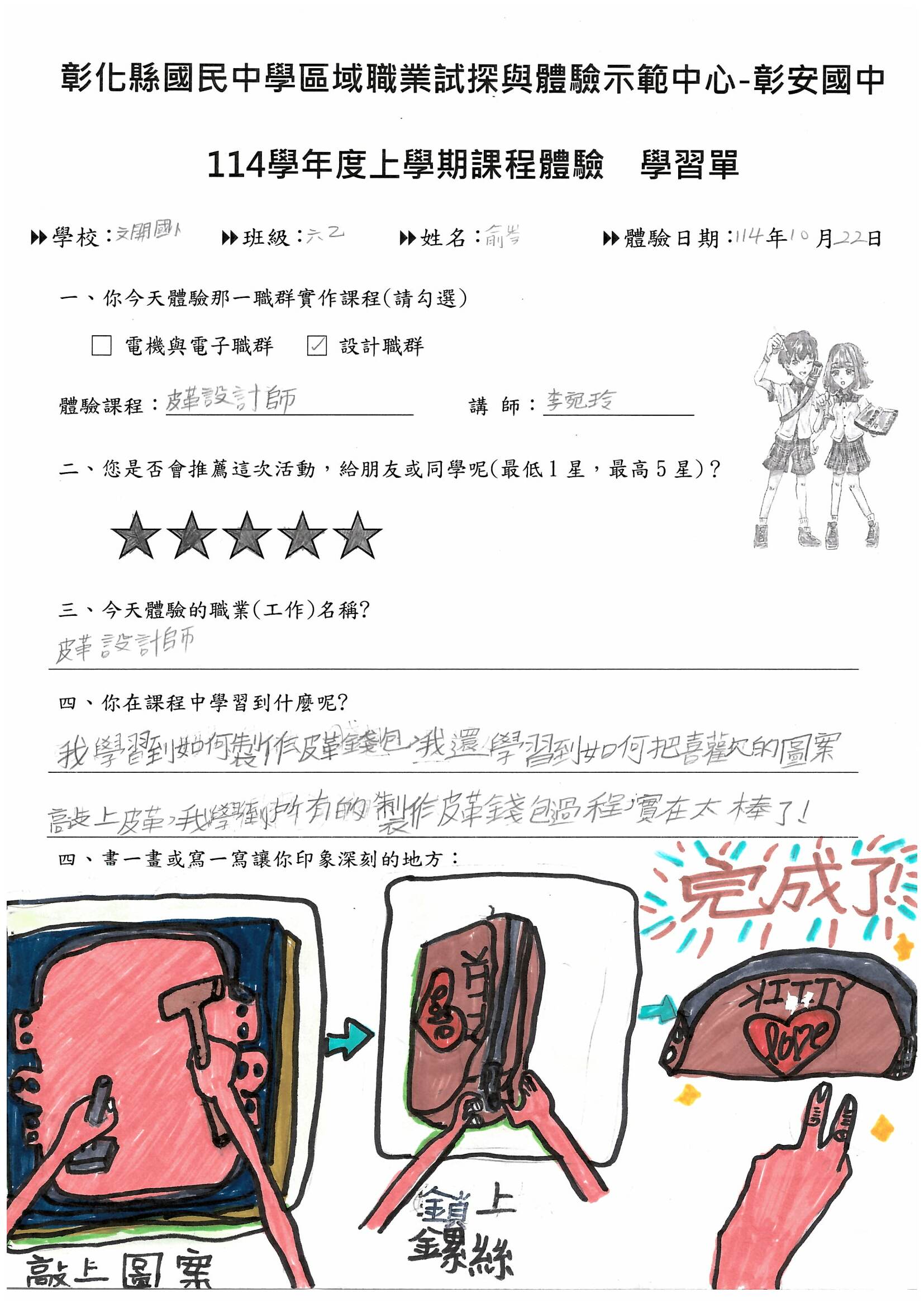 透過今日的課程介紹,學生瞭解了皮革的來源、用處及利用價值。透過實際動手做的過程,學生從選樣、敲打、染色,到組裝,最終創作出專屬於自己、獨一無二的皮革包,每個人都充滿成就感,也對今日的課程體驗,留下深刻的印象。感謝中心承辦人員、授課教師的用心,讓孩子收穫滿滿。