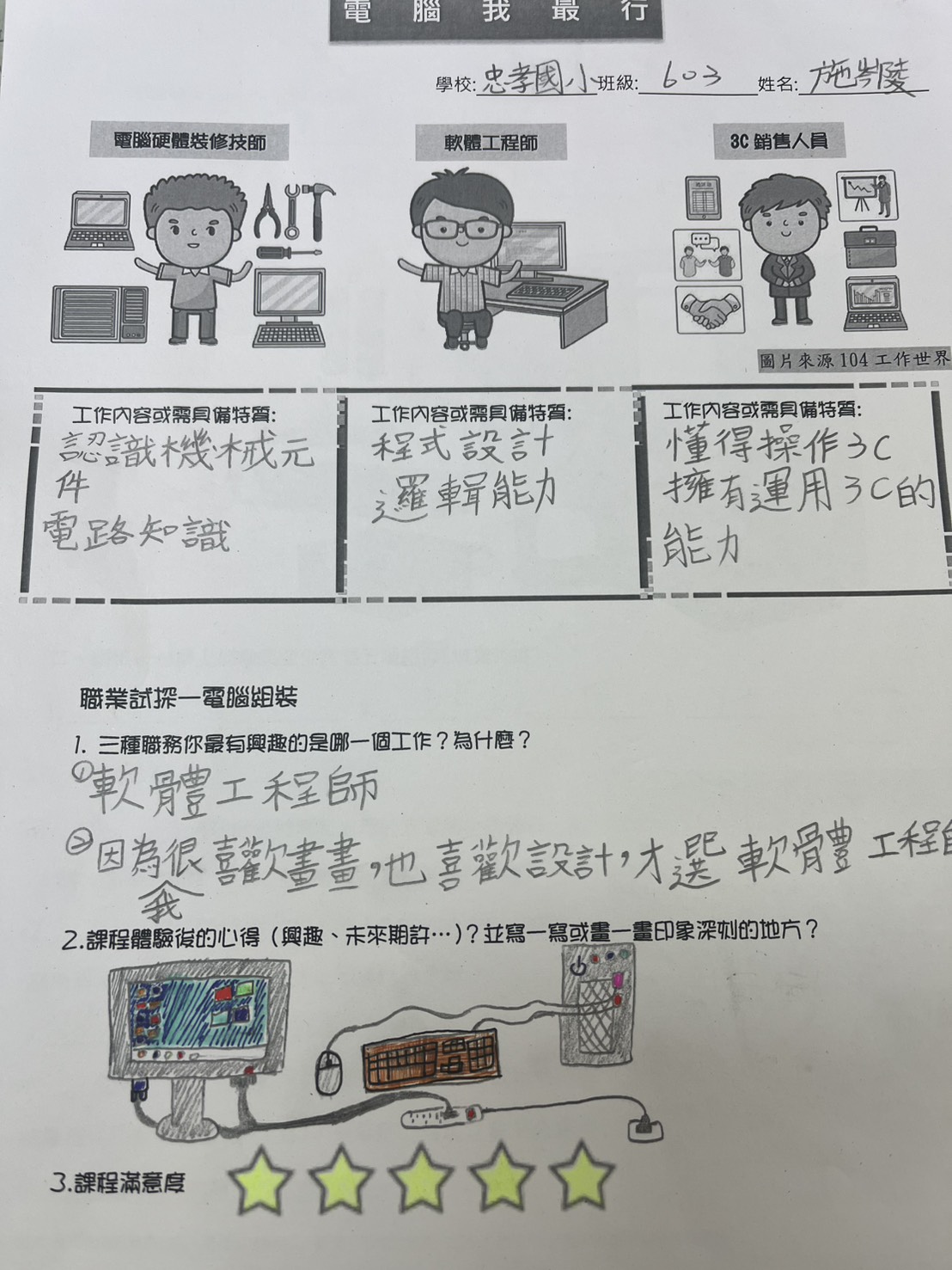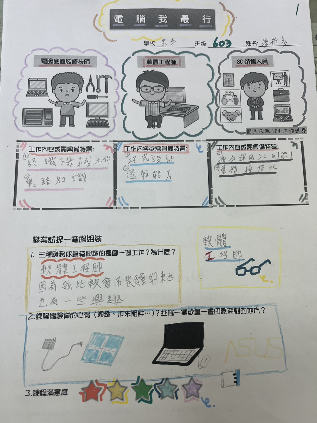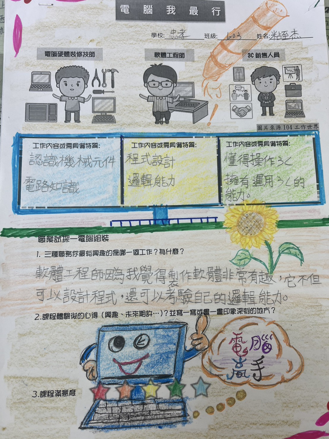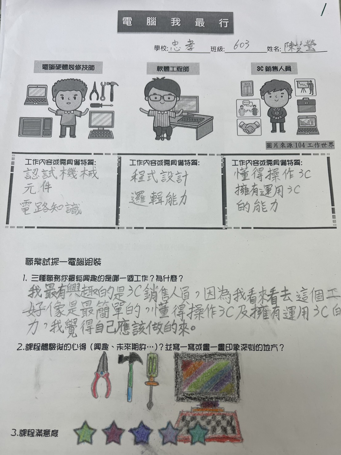 謝謝老師細心的教授我們各種電腦的硬體零件,也讓我們實際操作將電腦組裝完成,看到螢幕上看到成功進入系統,有一種莫名的成就感,謝謝老師,這節課讓我們受益良多!