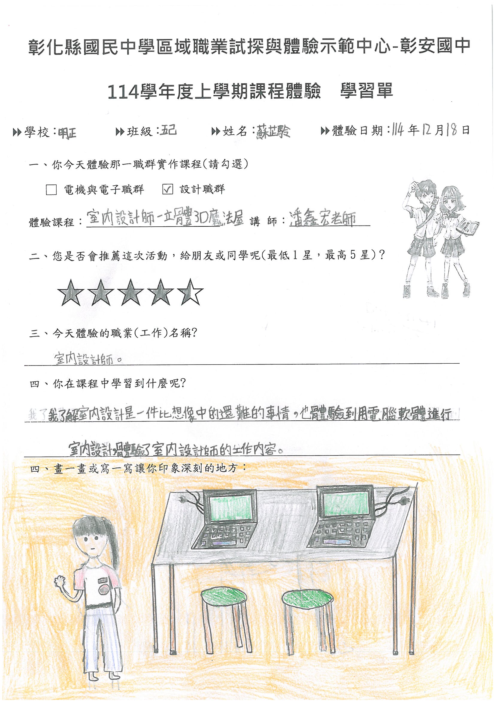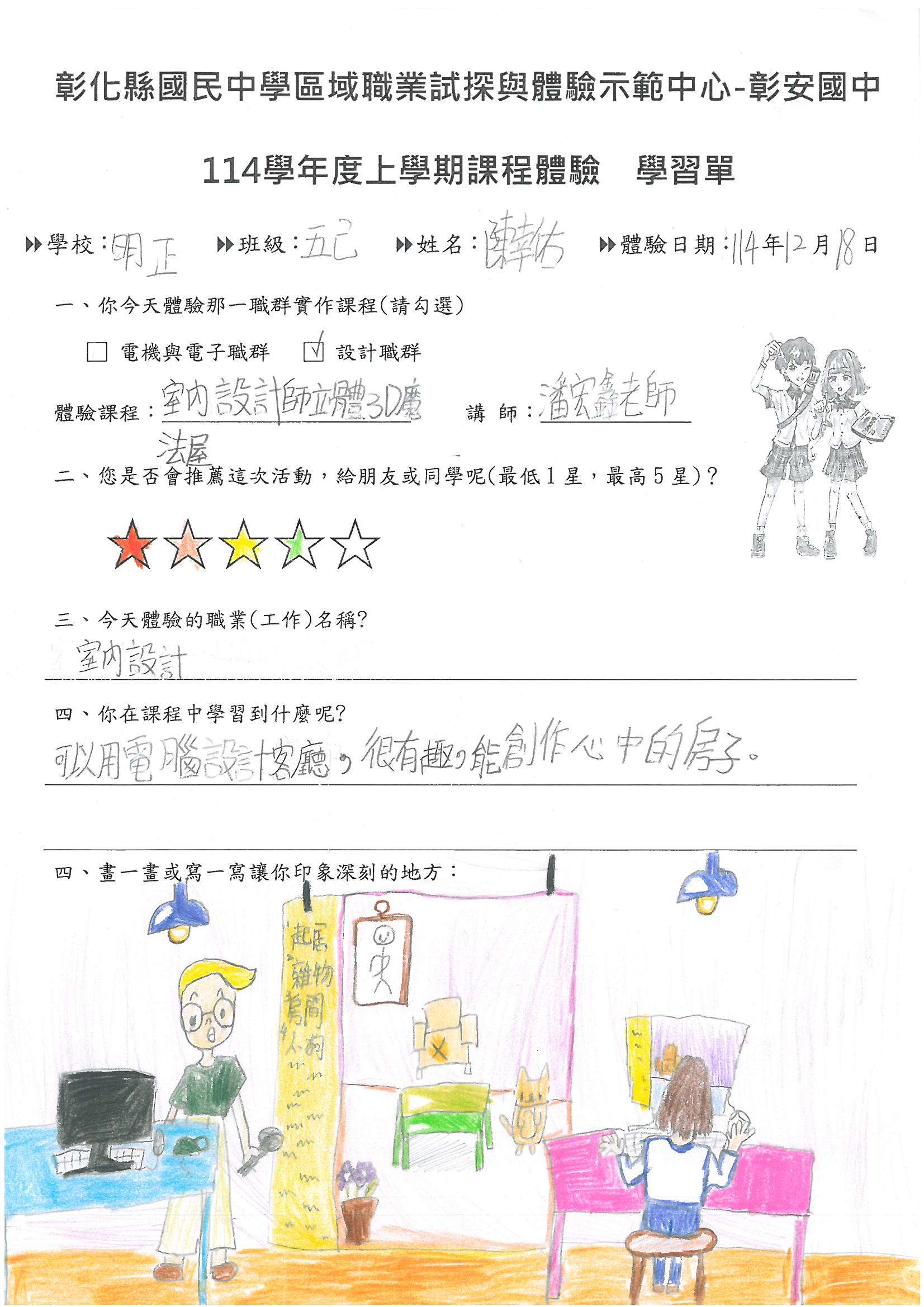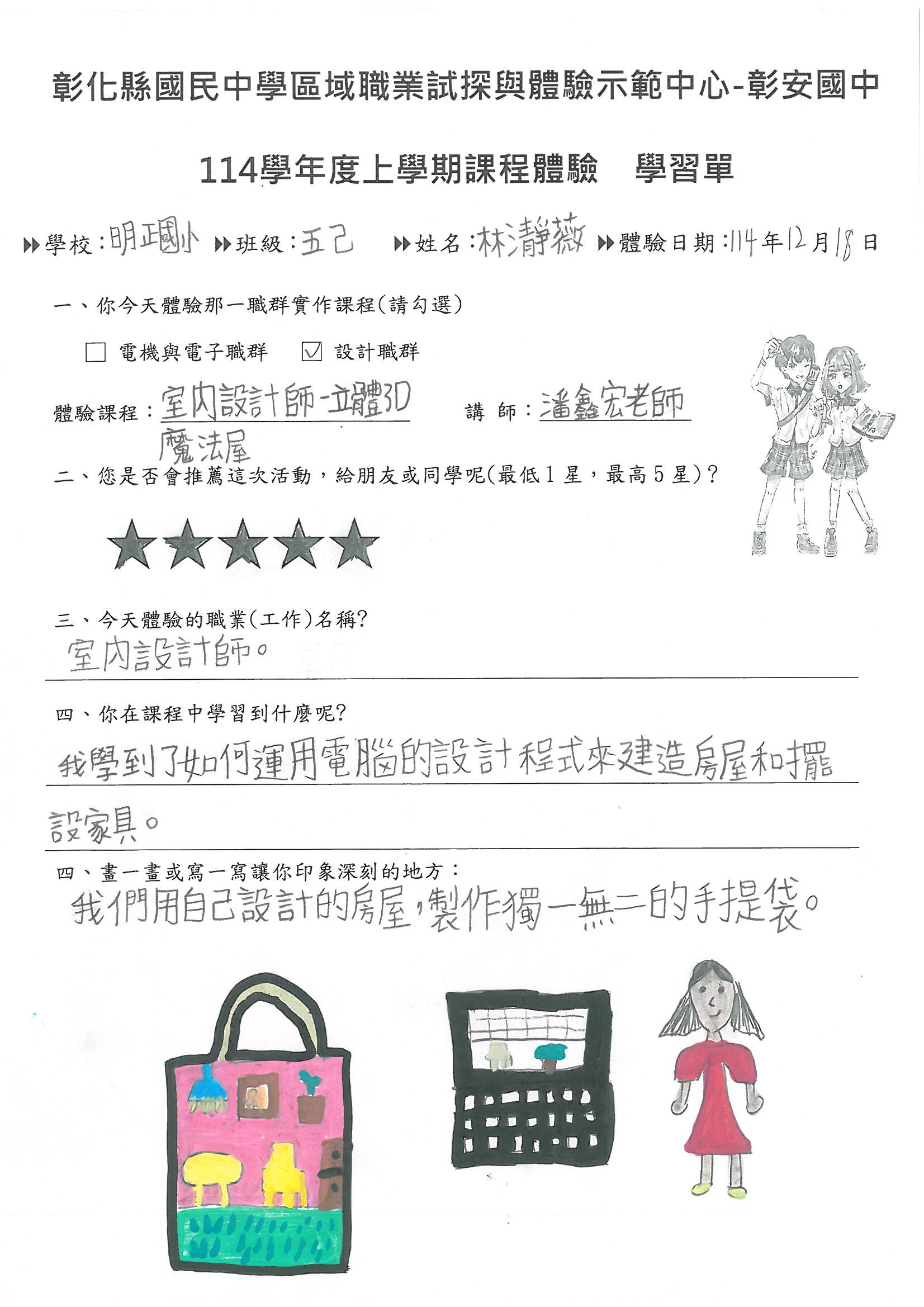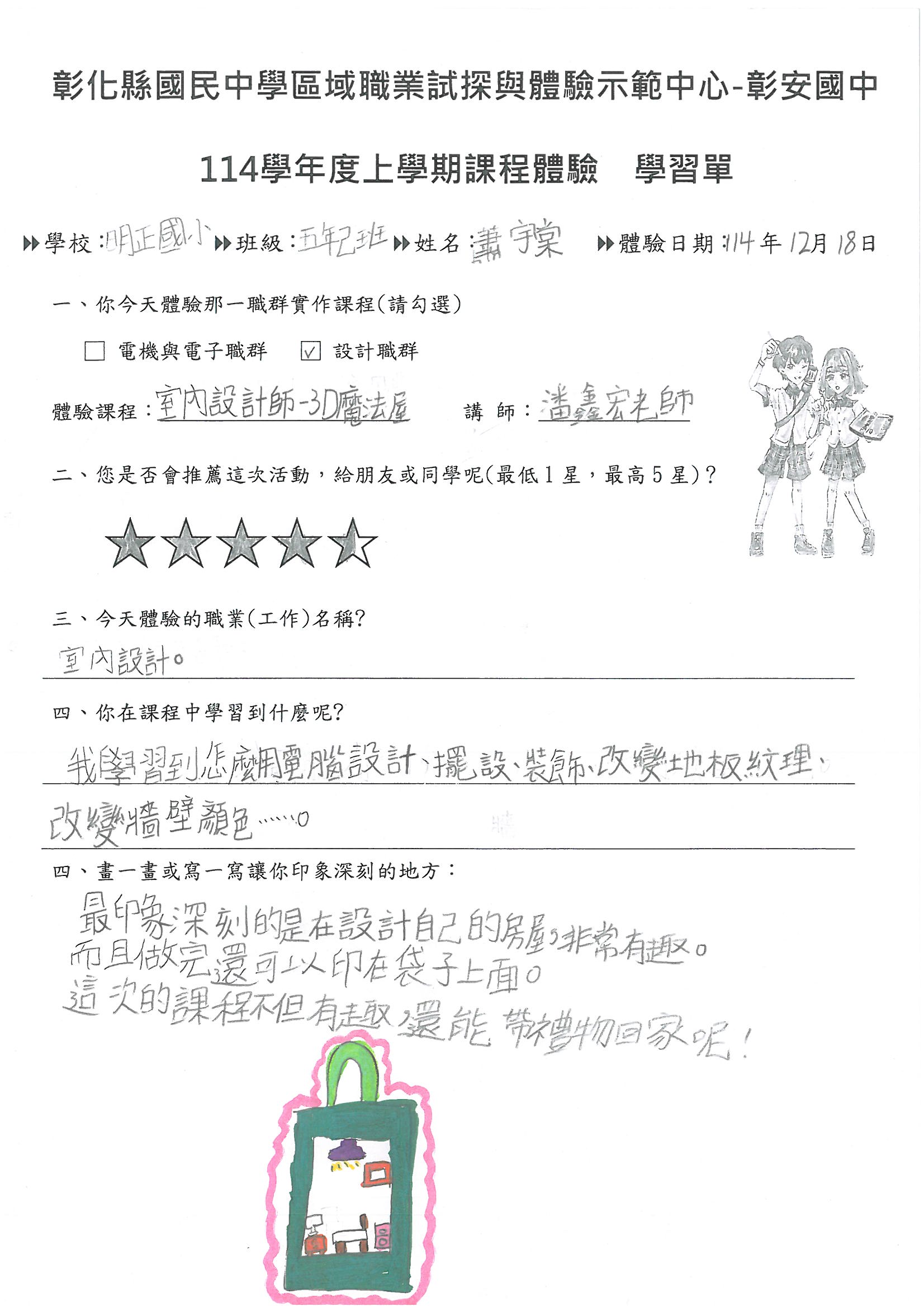 講師講解得很詳細,有的孩子覺得室內設計是一件比想像中還難的事,也體驗到用電腦軟體進行室內設計,最後還把自己的作品製作成獨一無二的小提袋上,孩子非常的開心。
