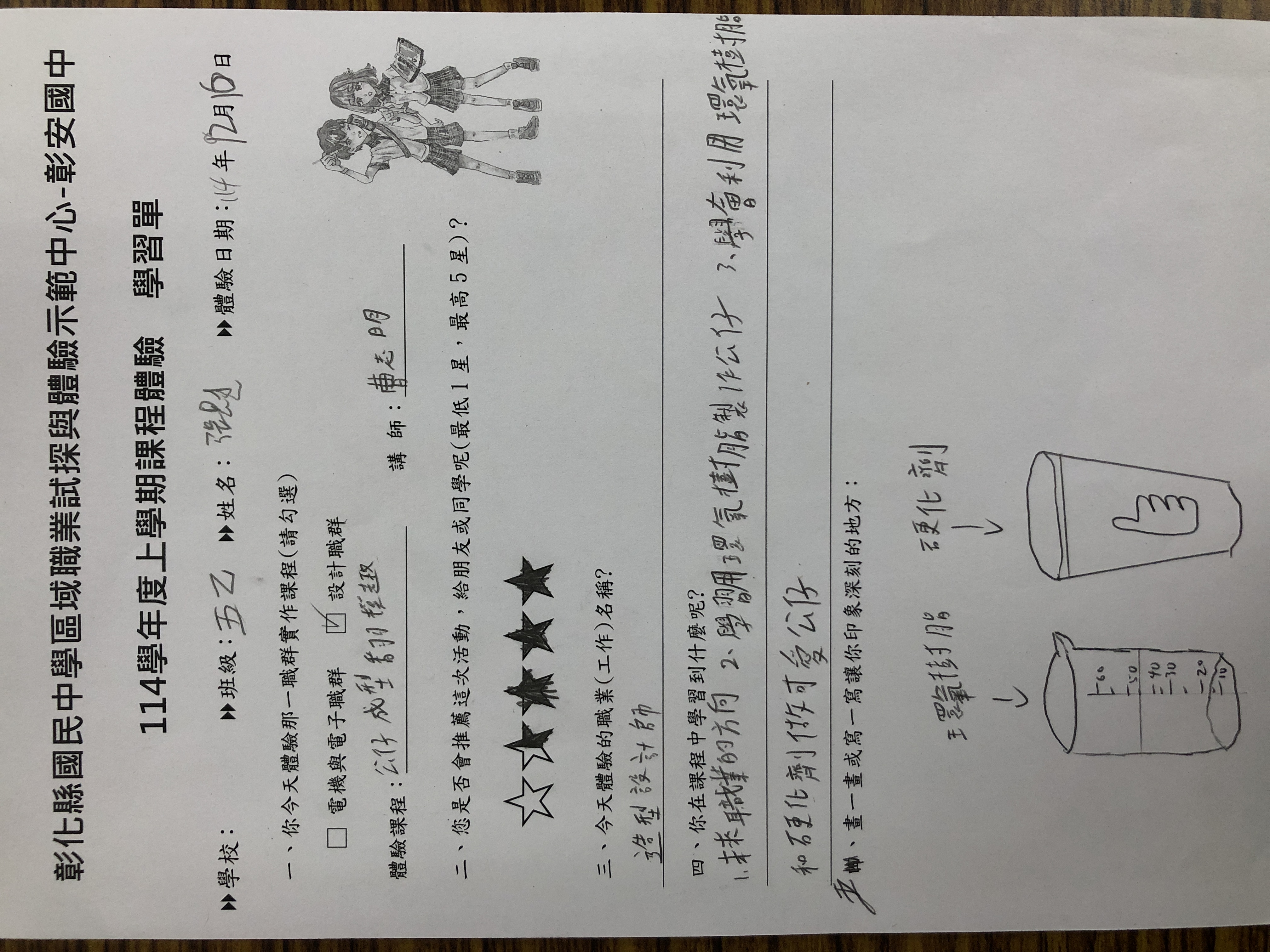 看到講師展示的可愛公仔,孩子們都迫不急待想擁有自己製作的公仔。在課程中,孩子們學到製作公仔的材料是環氧樹脂和硬化劑調和而成,接觸這些化學原料必須採取一些安全措施,攪拌材料時要輕敲杯子,減少氣泡,這樣製作完成的公仔才能很完美喔!感謝彰安職探中心讓孩子們探索未來的職業,早日找到適合自己的方向。