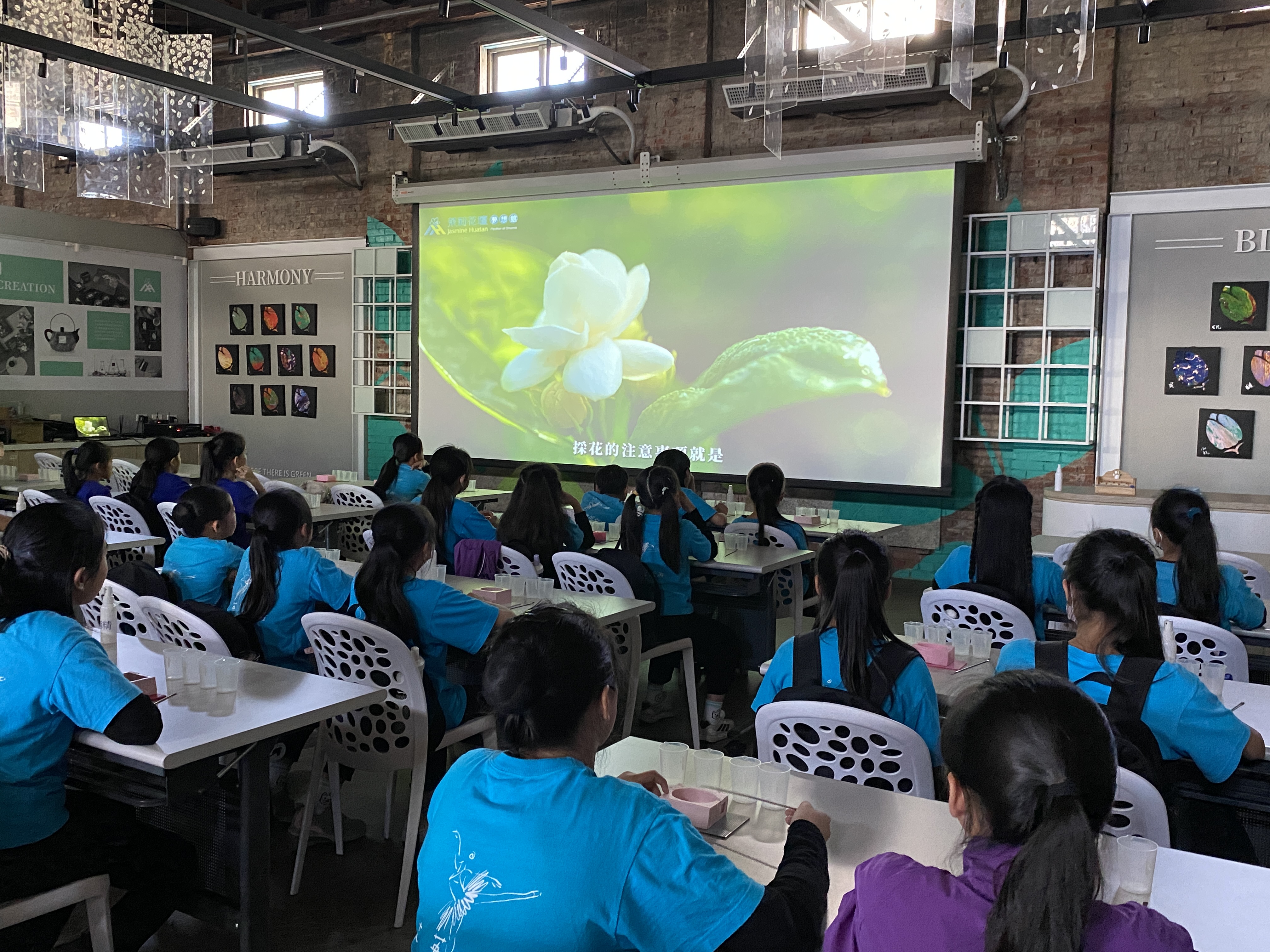 今天我們去參觀茉莉花夢想館,一走進去就看到濃濃的歐式風格彩繪牆面,讓人一秒到國外。導覽老師先介紹茉莉花是怎麼種的,還告訴我們茉莉花可以做成茶、精油和香皂,原來一朵小小的花也能變成很多生活用品。