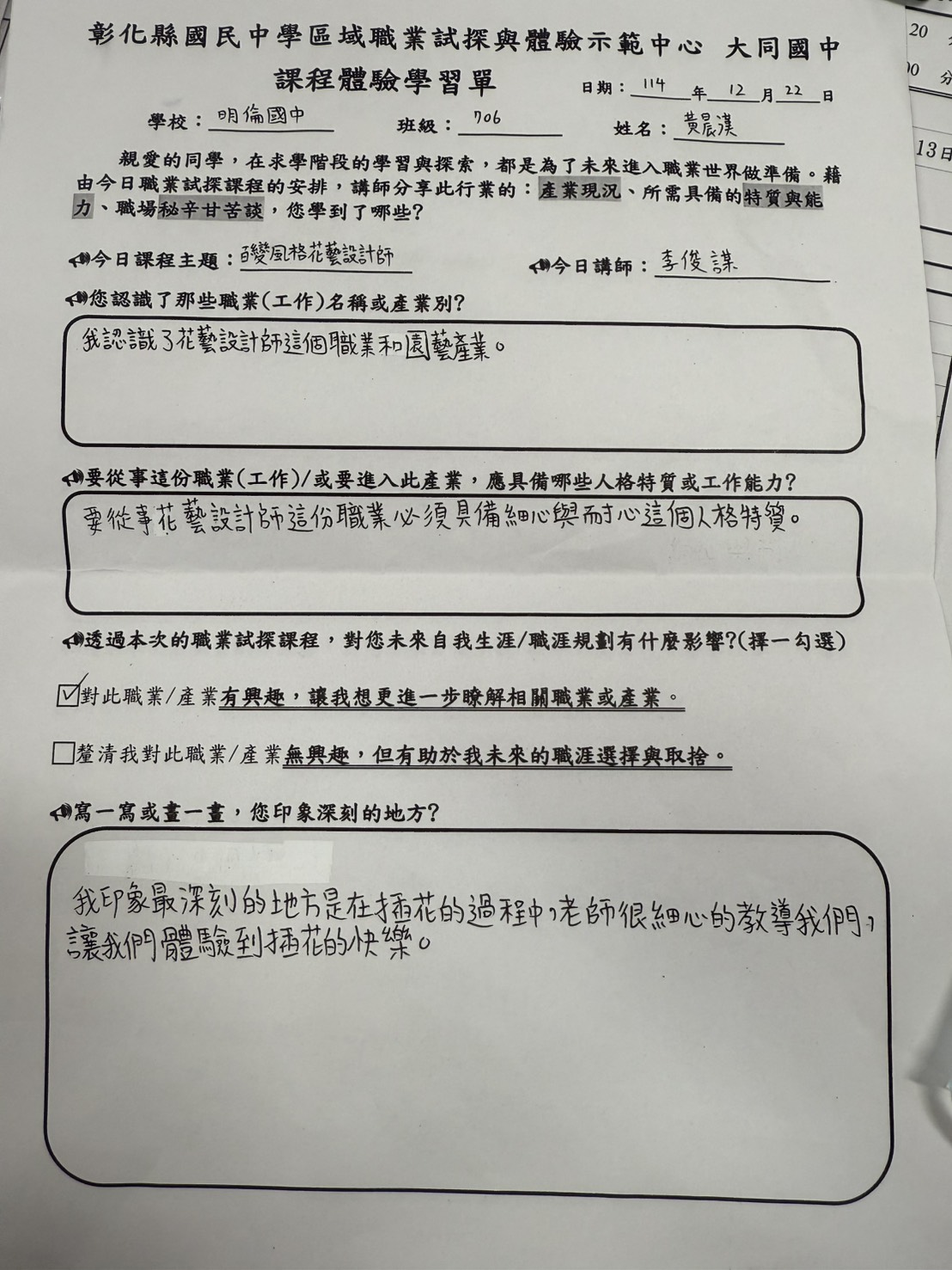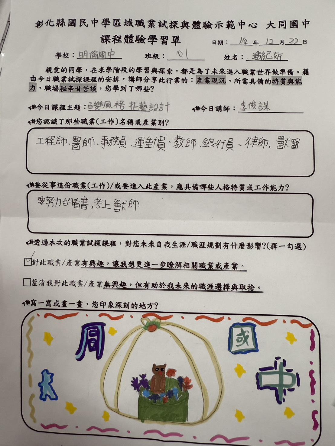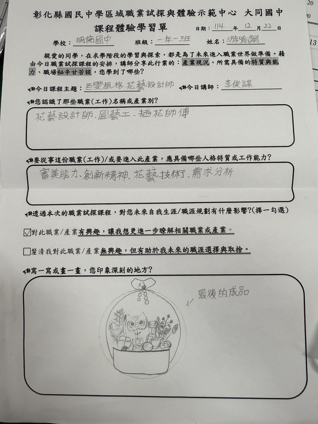 課程內容是做聖誕花環,介紹配色建立美感教育,對於學生身心及生涯有正向助益,感謝!