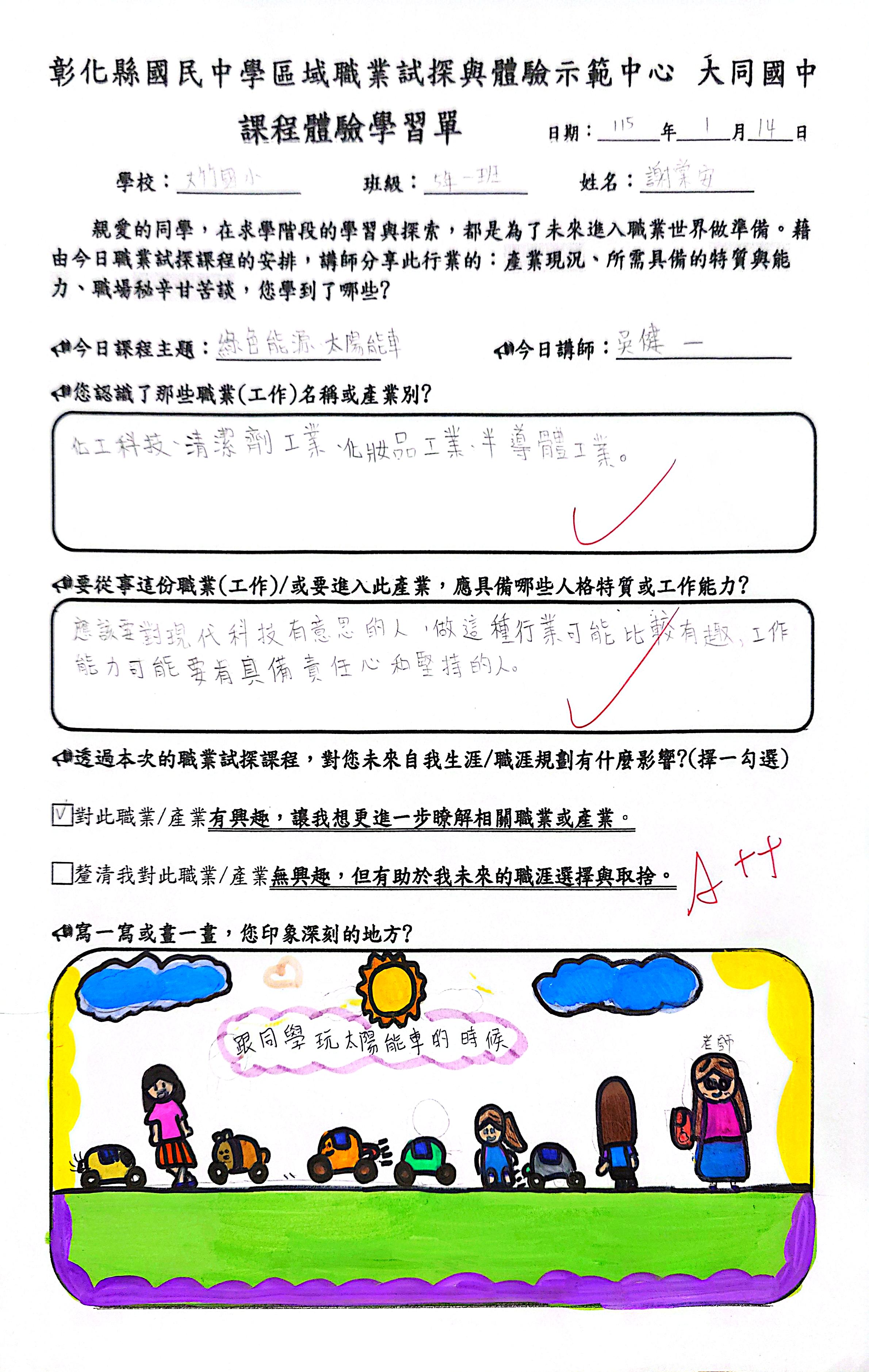 透過老師詳細的說明,我們知道了化工在手中的運用,也知道清潔劑和化妝品的不同。更透過實作製作了自己的太陽能小車,覺得非常有趣。