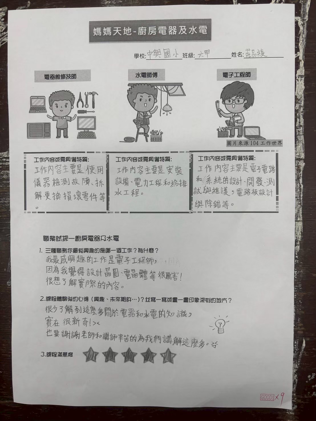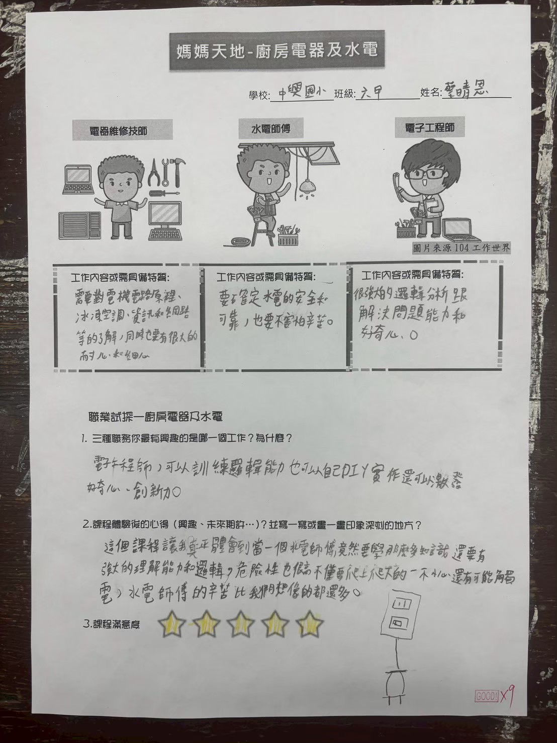 六甲蔡O恩:這個課程讓我真正體會到當一個水電師傅竟然要學那麼多知識,還須具備強大的理解力和邏輯,除此,工作中不僅要爬上爬下,還可能會觸電,很有危險性,他們的辛苦比我們想像的還多。