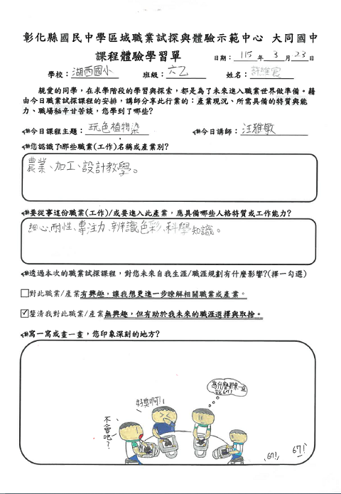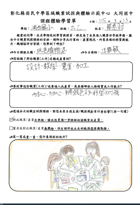 本次活動的課程透過親手實作,讓學生認識染織產業的職業內涵。老師介紹了多種天然染料,如墨水樹、洋蔥皮、檳榔等,學生們驚訝的發現,日常生活中平凡的素材,竟能萃取出如此的色彩。感謝主辦單位,讓學生於活動中習得染織基礎技能,更在他們心中種下職業探索的種子,透過這場感官與技藝的饗宴,學生學會了尊重自然、珍視工藝,也對未來多元職涯的可能性有了更深刻的體會。