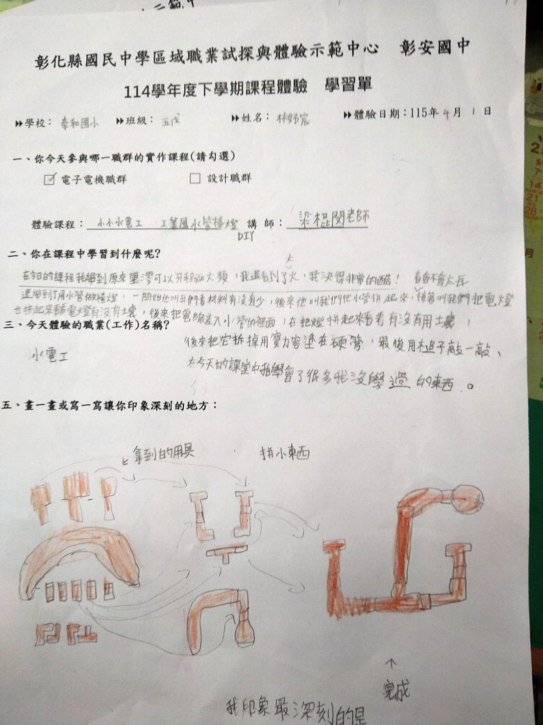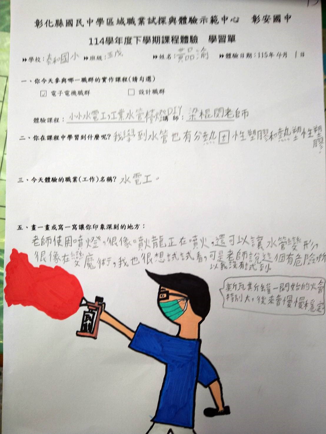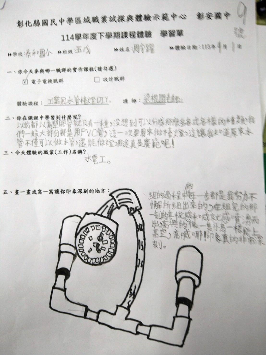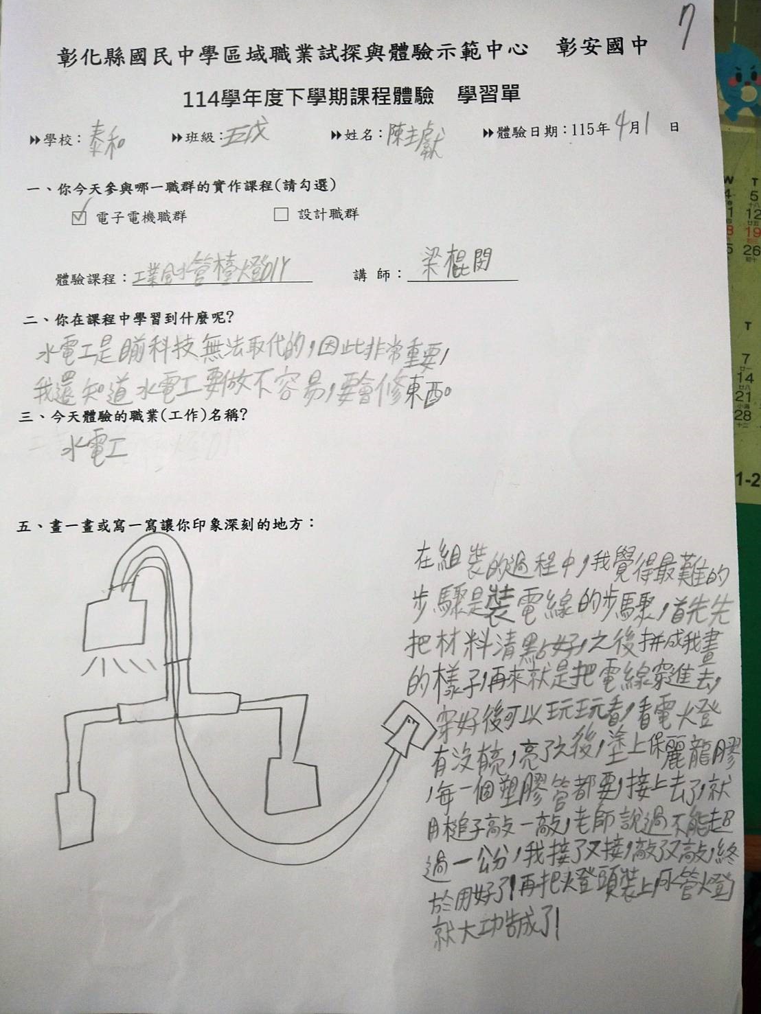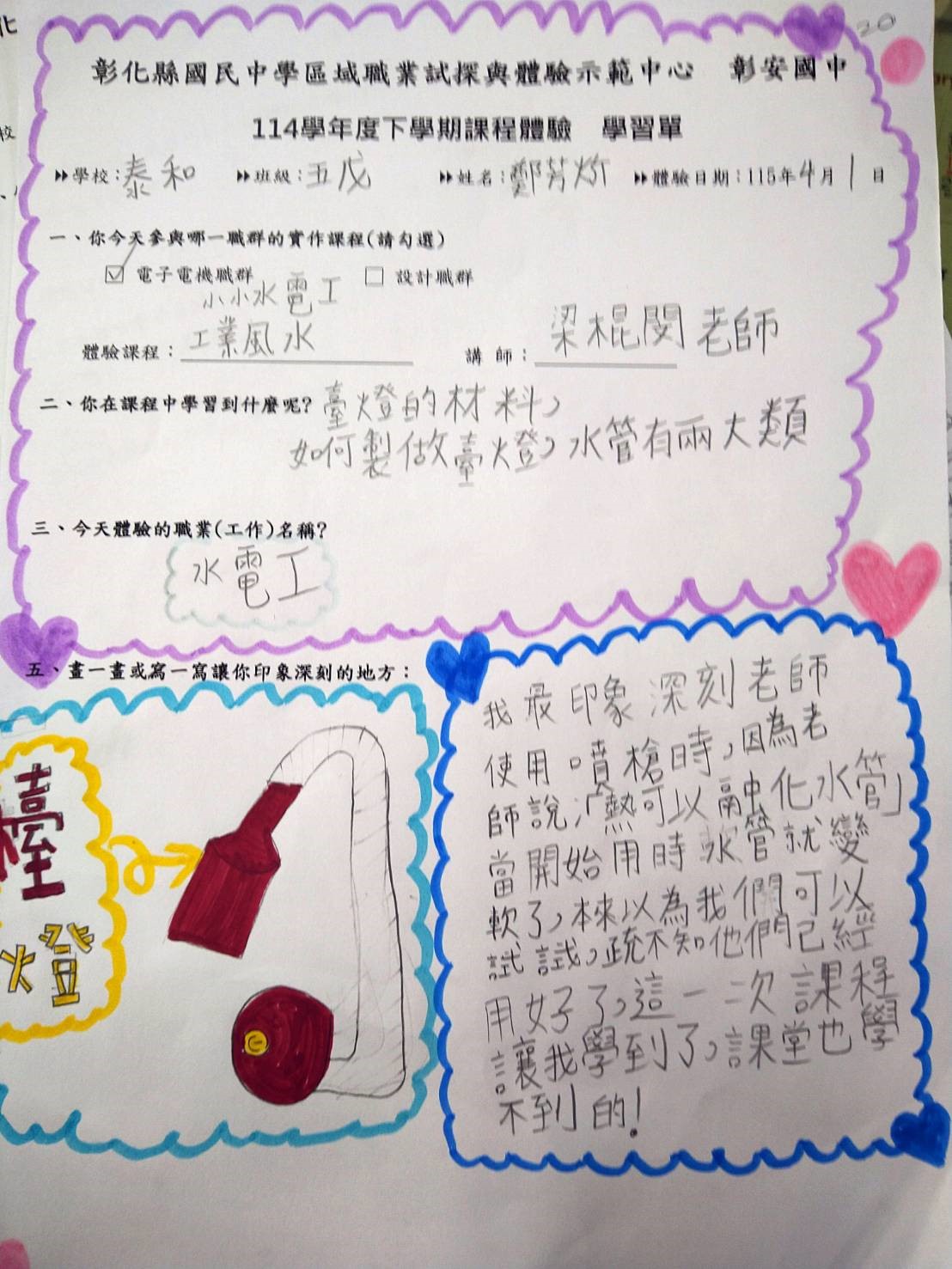 天啊!用PVC管制做成檯燈!超級酷!非常感謝有這樣職探的活動,除了讓孩子們更了解生活知識及各行業的辛苦外,老師我自己也體驗及學到許多呢!非常有助於教師的自我提升。謝謝辛苦作業,協助我許多難題的彰安國中職探中心老師,謝謝幽默風趣且教學用心梁老師,他帶領了兩個厲害、帥氣的小幫手,幫孩子們上了一堂開心又收穫良多的一堂職探課程。謝謝您們!