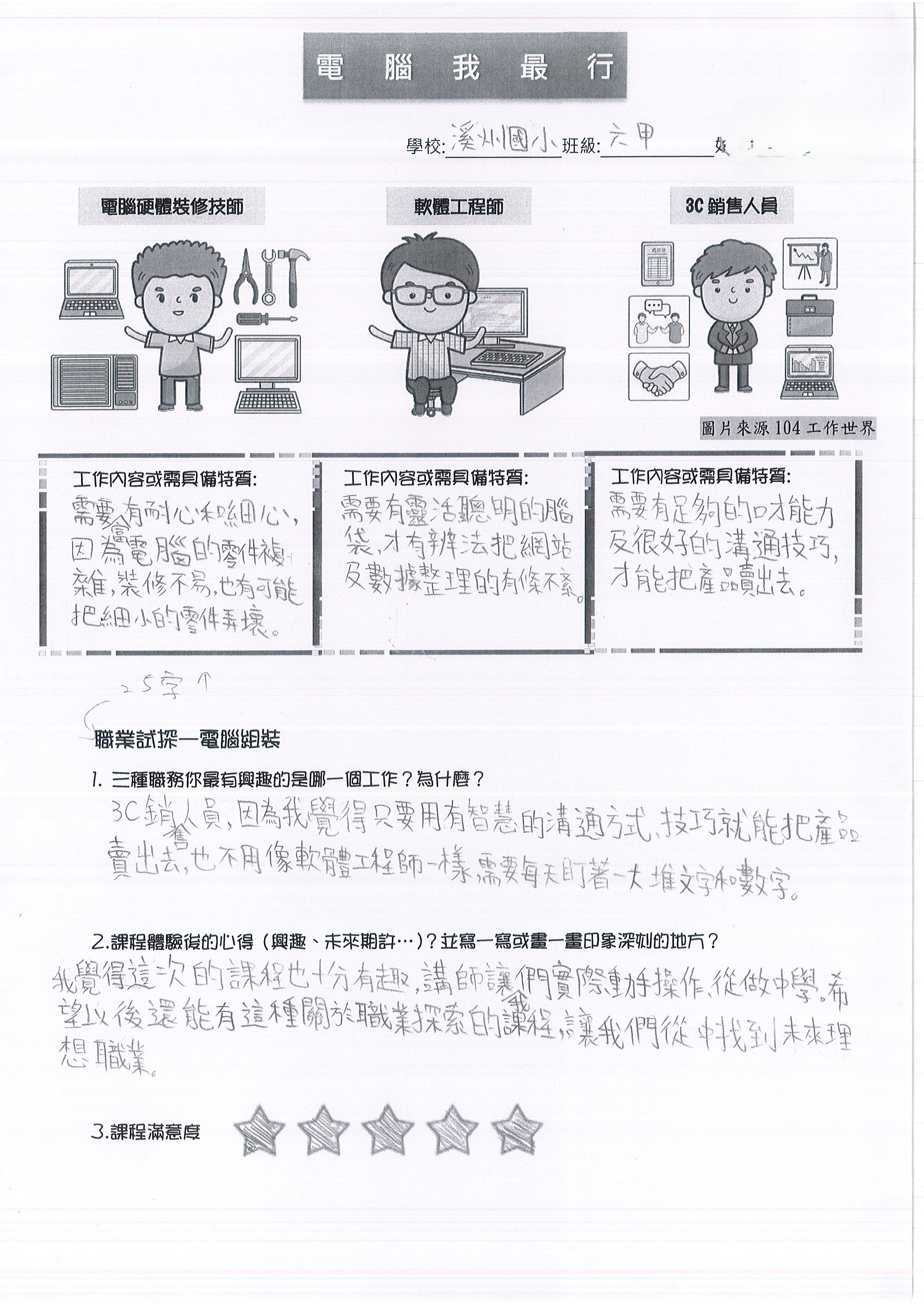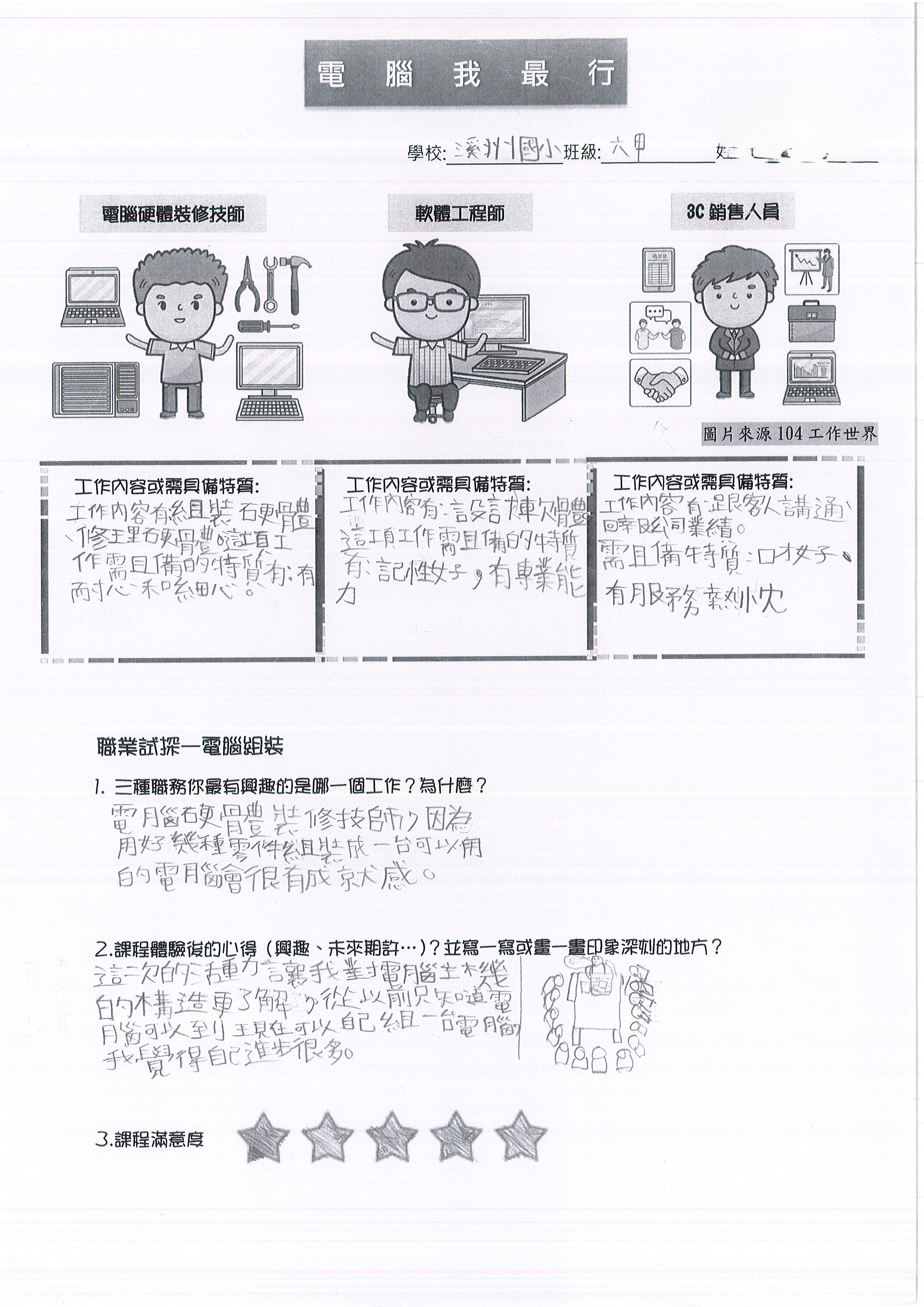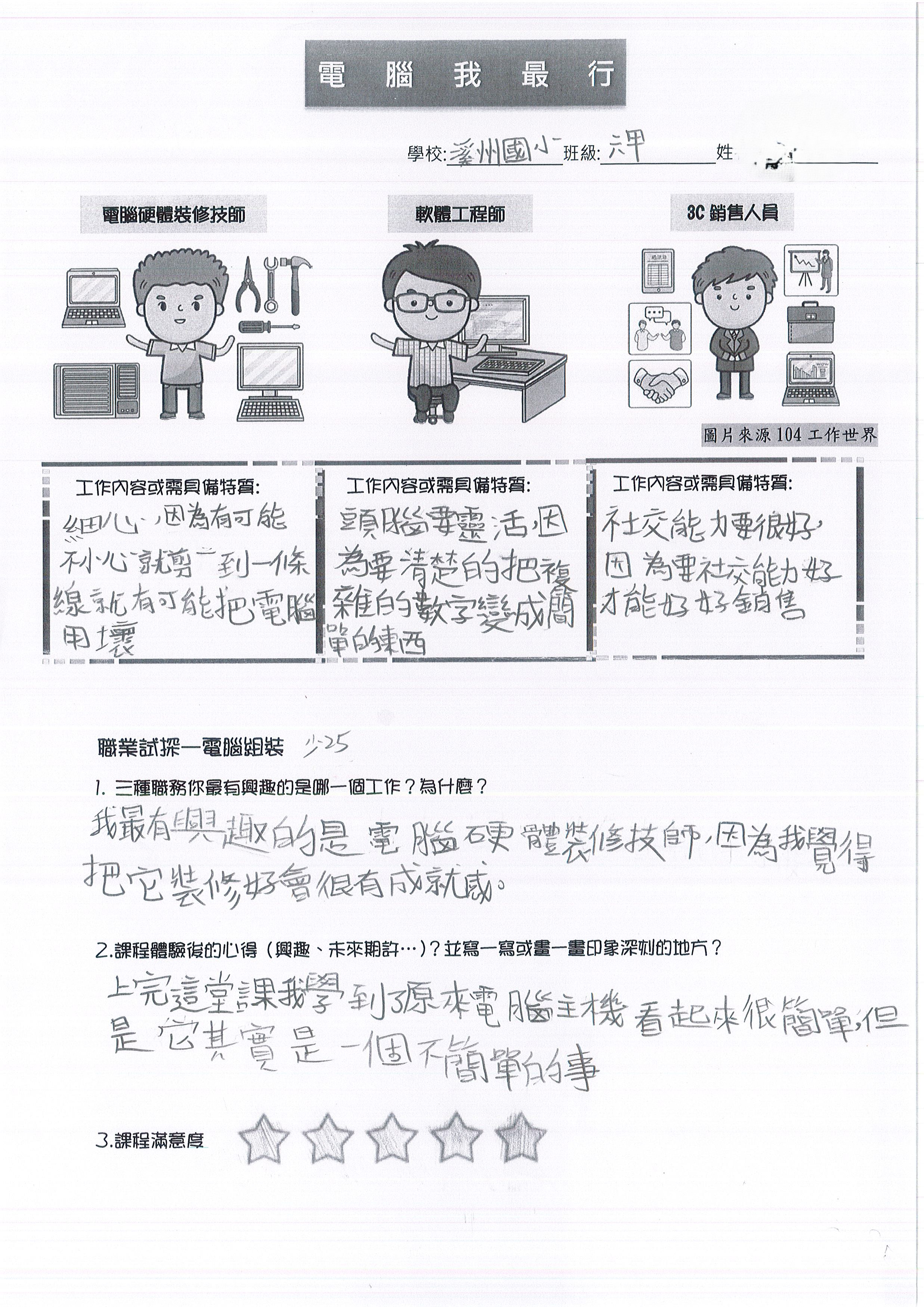 「我最感興趣的工作是『電腦硬體裝修技師』,因為我覺得能把它修好會很有成就感!課程中我了解,硬體技師需要具備『細心』,因為如果稍微不小心,就有可能剪斷一條線,甚至把整台電腦弄壞。上完這堂課,我學到原本以為看起來很簡單的電腦主機,但其實是一件很不簡單的事情!」