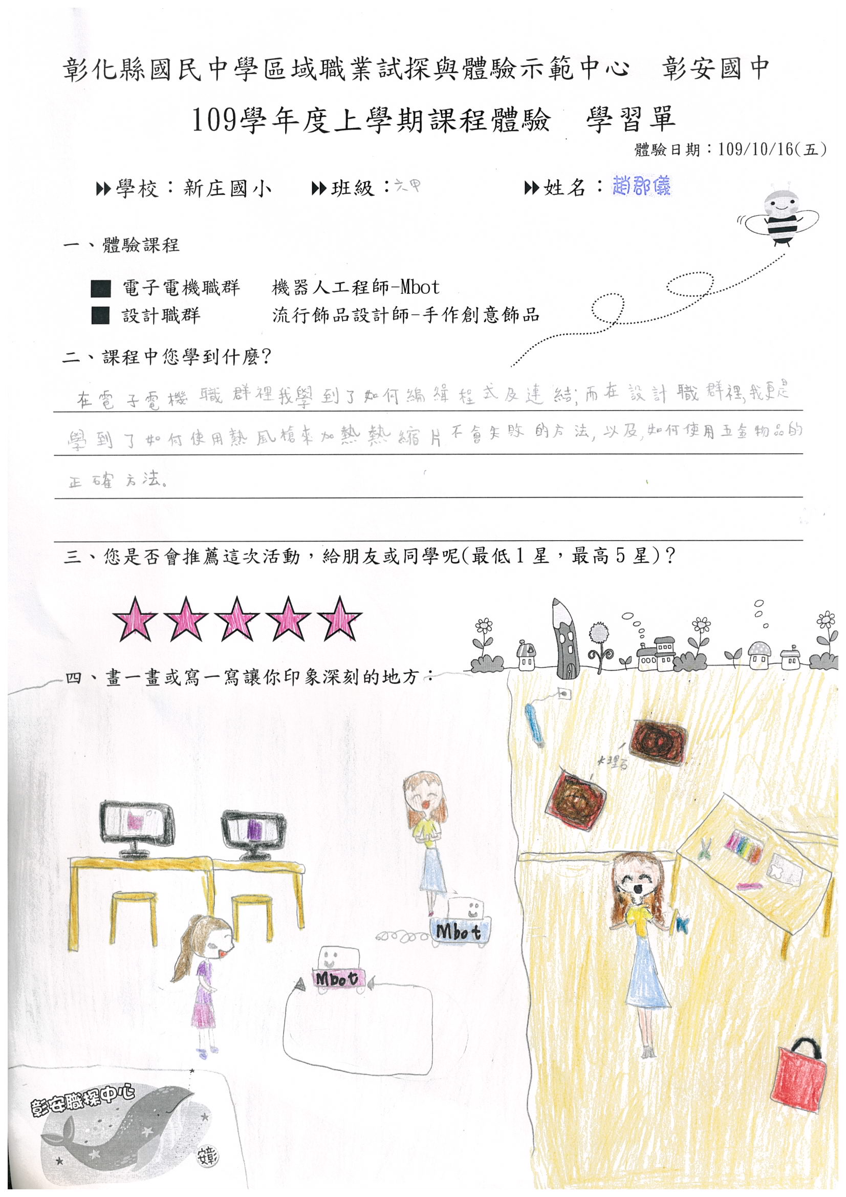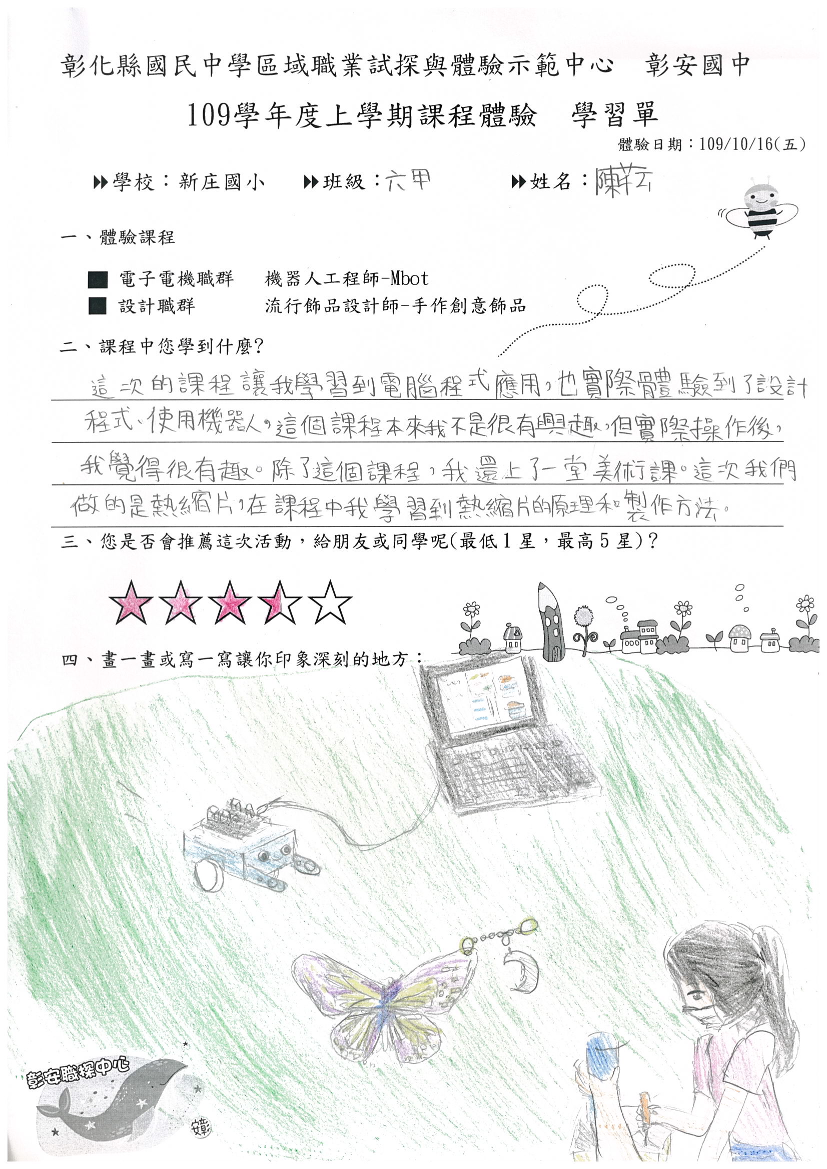 ◎手作的部分是熱縮片,我選擇把美麗的蝴蝶畫在上面,但畫得沒有範本好看啊!機器人工程師-mbot課程中教我們用電腦寫程式,讓車子根據程式指令動來動去,真酷啊!這些課程讓我學到很多事物,謝謝學校讓我有更多機會學習,也謝謝指導我們的那些老師。