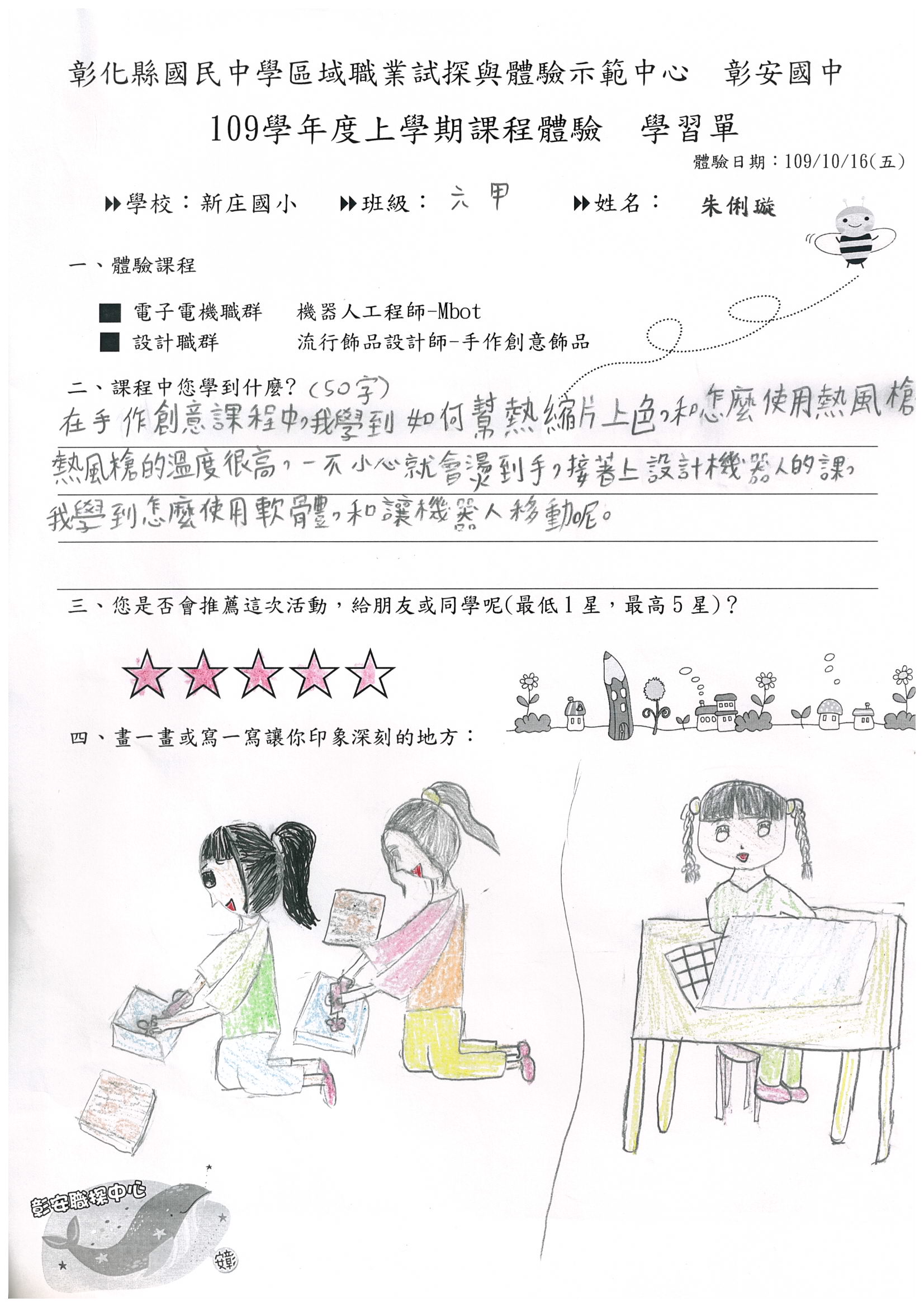 ◎手作飾品老師給我們圖案畫,畫完會先打洞,再用熱風槍吹幾分鐘,就可以吊在鑰匙圈或是髮簪上了,看起來美極了!我們還有設計程式,要讓車子可以自己跑,雖然中間遇到許多小問題,不過,同學和老師都幫我解決了,最後成功讓車子在地上跑,真有成就感!