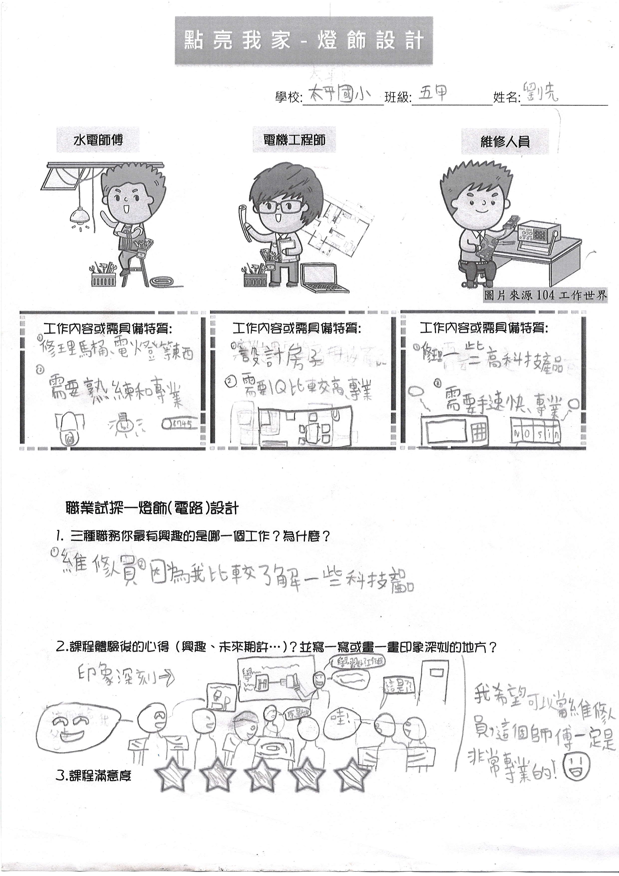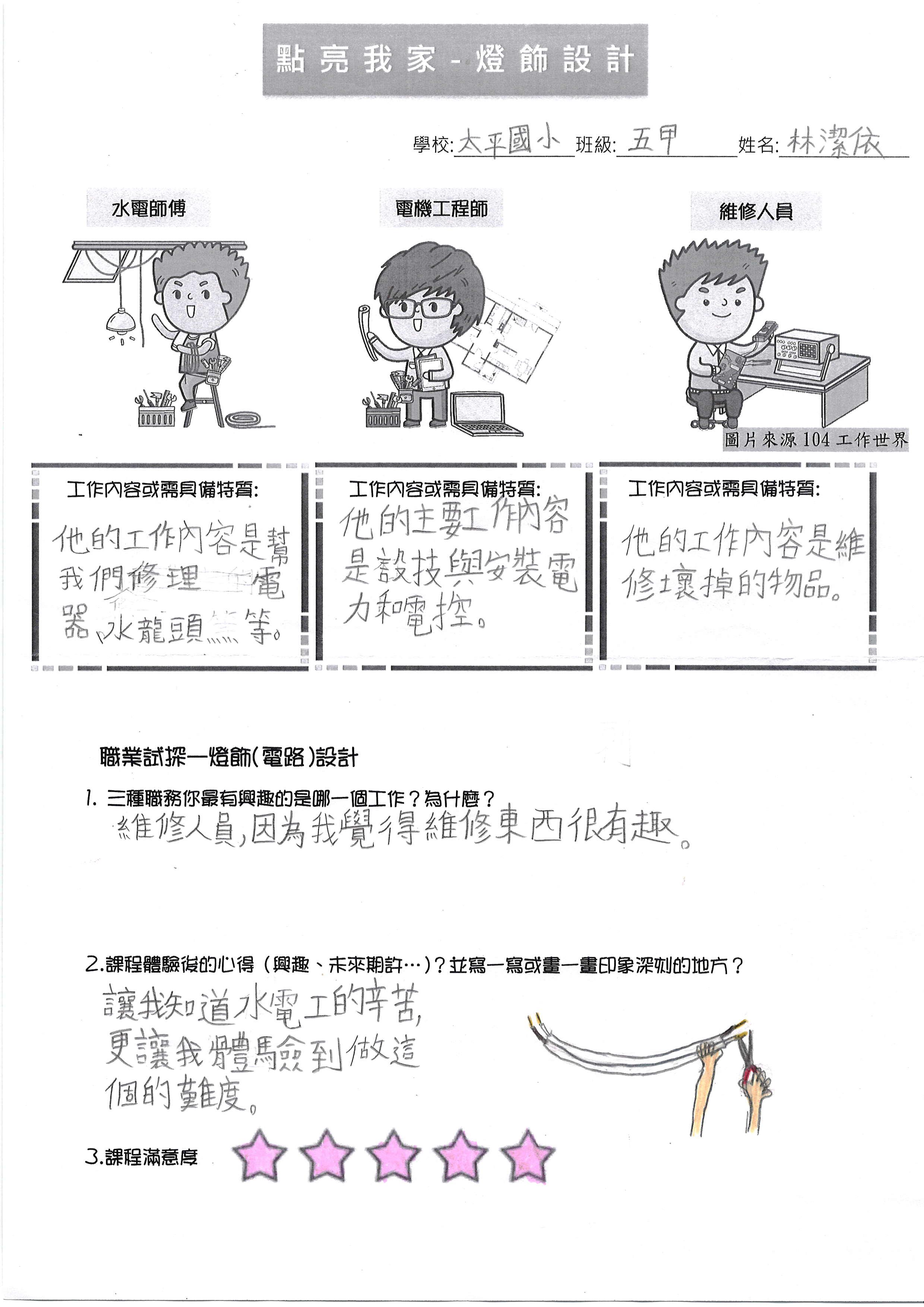 今天參觀「原斗國中的職探體驗課程」,我自己最有興趣的工作是室內設計師,因為可以設計自己的房子內部擺設,可惜今天不是體驗這個課程,希望下次能有機會體驗室內設計師的課程。今天做了實用的延長線,知道怎麼拔線管、怎樣組裝插座等,覺得水電師傅的工作很辛苦、不簡單。