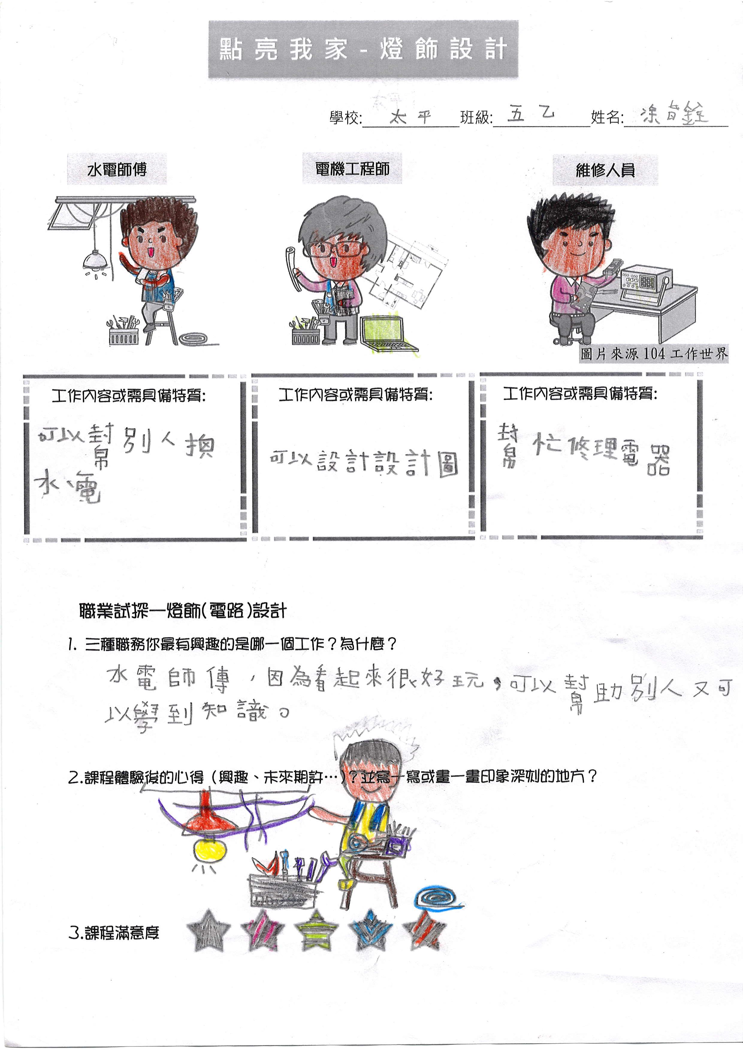 今天參加「點亮我家-燈飾設計」的體驗課程,我覺得水電師傅須具備記性好、手很巧的特質,因為我爺爺也是水電師傅,家中的水電壞了都是由他幫忙維修。透過這次的體驗課程讓我更加明白爺爺工作的內容,更加喜愛、崇拜水電師傅,而且完成的作品也很實用。