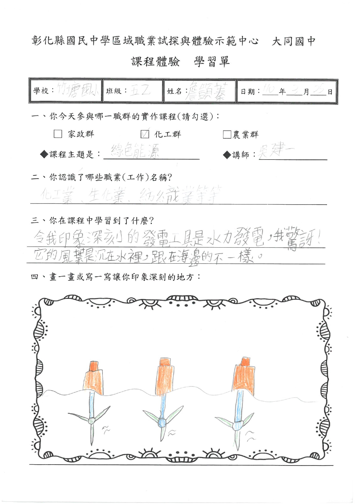 我們竹塘國小五年乙班22位學生暨六年級3位資源班學生,由輔導詹鎮榮主任及五乙級任魏夙俞老師帶領這25位學生,搭乘貫霖通運有限公司司機蕭瑋銘先生遊覽車,參加大同職探中心體驗課程:「綠色能源-綠藻電精靈」;講師吳建一教授深入淺出、精闢解說,以及助教群和職探中心特教助理林雅婉小姐協助實驗下,半日課程很快結束,學員們興趣盎然,從做中學、得到綠色能源類別和用電安全...等基本概念,對於日常節能、節水、節電的重要啟示,小學員們對於此次課程由陌生到熟稔,這是很棒的體驗,對他們的人生學習和職業生涯已然種下小樹苗;職探中心規劃有關國中小的課程,對於未來主人翁具有重大啟迪效益作用,衷心期盼還有機會帶小朋友參加職探中心的體驗課程。