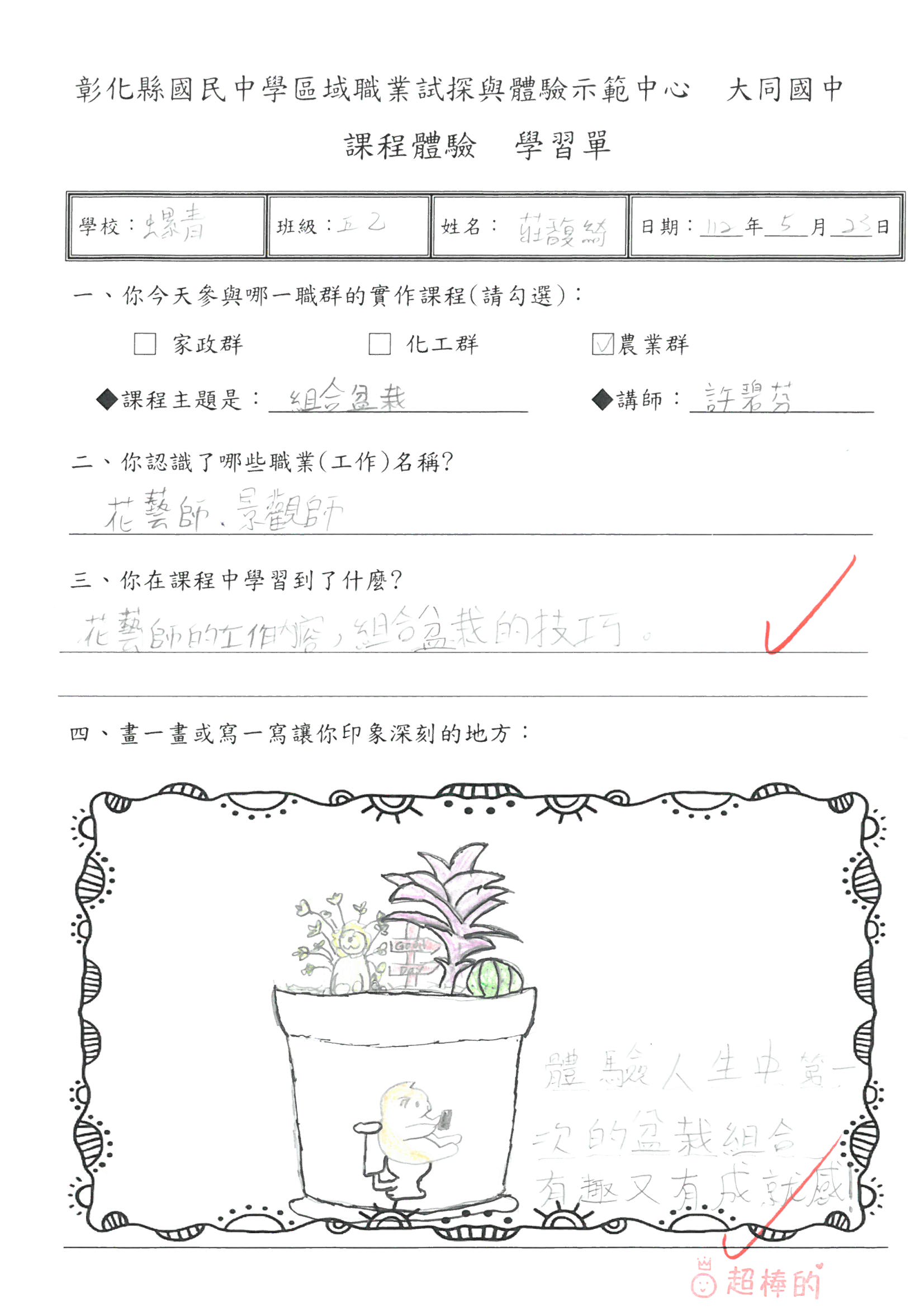 這次職探課程不僅讓我們認識景觀設計師、園藝師、花藝師的工作內容及花卉植物的栽植知識與技巧,也進行了盆栽組合體驗,很有趣也充滿成就感。多種植物組合成可愛的小盆栽,就像生活中加入很多元素,也會變得多采多姿一樣。謝謝大同國中和老師們,今天帶給我們不一樣的體驗與課程。